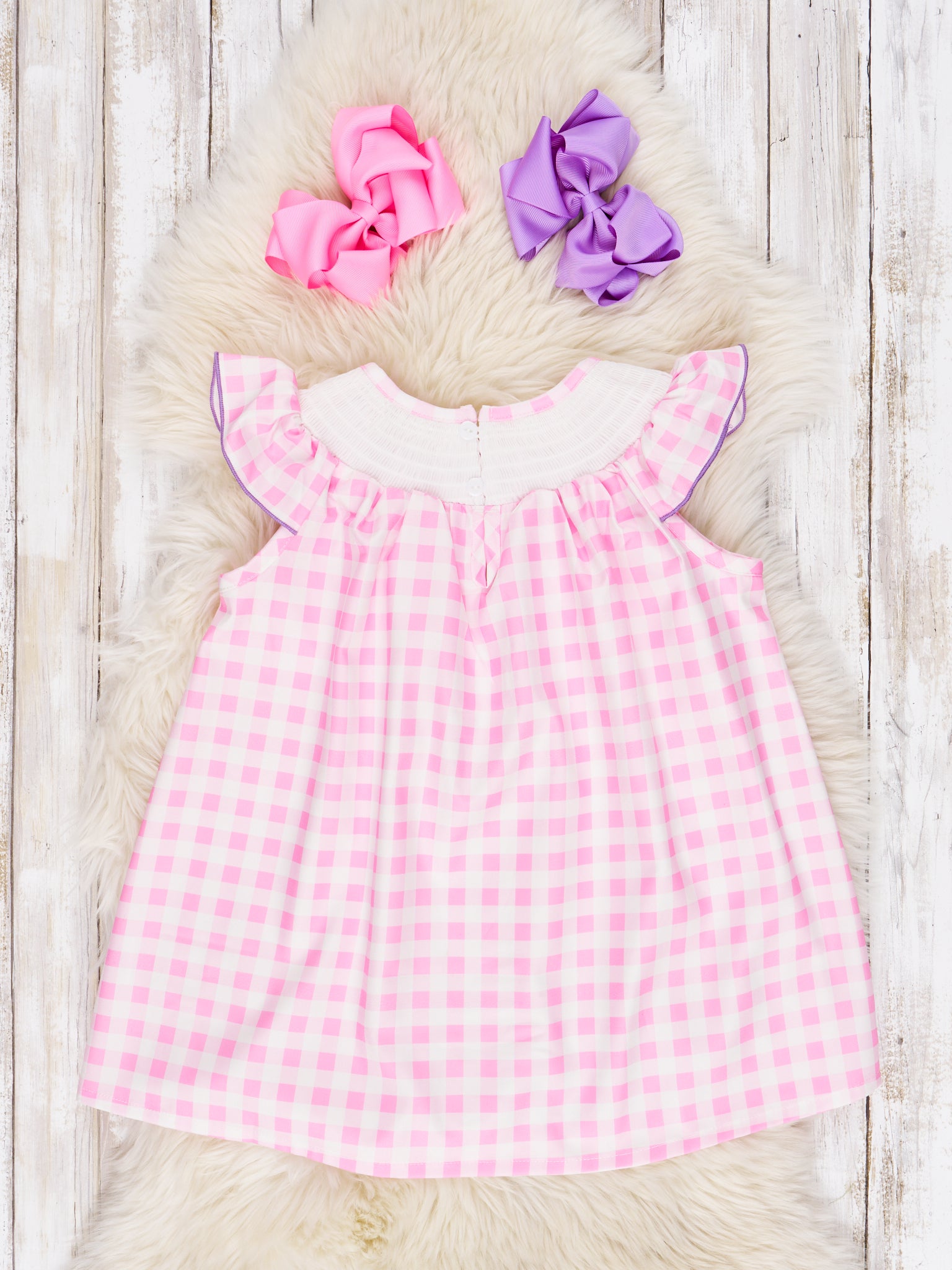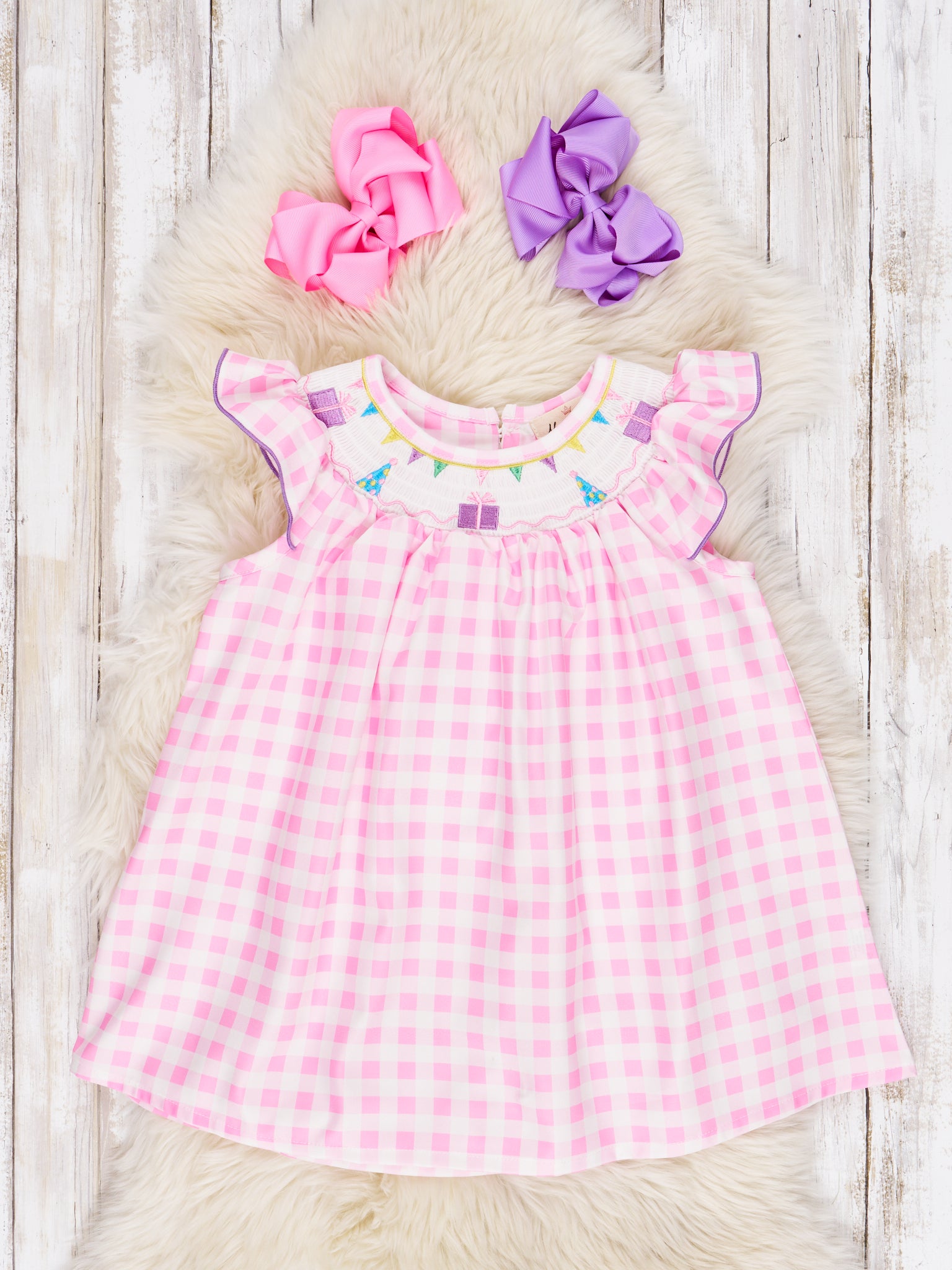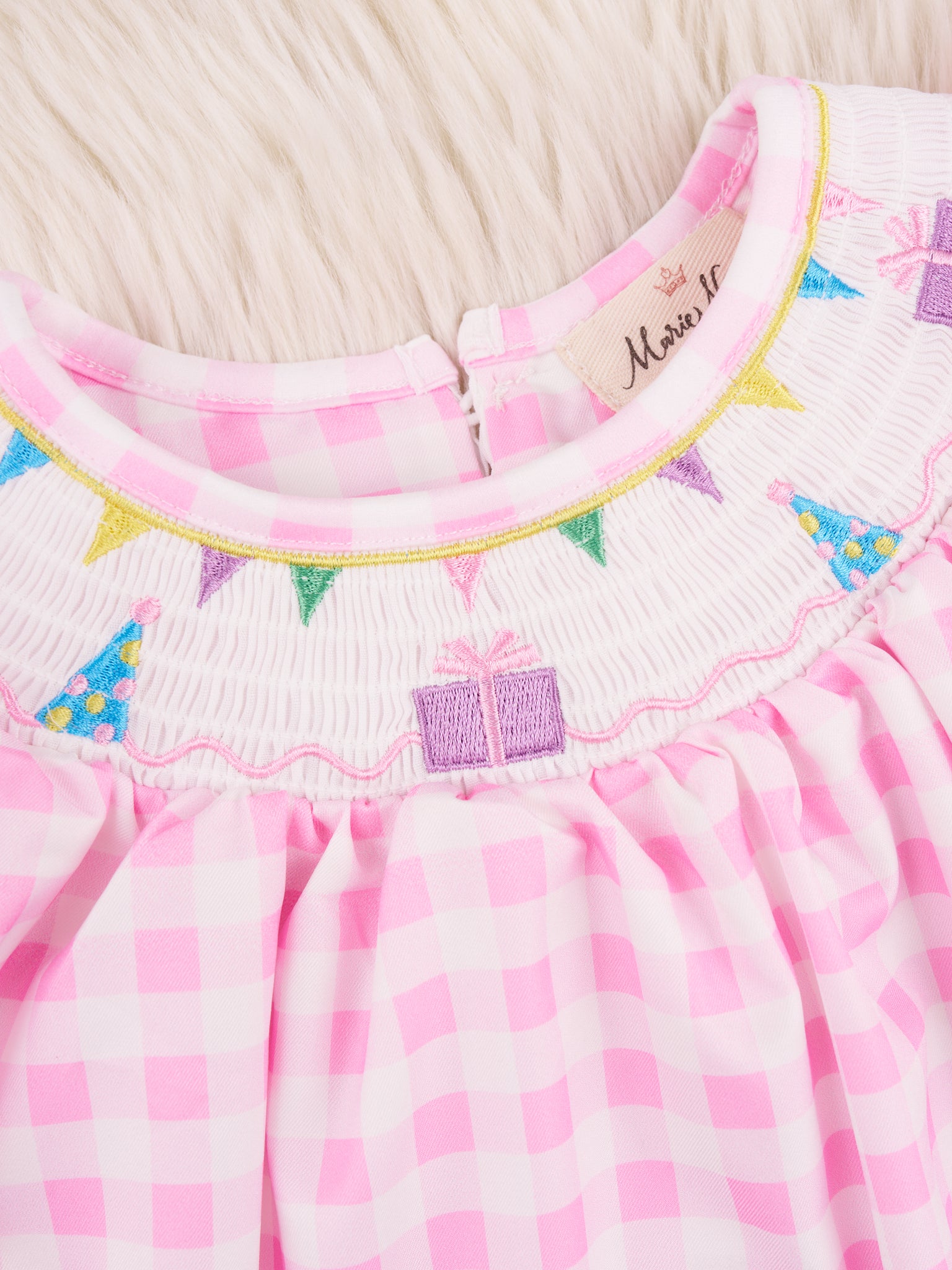 Bring the party wherever you go with this Gingham Smocked Party Dress! It's perfect for any special occasion, with its cheerful pink gingham and adorable smocked details featuring a birthday present and party hat. Celebrate in style! 🎉