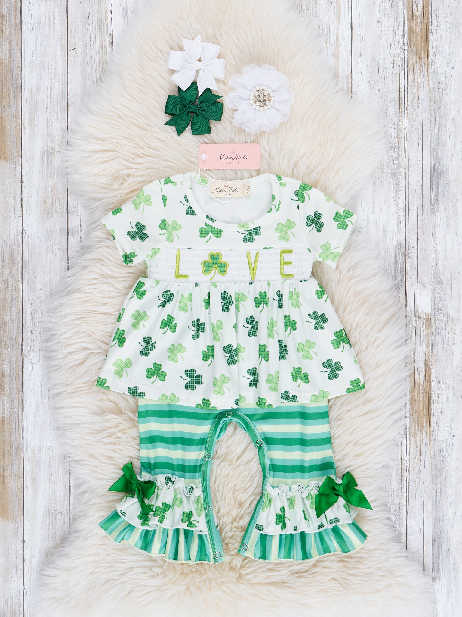 This must-have sister set offers top-notch style for a holiday celebration! Crafted with a white and green smocked shamrock love print and cute ruffle pockets, your kiddos will look festive and oh-so-cute in this St. Patrick's Day outfit!