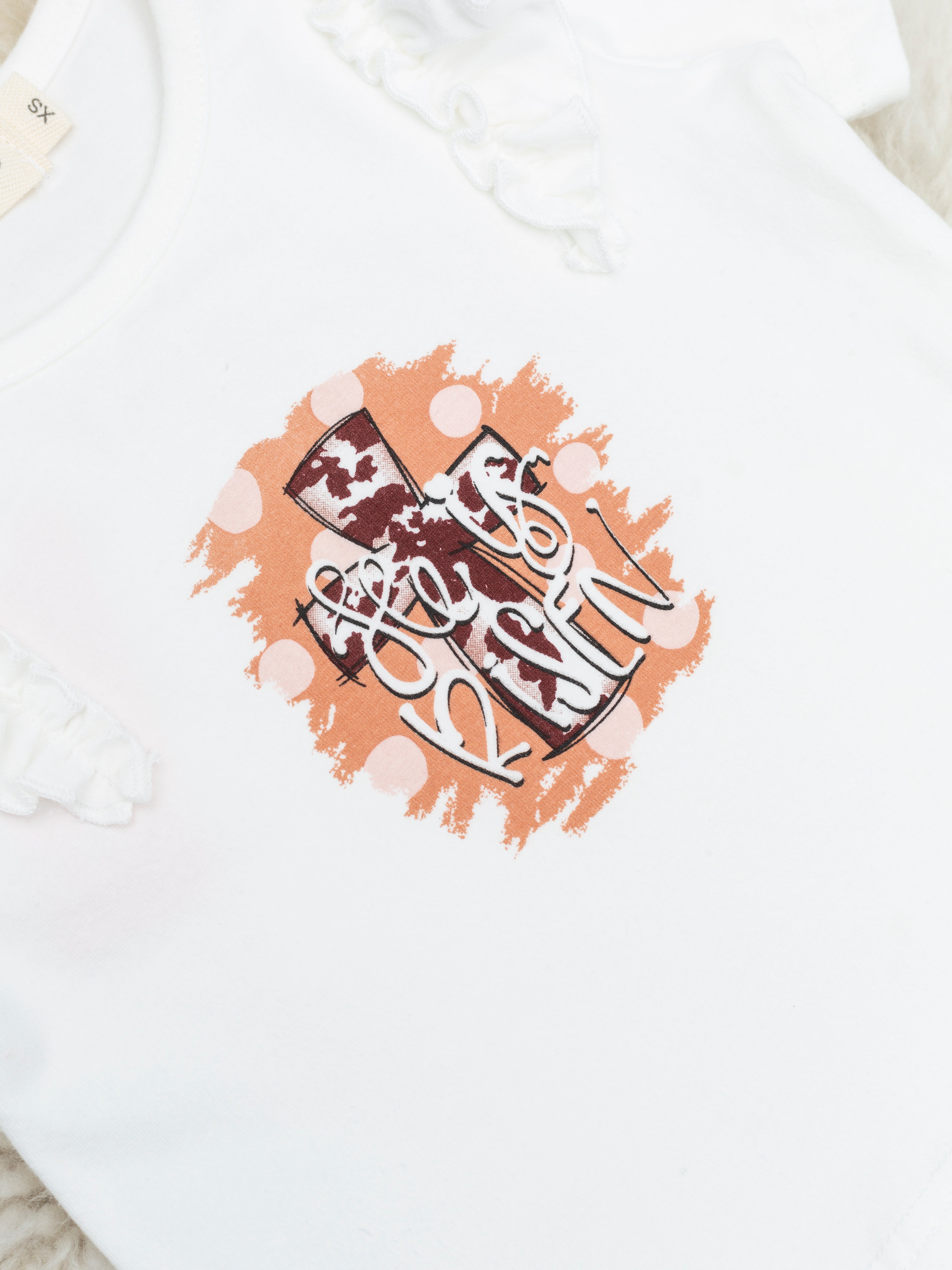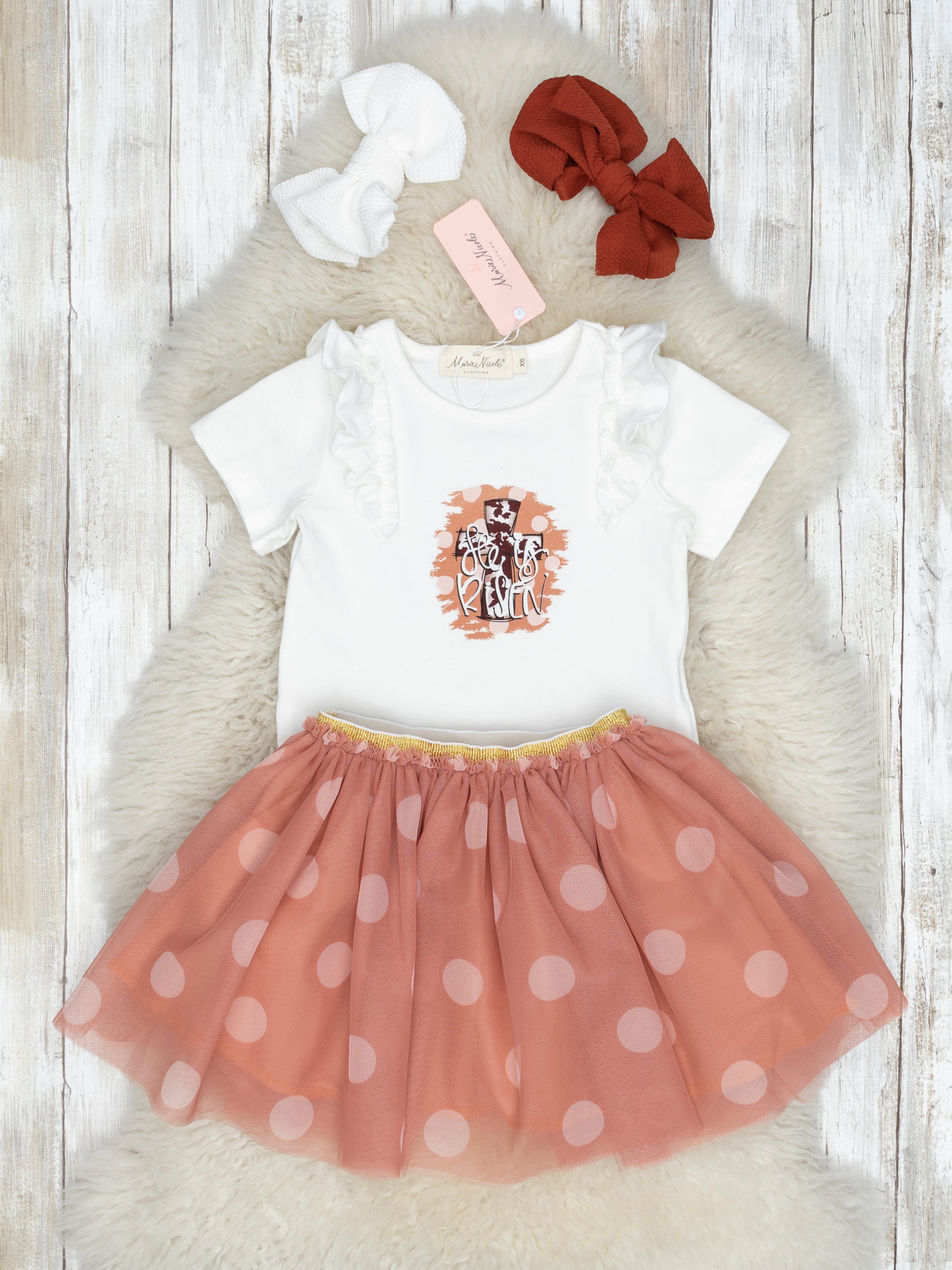 A sweet outfit for your girl this Easter! This outfit features a white top with flutter trim, a darling Cross detail, & a fully lined tulle skirt with polka dots.
