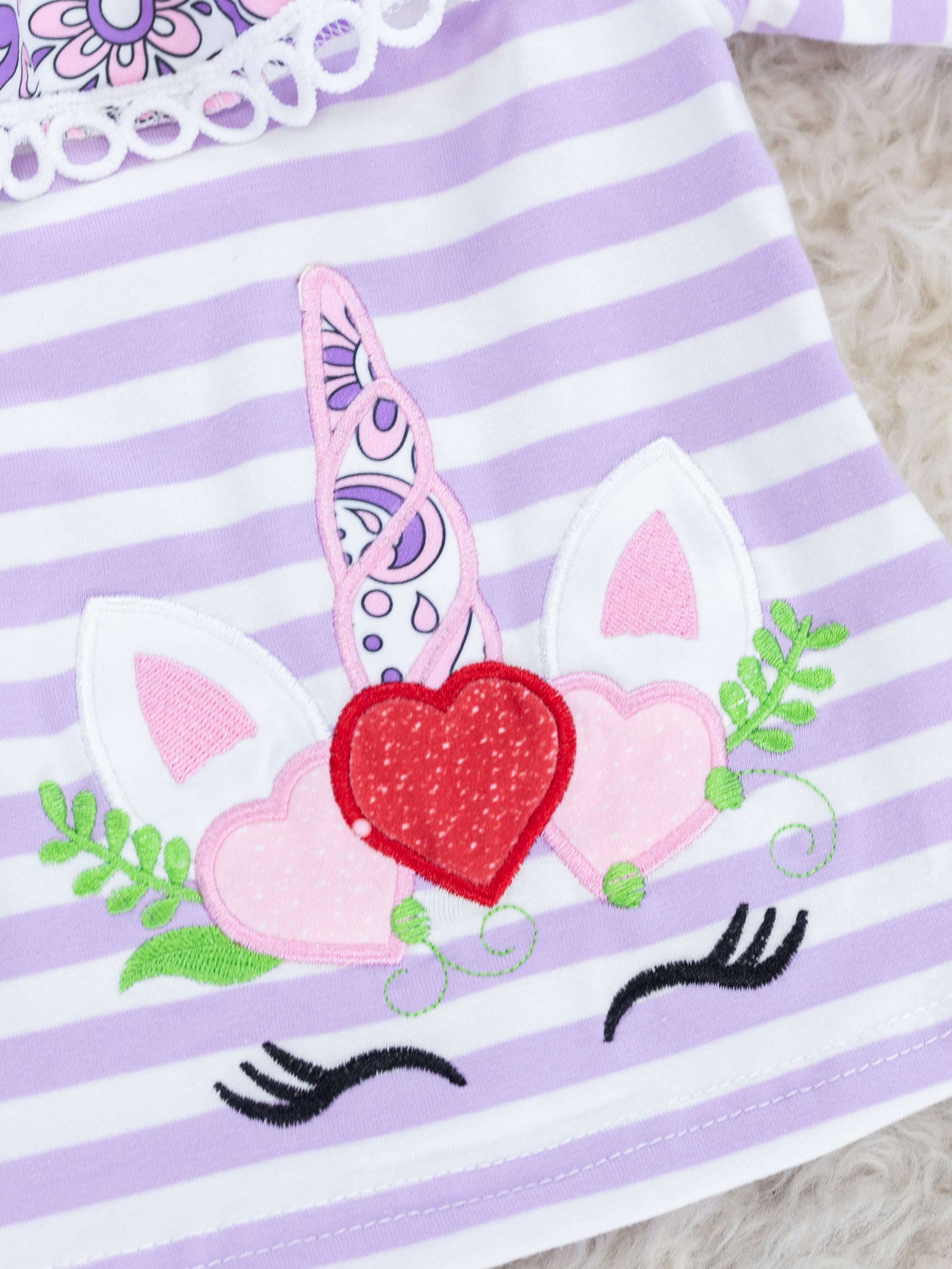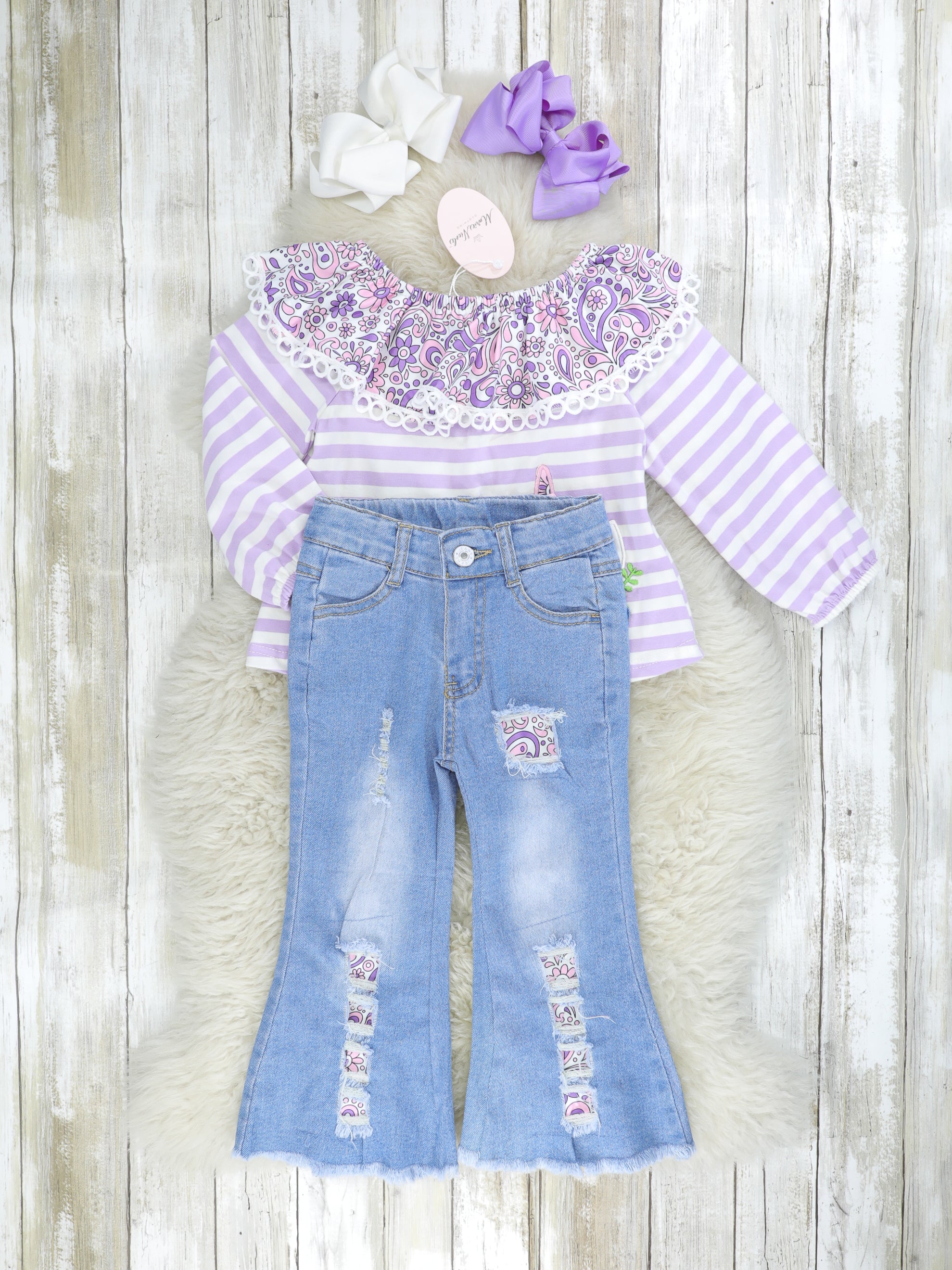 We love this magical outfit & so will your girls! This outfit features a lavender striped on or off the shoulder top with a unicorn appliqué, paisley details, & lace trim as well as distressed denim bell bottoms with matching paisley patches.