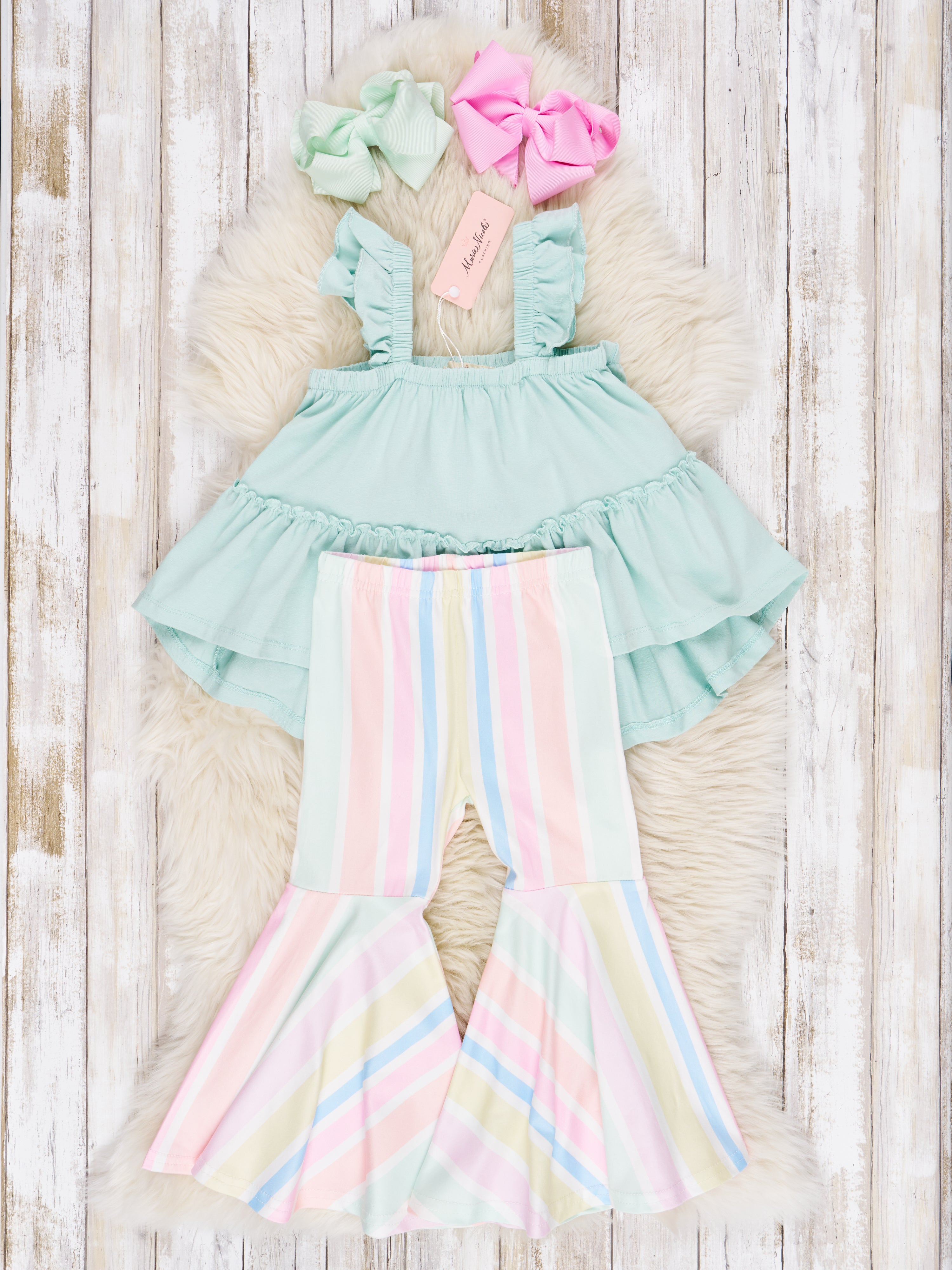 This Mint Tiered Ruffle Tank & Bell Bottoms Outfit is guaranteed to make your kiddo the life of the party! Let 'em show off their style in minty freshness with the tiered tank and cheerful stripes of the bell bottoms, complete with an elastic waist to make it so comfy they'll never want to take it off!