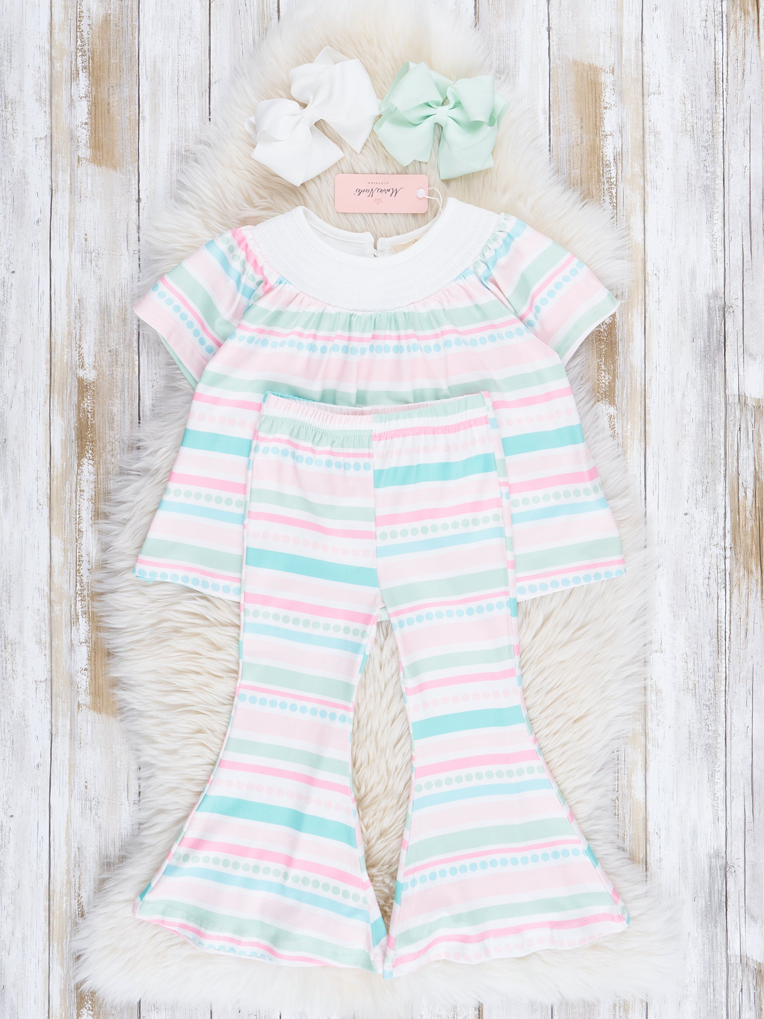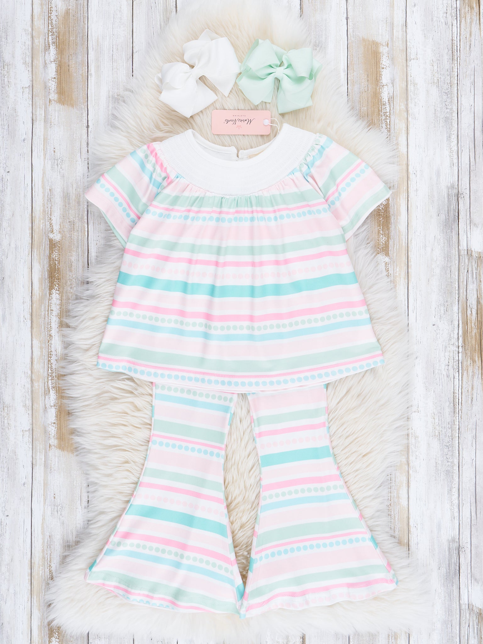 Get ready for some serious spring style with our Pastel Stripes Smocked Outfit! This playful spring pattern features a mix of stripes and dots. Paired with the smocked neckline, it's perfect for your little fashionista. Get ready for a double dose of cuteness with this sister set