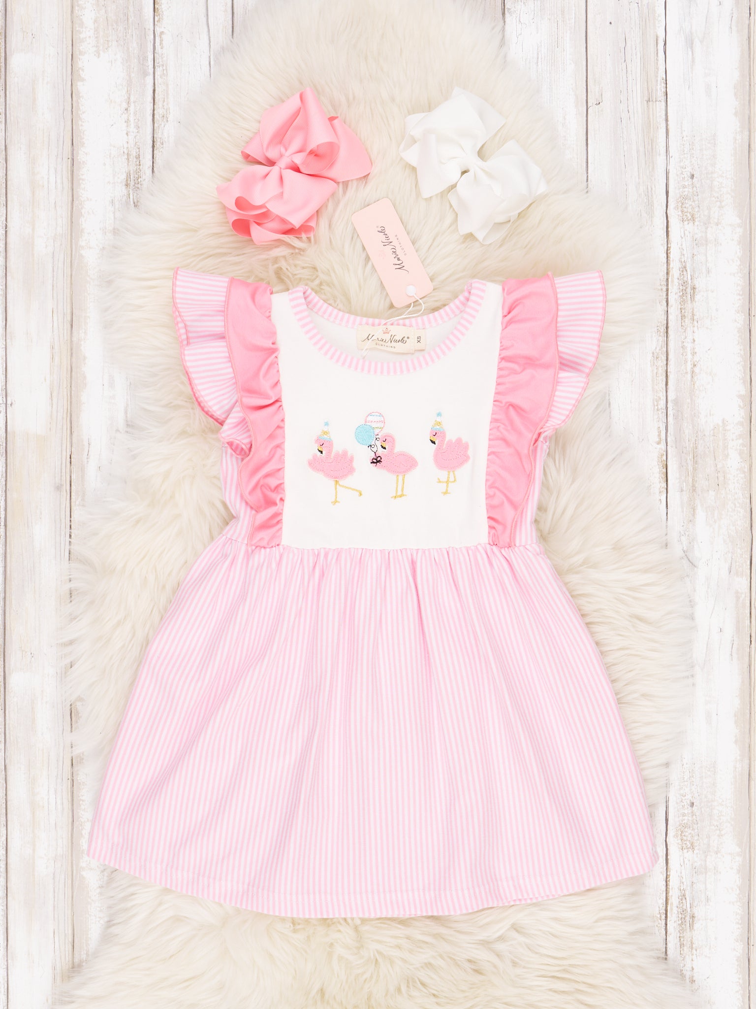 This Pink Pinstripe Flamingo Ruffle Set is perfect for your flaminGALS! This dress features a fabulous flamingo design, pink pinstripe, ruffles, decorative buttons, & embroidered detail.