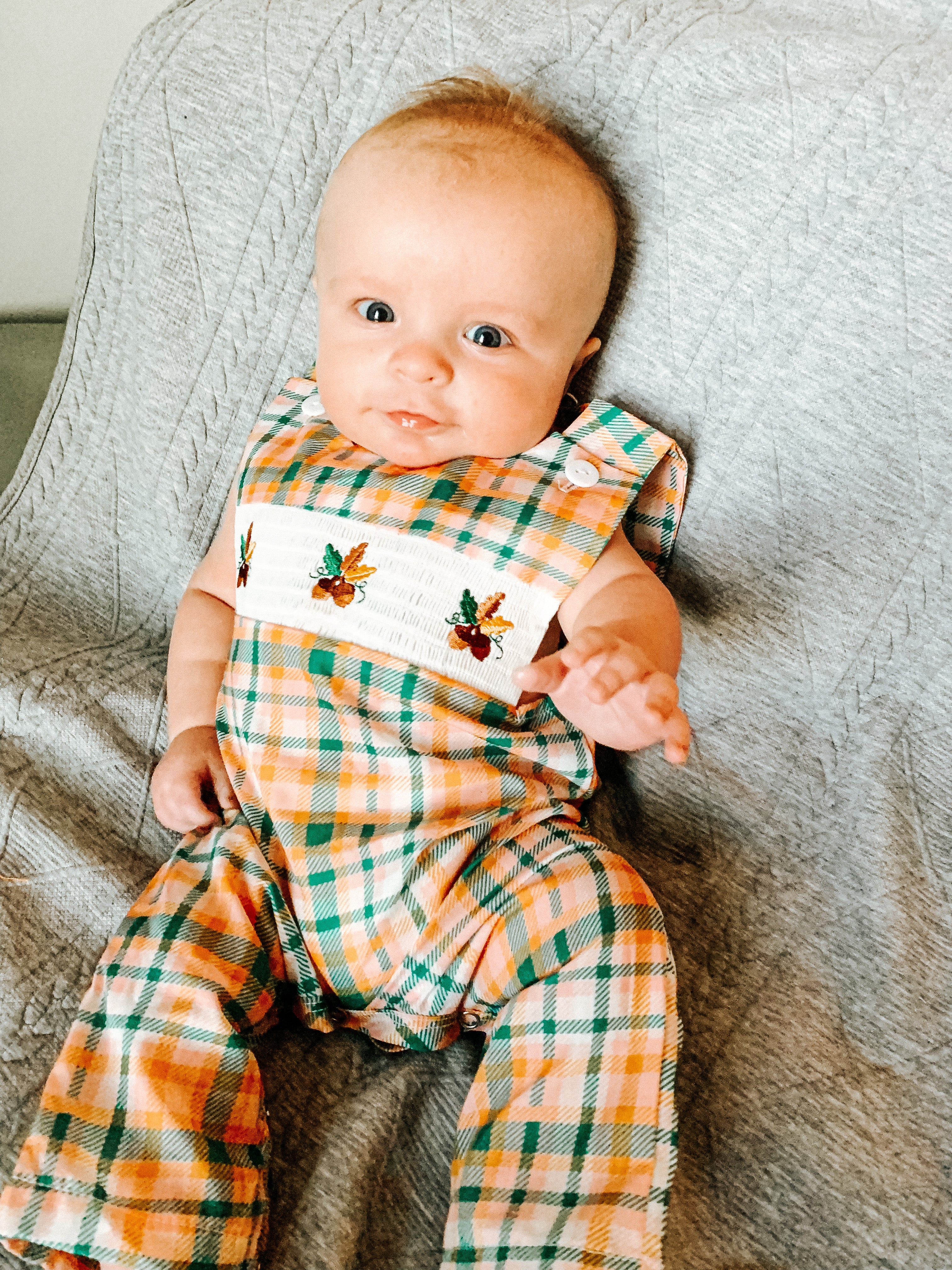 This tasteful acorn set has something for all the Thanksgiving kiddos! This plaid johnny features a smocking, embroidered acorns, & functional buttons on the shoulders for easy changing!