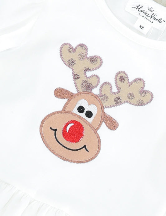 Don't fear, this darling outfit is perfect for your little reindeer! This outfit features a white top with adorable reindeer detail, ruffle trim, & reindeer bell bottoms.