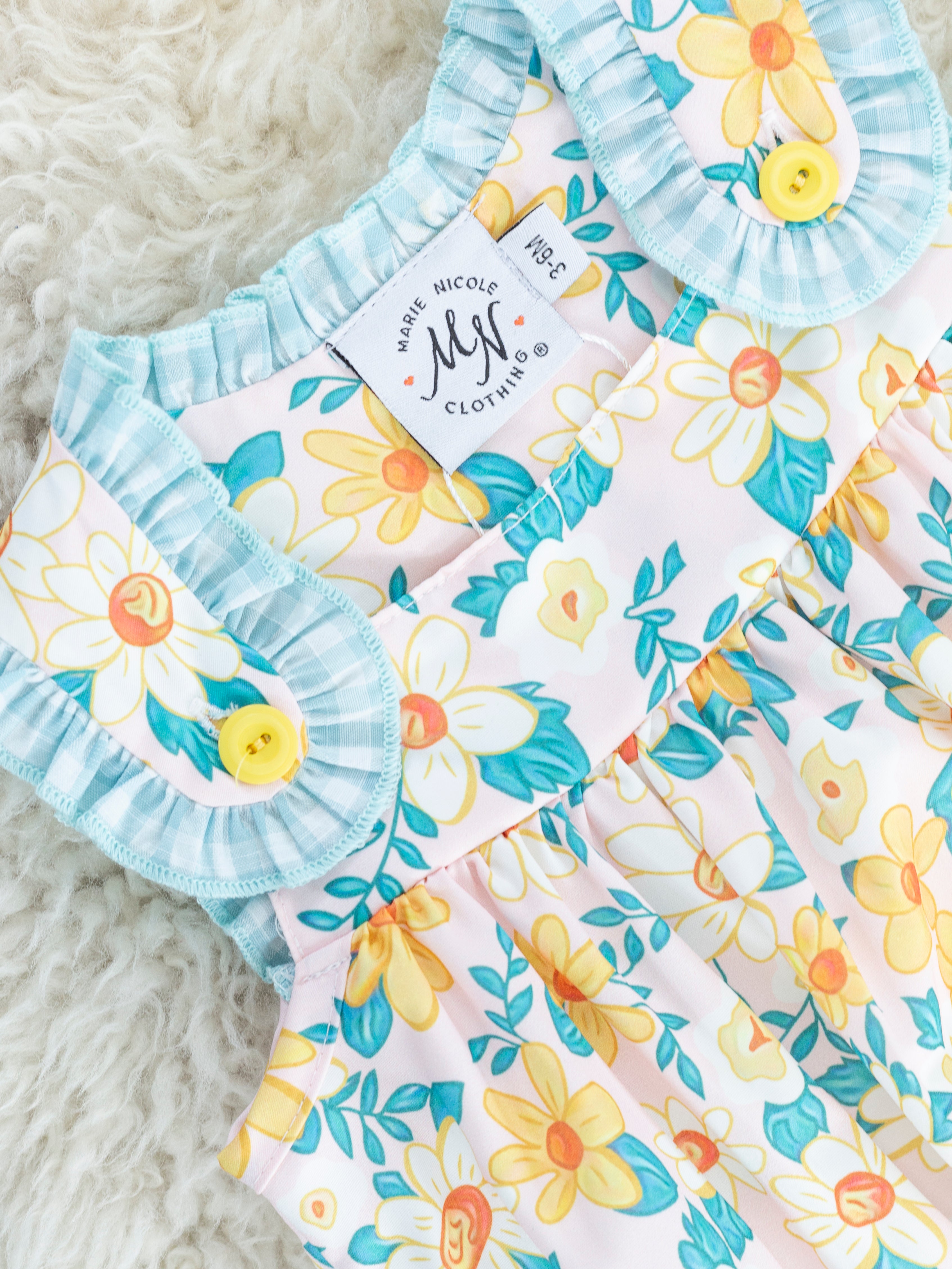This precious sister set is the perfect addition to your girls closet! This bubble features daisies, gingham ruffle trim, & functioning buttons on the straps.