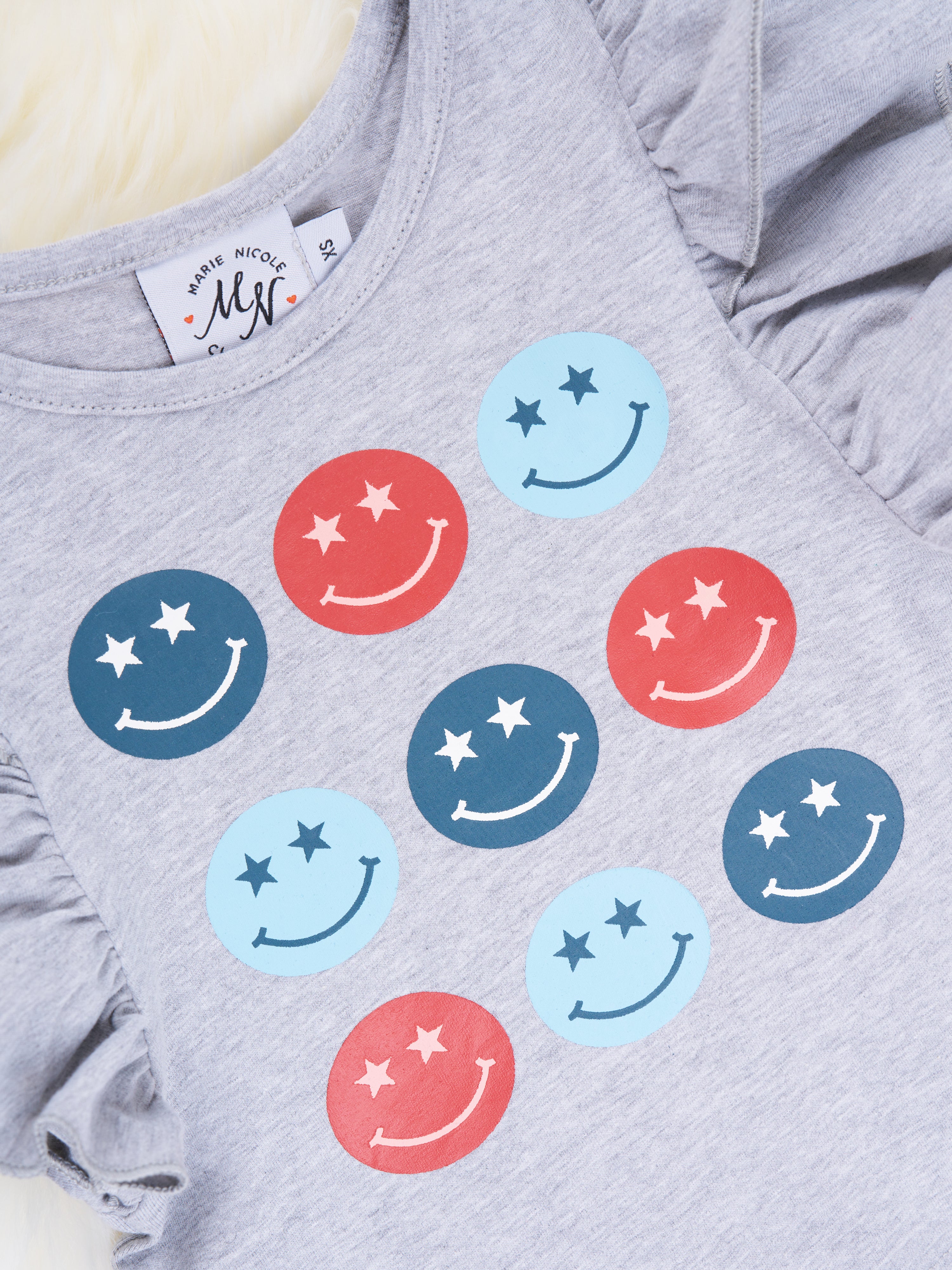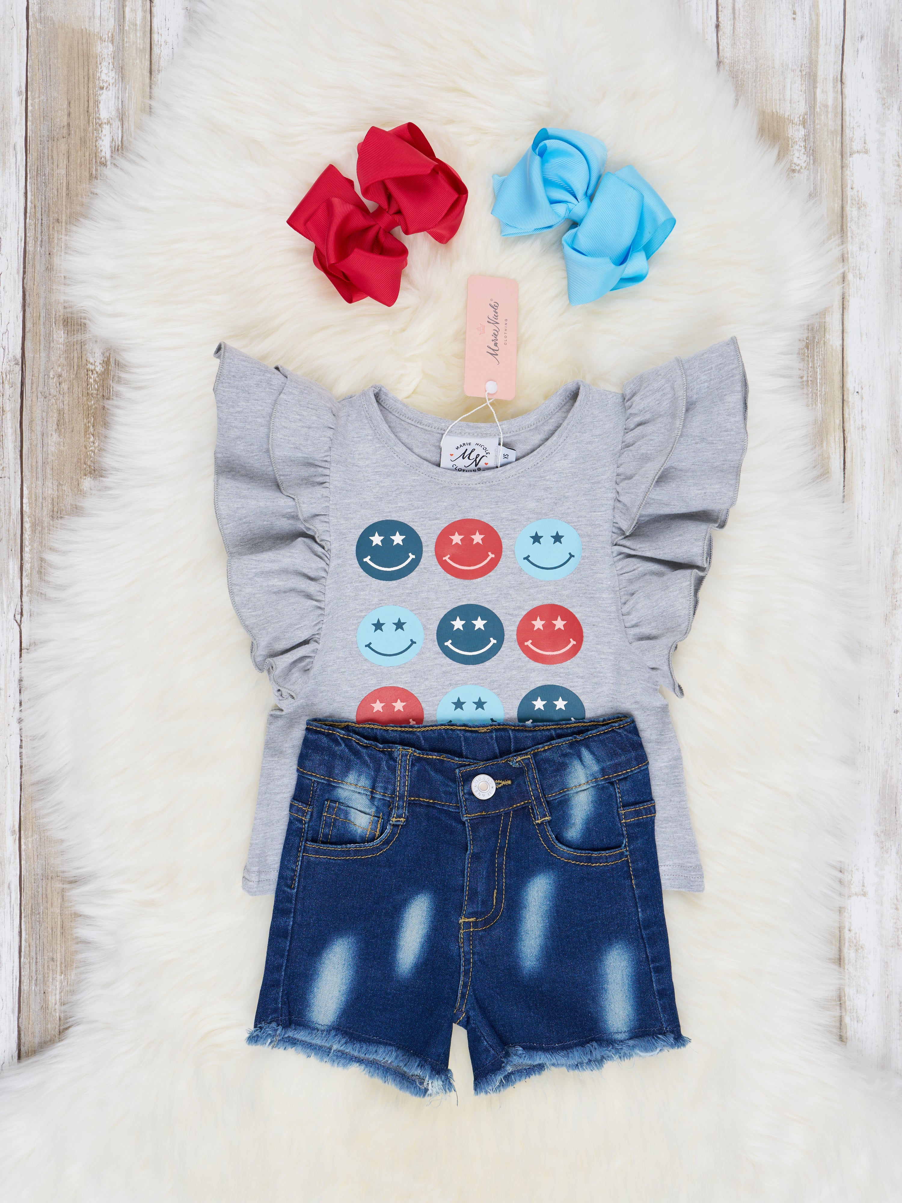 Let your little one shine as bright as the sun in this adorably cute Smiley Ruffle Denim Outfit! Featuring a grey ruffle top with sunny smiley details and denim shorts to match, they'll be bouncing in joy! Ready, set, ruffle!