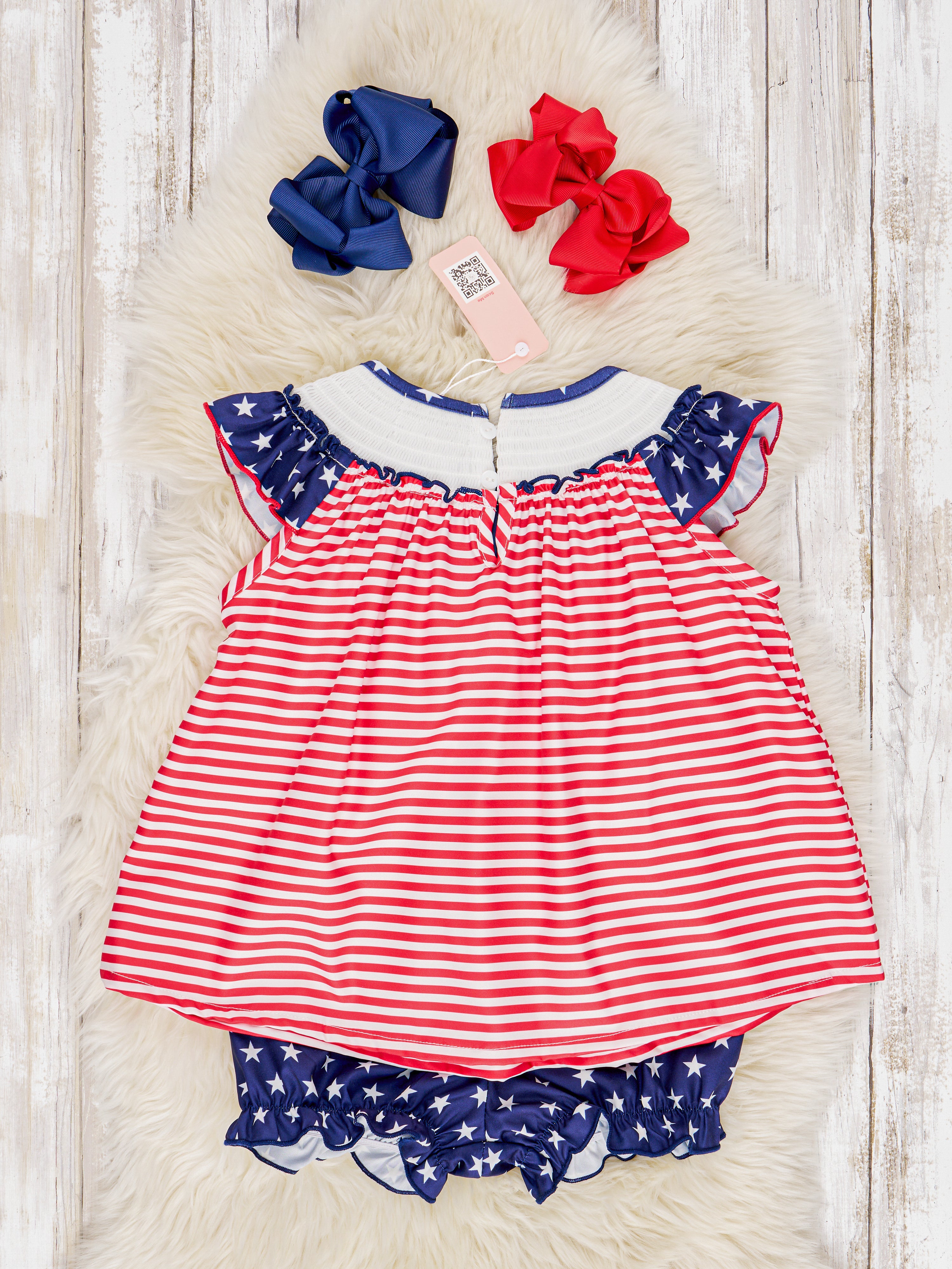 Celebrate the red, white and blue in style with this ultra-cute Smocked Patriotic Anchor Sibling SetThis sweet set features smocked embroidered anchors, perfect for parading around on the Fourth of July! Show your patriotic pride in a pinch!