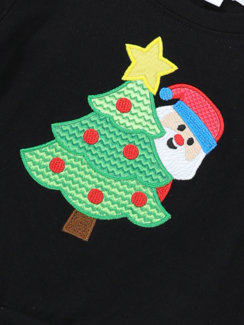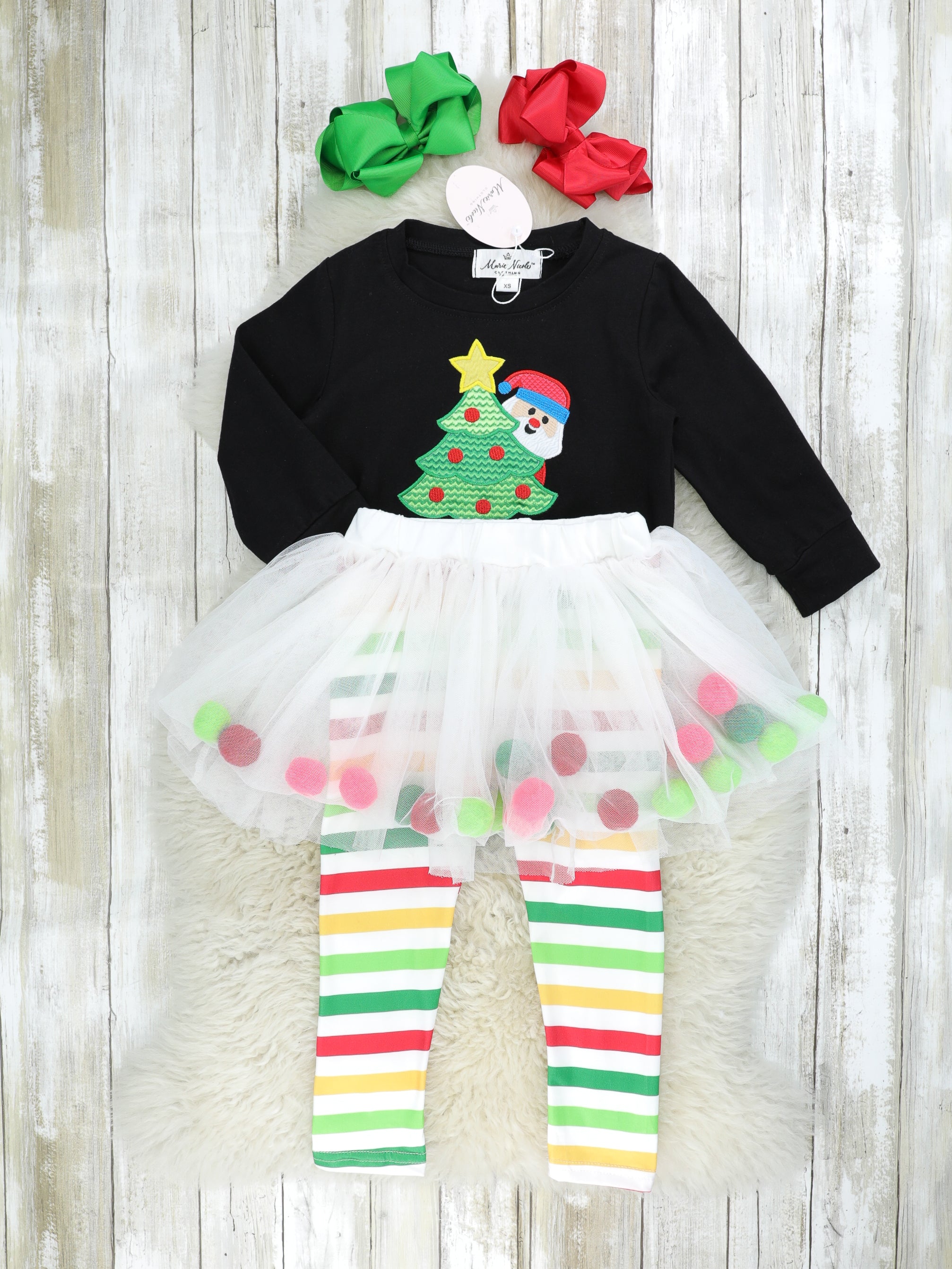 This gorgeous outfit is just TULLE CUTE! This outfit features a black top with a festive Christmas tree & Santa appliqué. The striped leggings feature a tulle skirt with pom pom details & an elastic waistband.