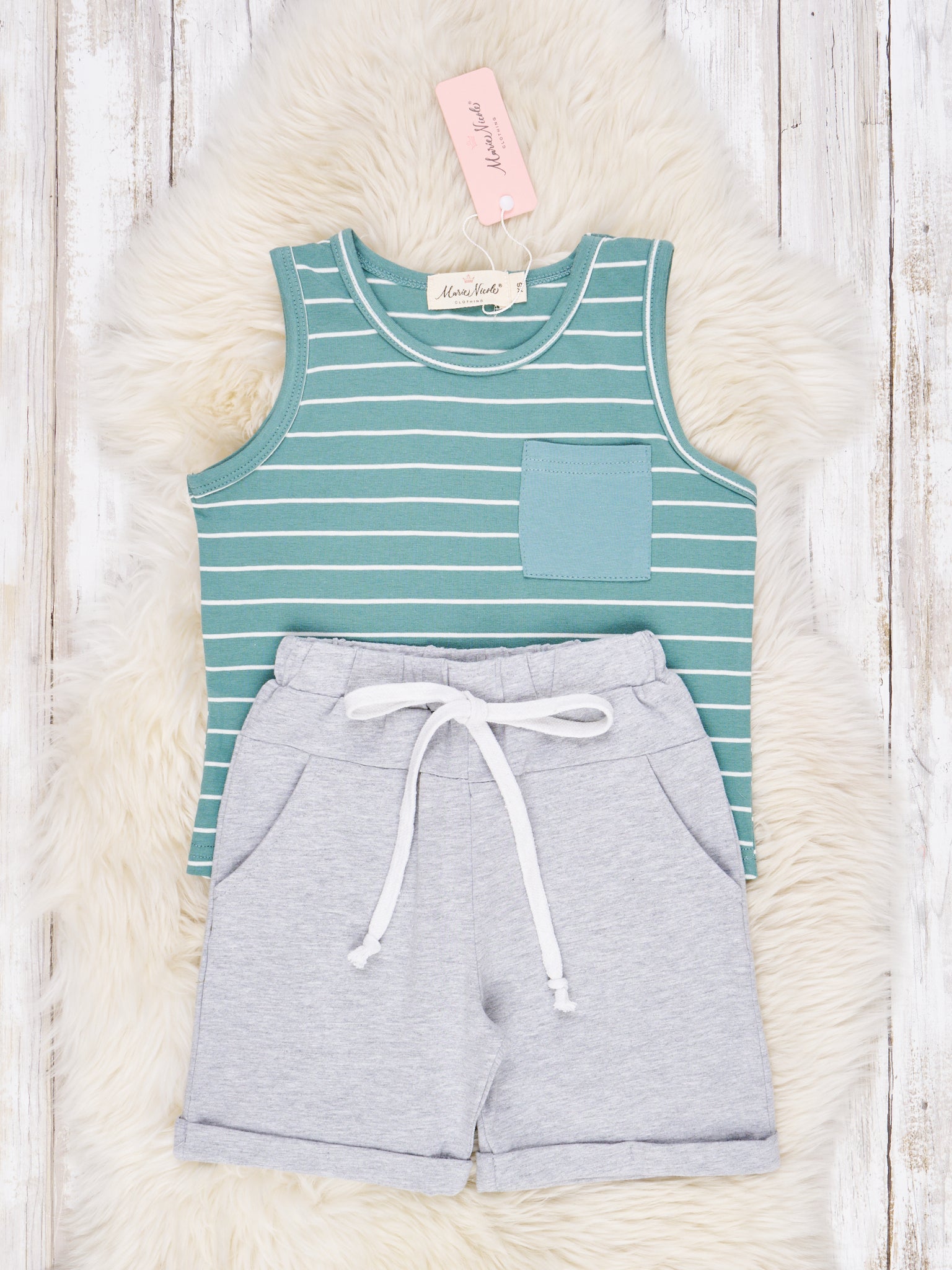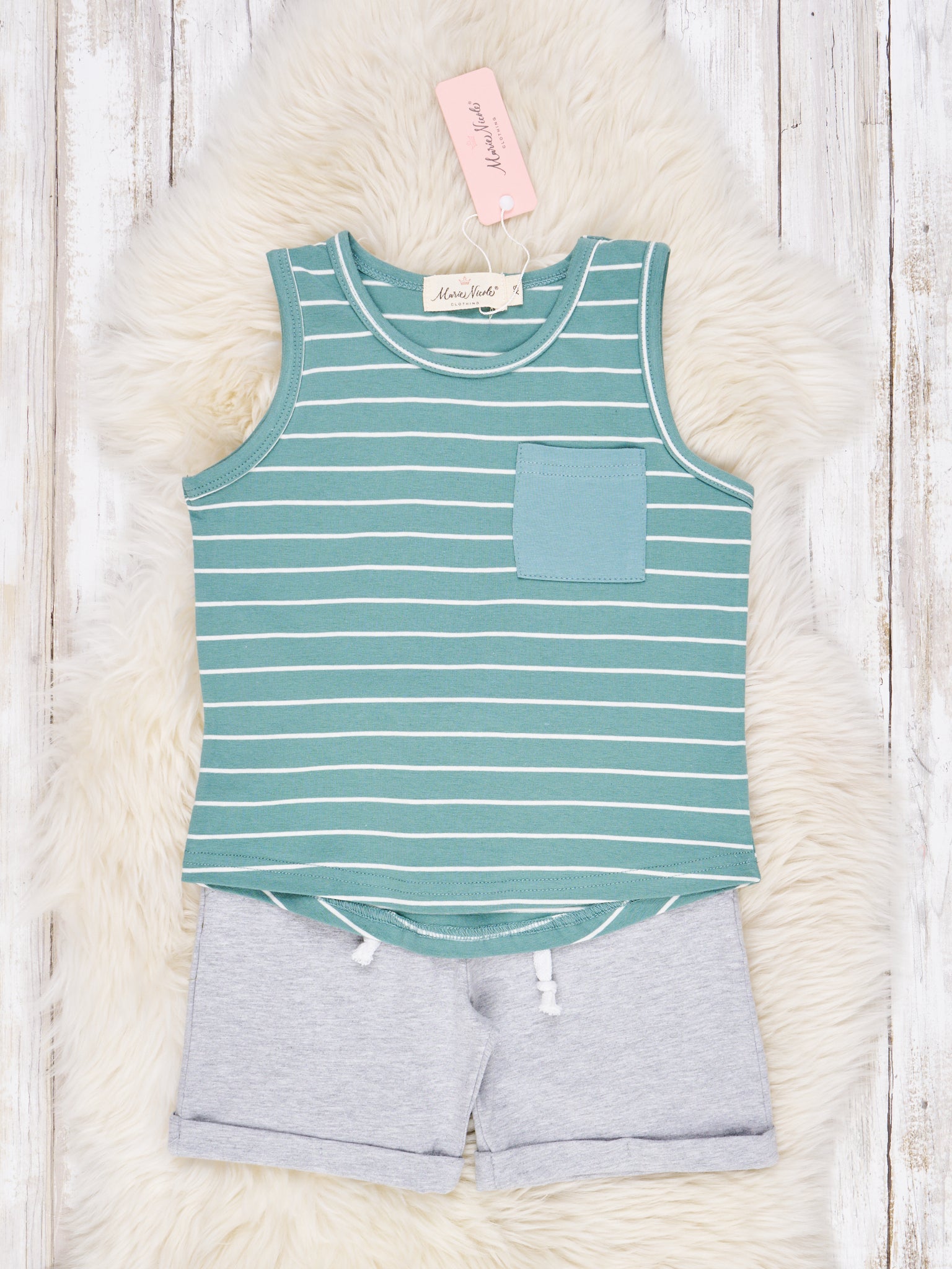 Let your little one hop, skip, and jump in comfort and style with this adorably striped tank and grey shorts outfit! Featuring a pocket for trinkets and other treasures, an elastic waistband for extra flexibility, and a fun, classic stripe print - this is one outfit that definitely checks all the boxes!