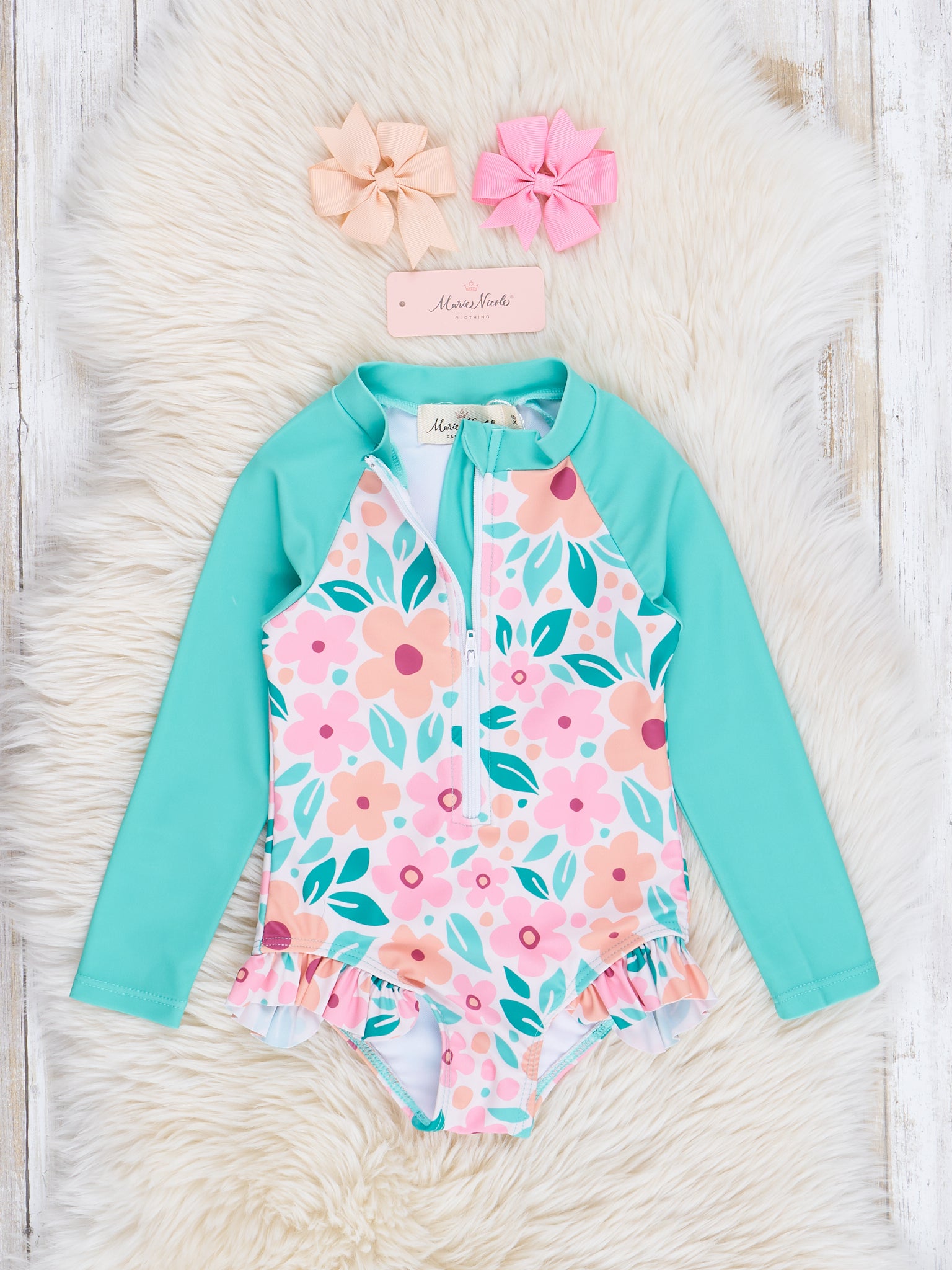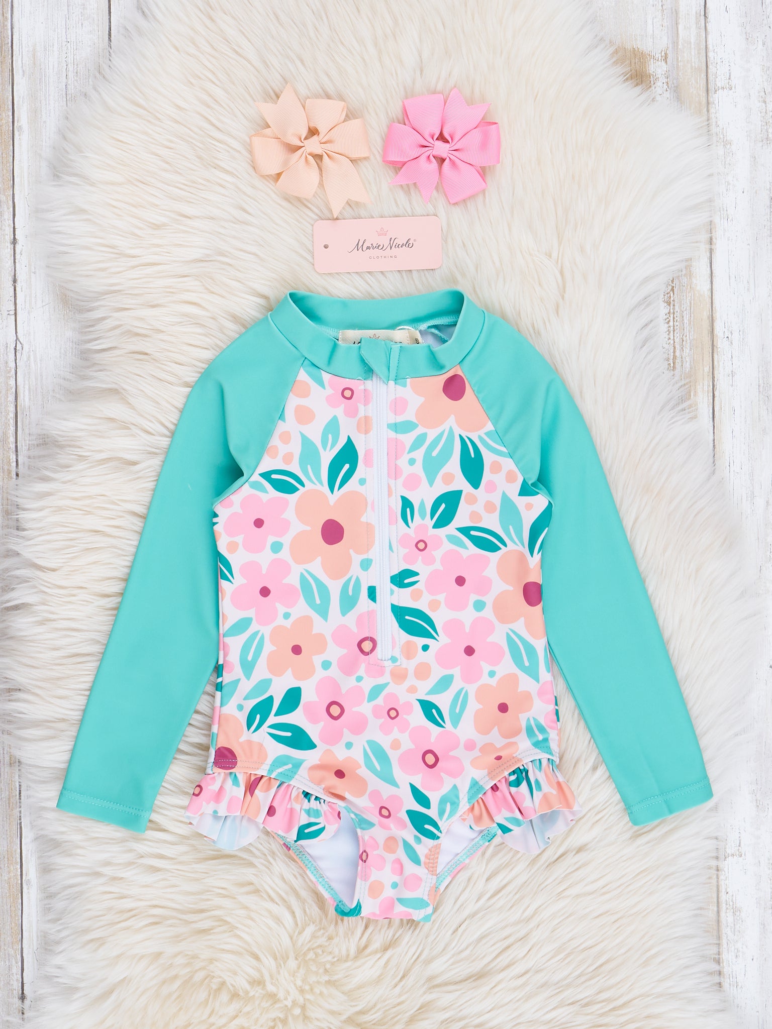Get ready for some cute and fun in the sun with our Turquoise & Pink Tropical Blooms Ruffle Rashguard! Featuring beautiful tropical florals and a stylish turquoise raglan sleeve design, this rashguard not only provides sun protection, but also adds a touch of tropical charm to your beach days.