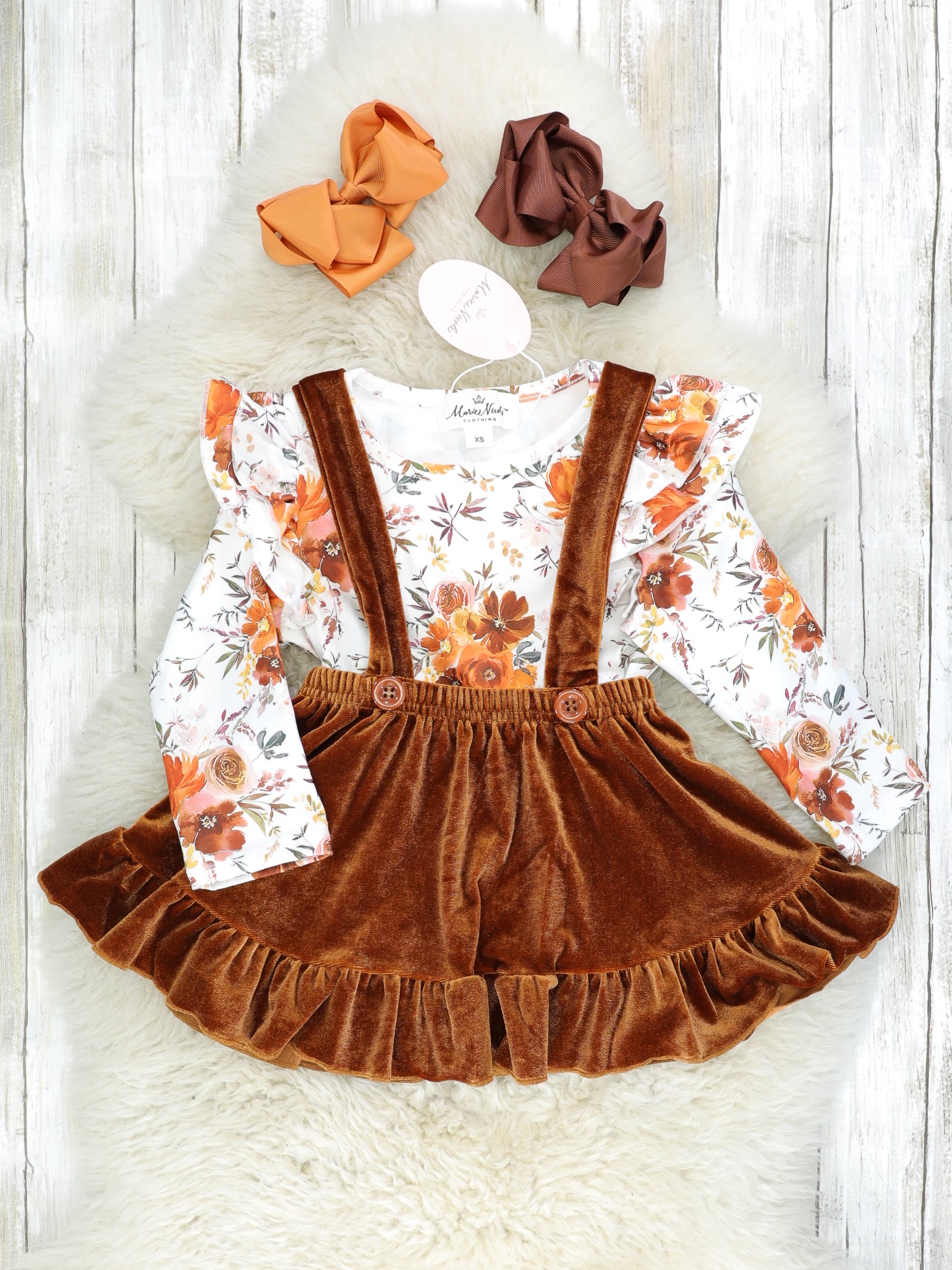Autumn Floral Ruffle Top & Velvet Suspender Skirt Set