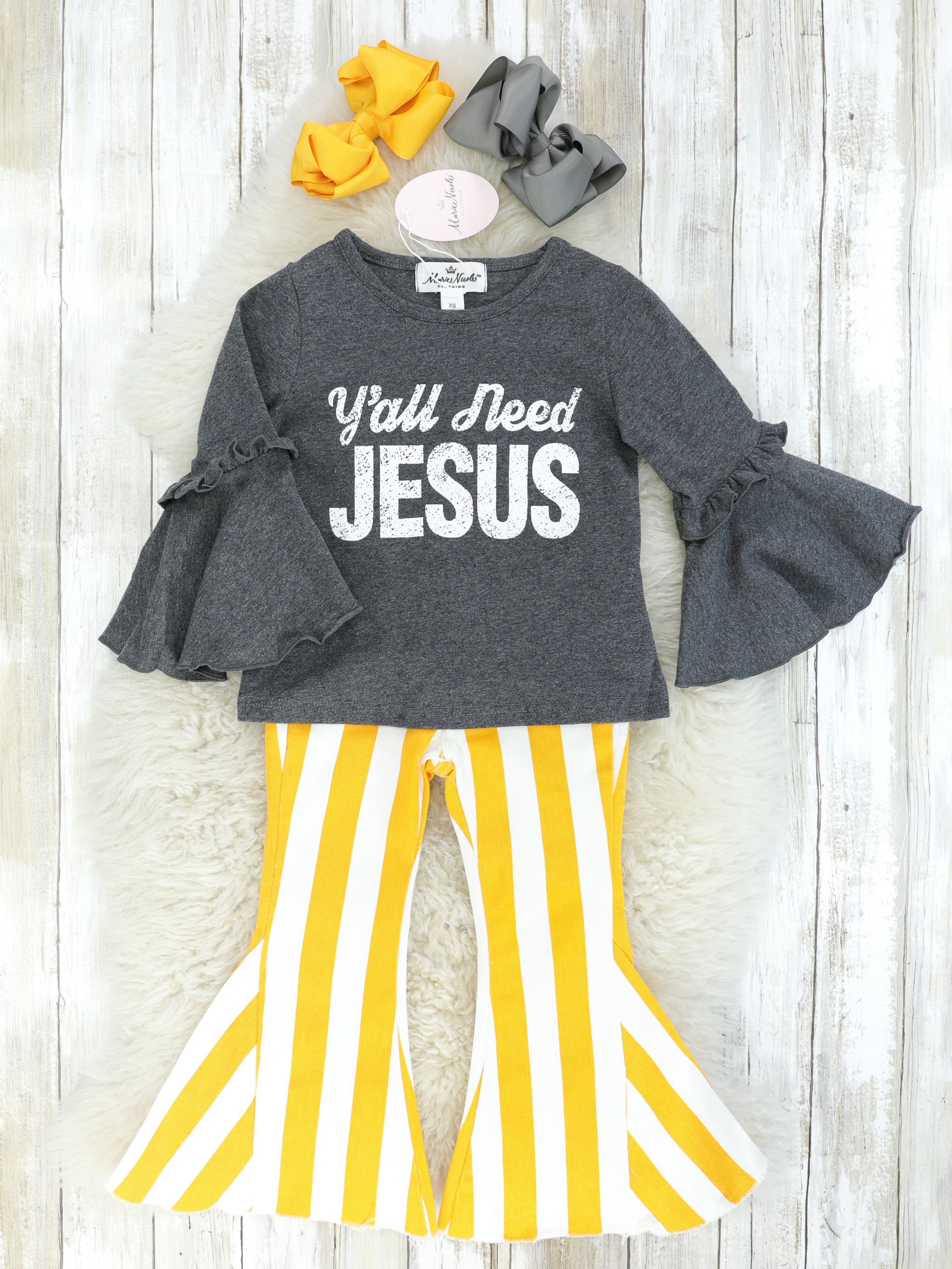 "Y'all Need Jesus" Ruffle Top & Yellow Striped Bell Bottoms Outfit