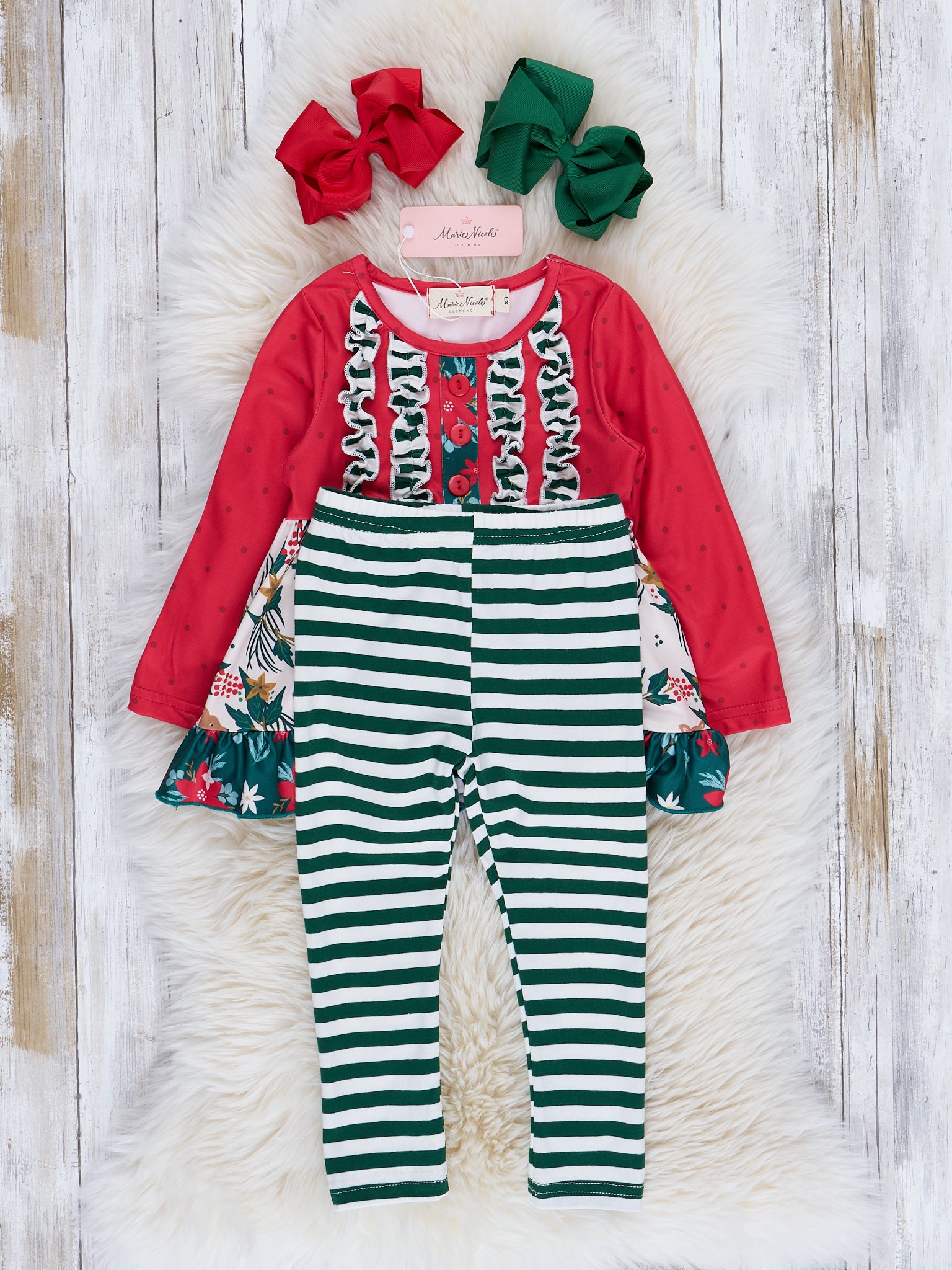 Red Stripes & Green Ruffles Embroidered Holiday Outfit