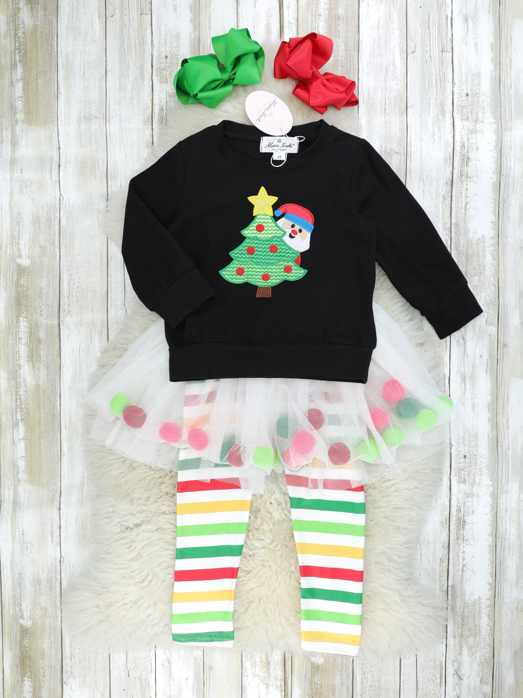 Striped Christmas Tree Tulle Pom Pom Outfit