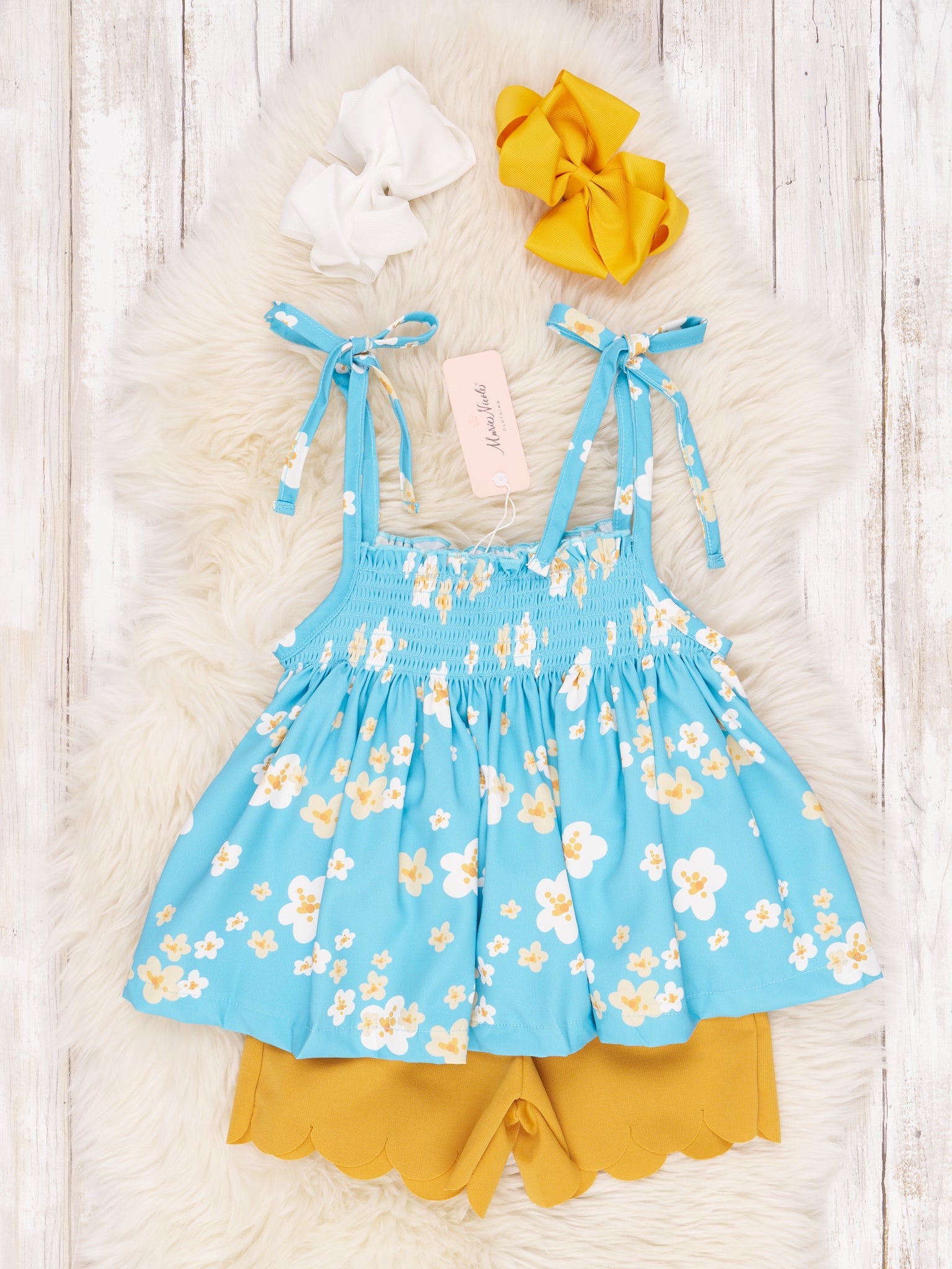 Teal Tiered Daisy Tank & Yellow Shorts Outfit