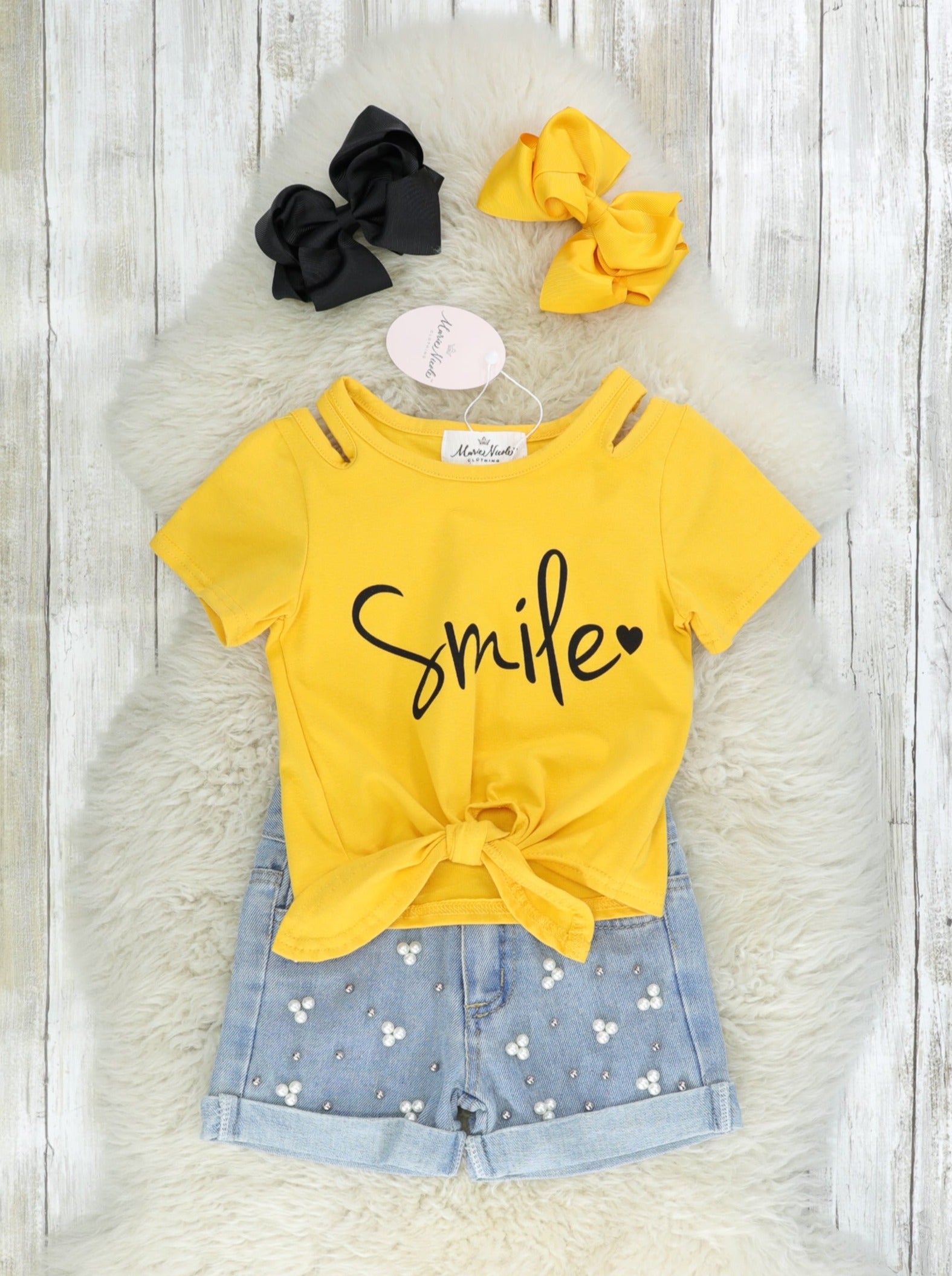 Yellow "Smile" Tie Top & Denim Shorts Outfit
