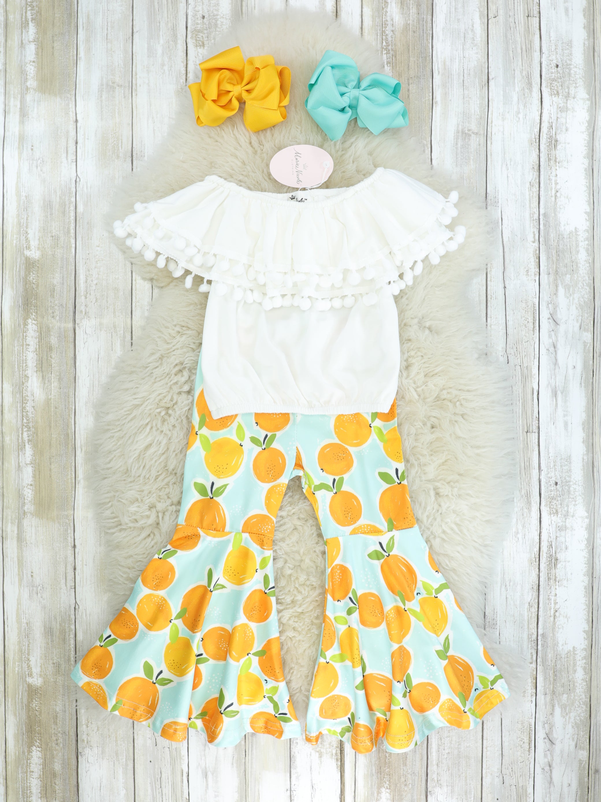 White Pom-Pom Top & Citrus Bell Bottoms Outfit
