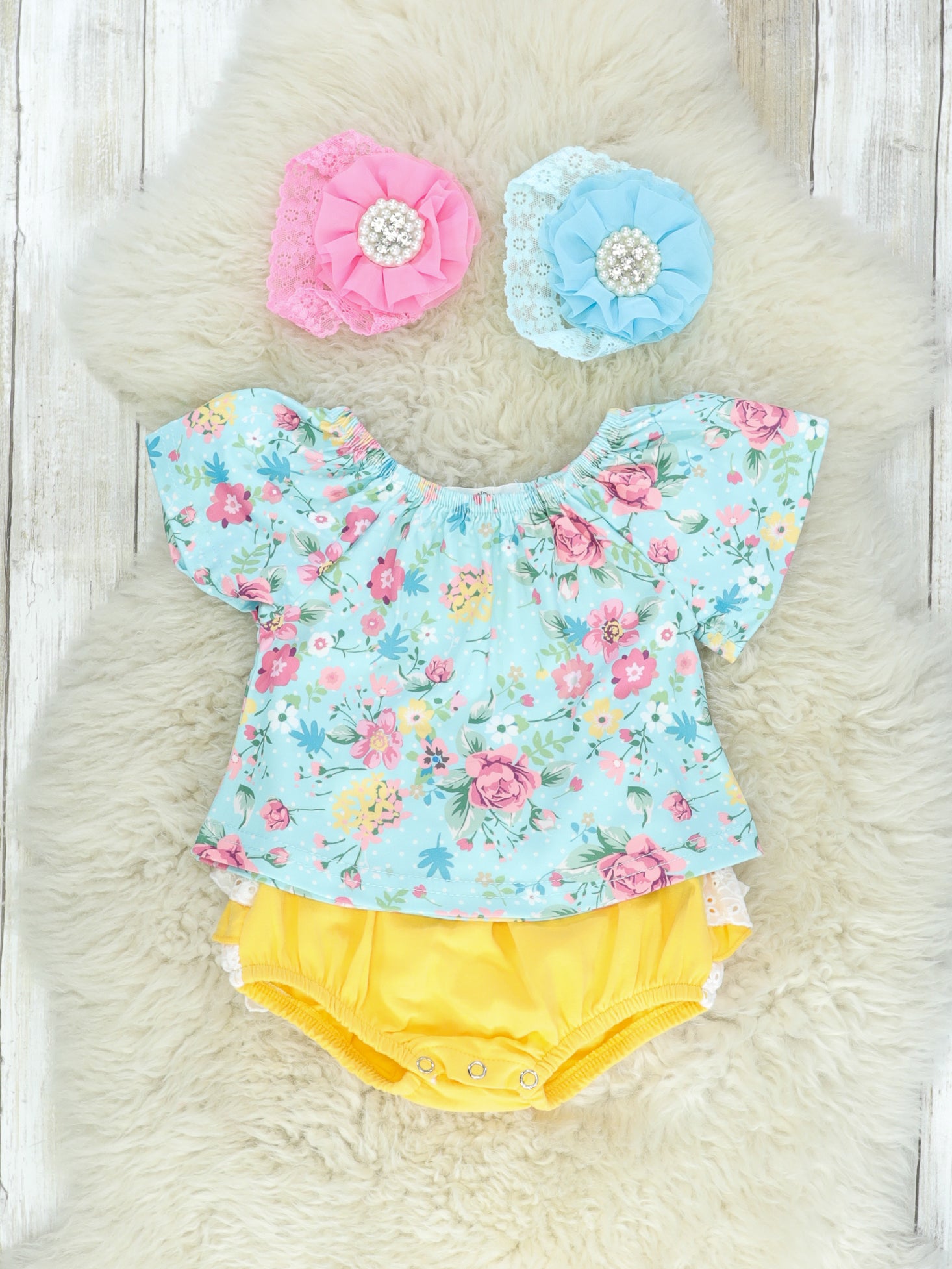 Sky Blue Floral Top & Yellow Ruffle Bloomers