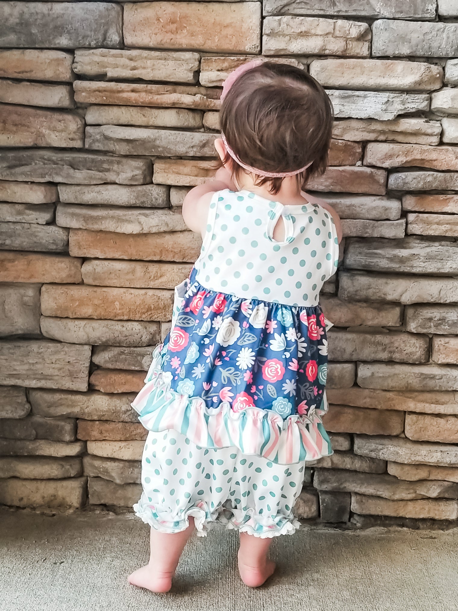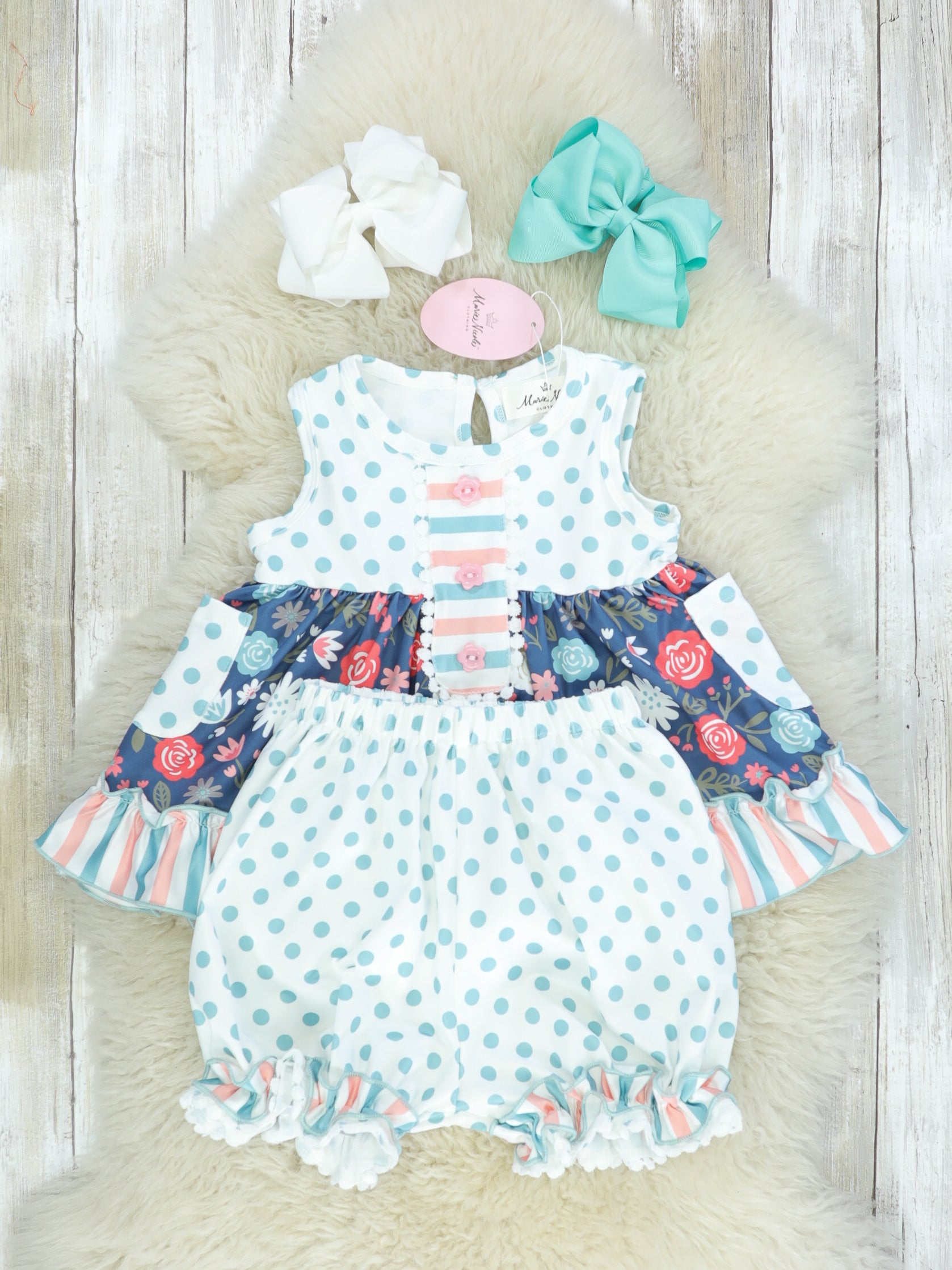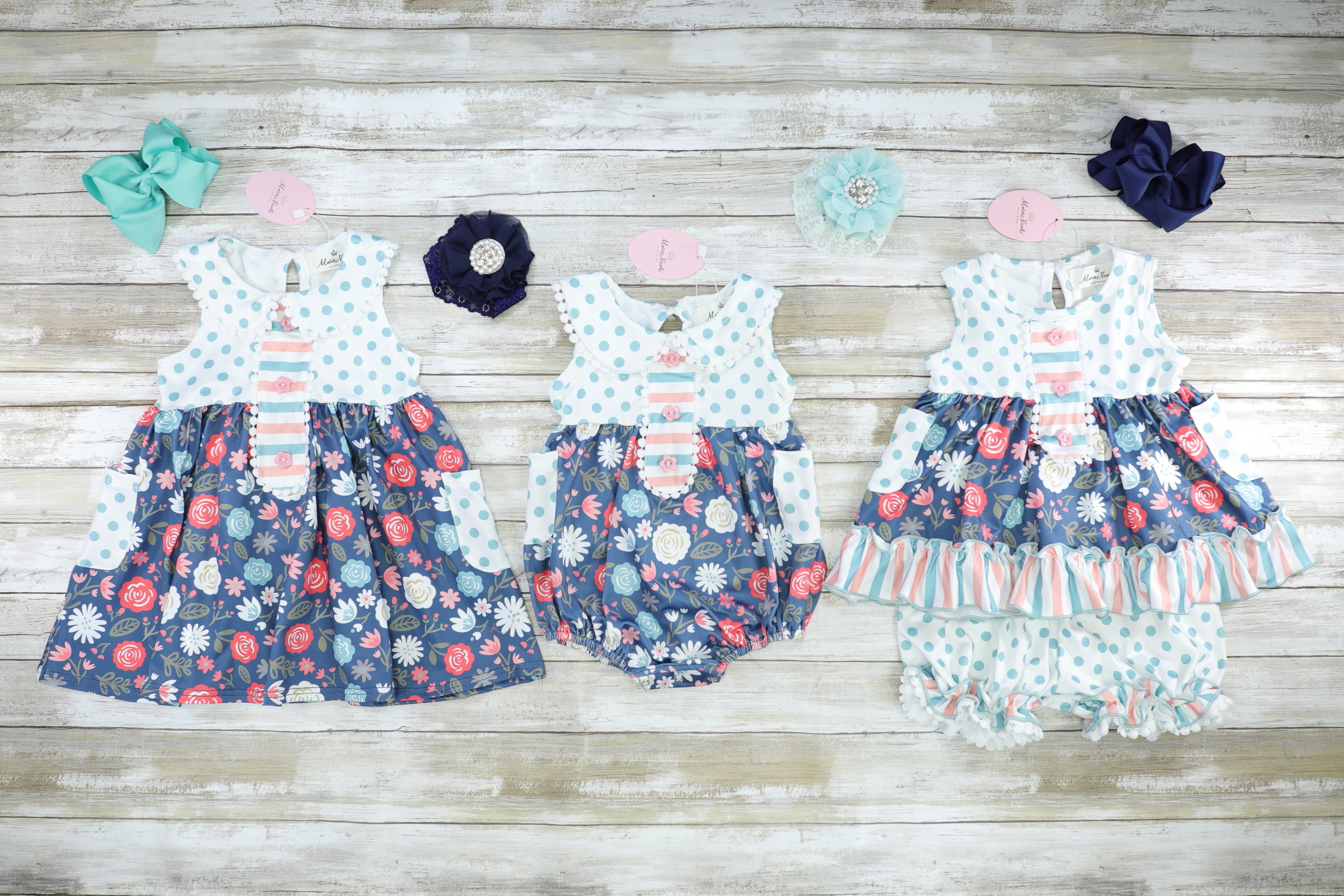 The cutest MNC exclusive set for all of your sisters to match in this season! This outfit features nonfunctional pink buttons on the top, polka dots, stripes, florals, two pockets, and a functional button on the top at the nape of the neck for easy on and off. Shop the sister set here!