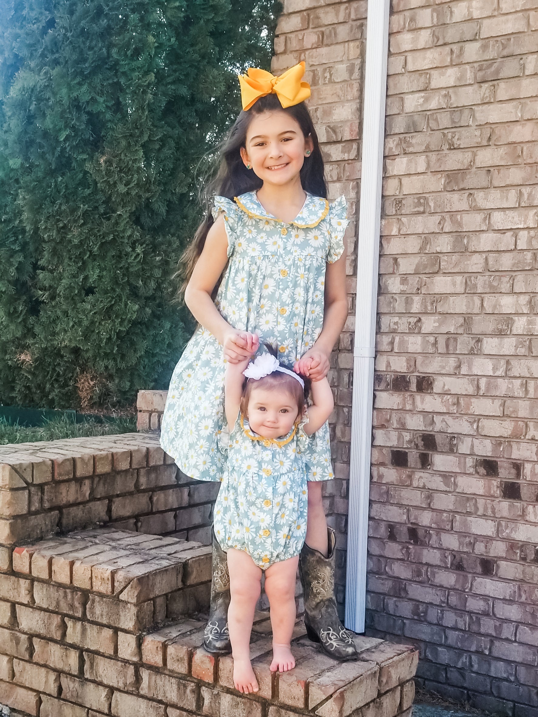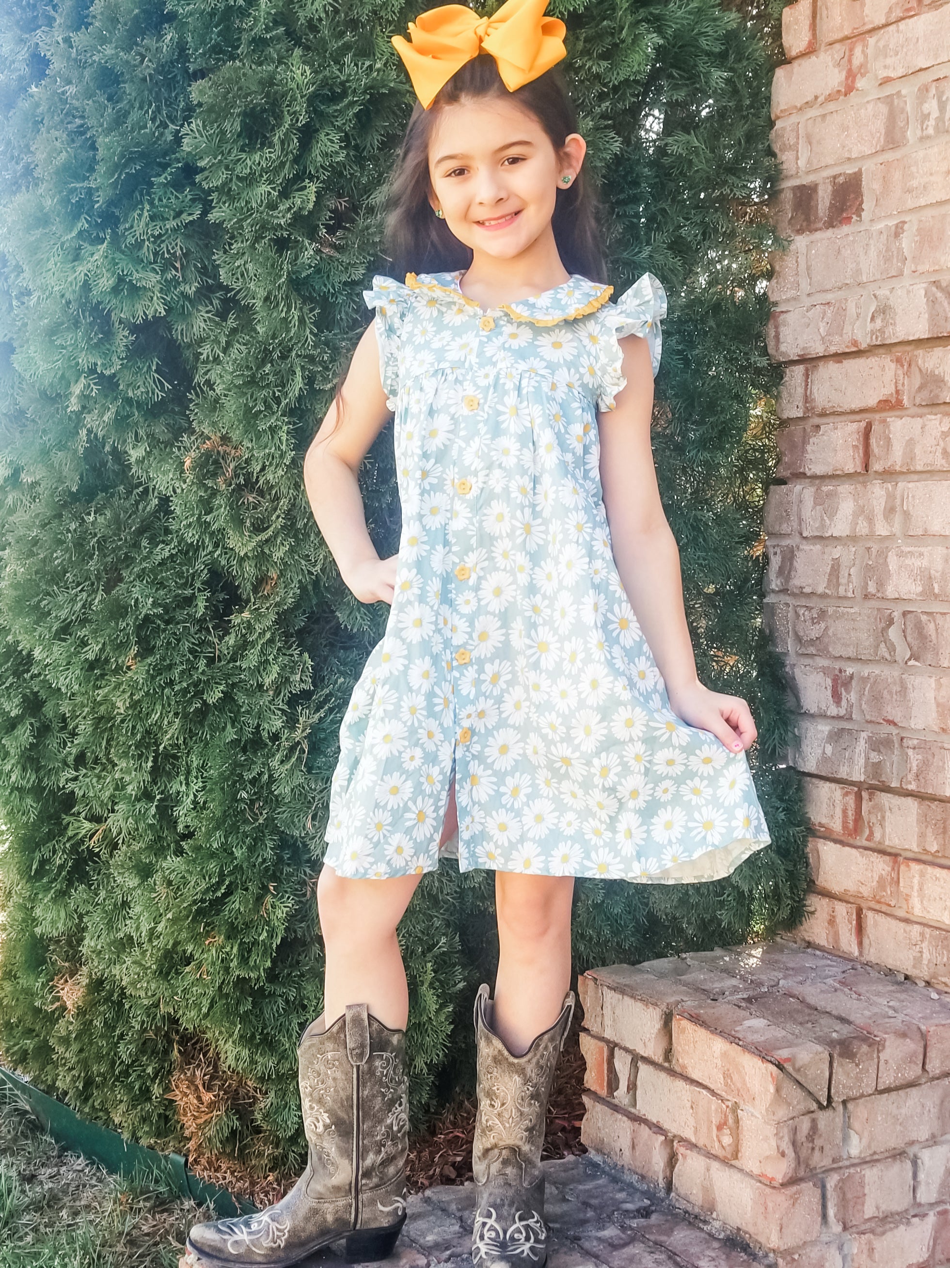 This MNC exclusive sister set features the sweetest Spring daisies! This powder blue dress features ruffle sleeves, a collar with yellow trim, yellow buttons lining top to bottom, and a sweet Spring daisy pattern.