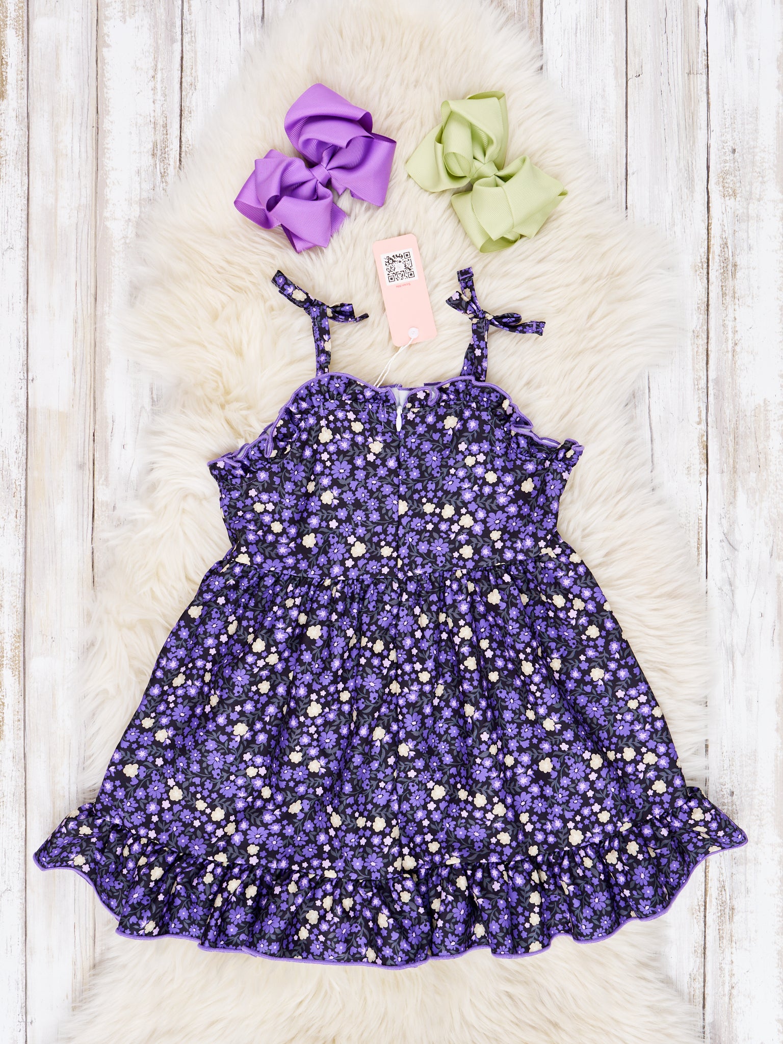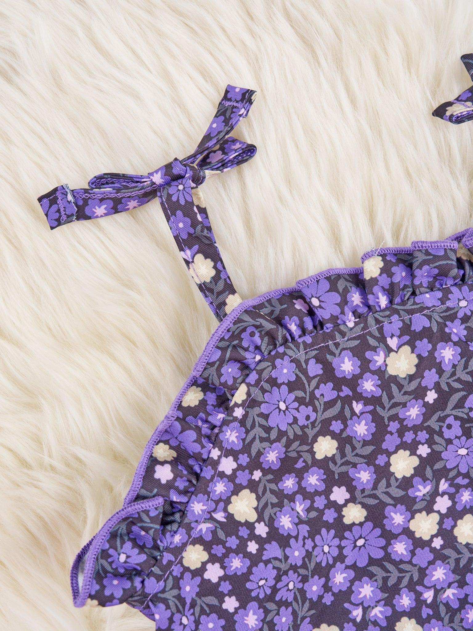 Let your little one take their style up a flowery notch with this deep purple floral tank dress! Perfect for special occasions, this stunning piece will ensure your munchkin stands out in the crowd with its eye-catching florals and charming ruffles.