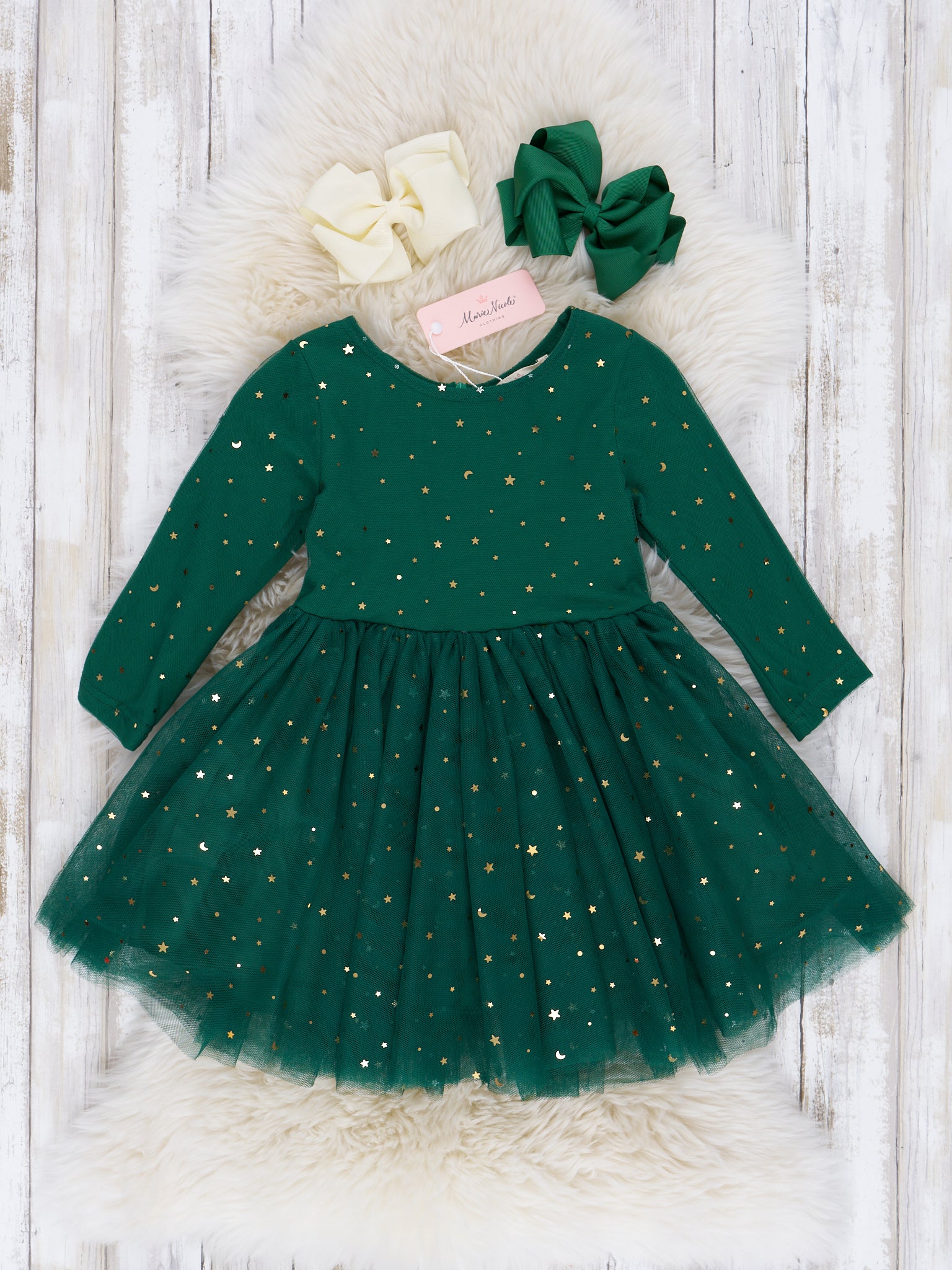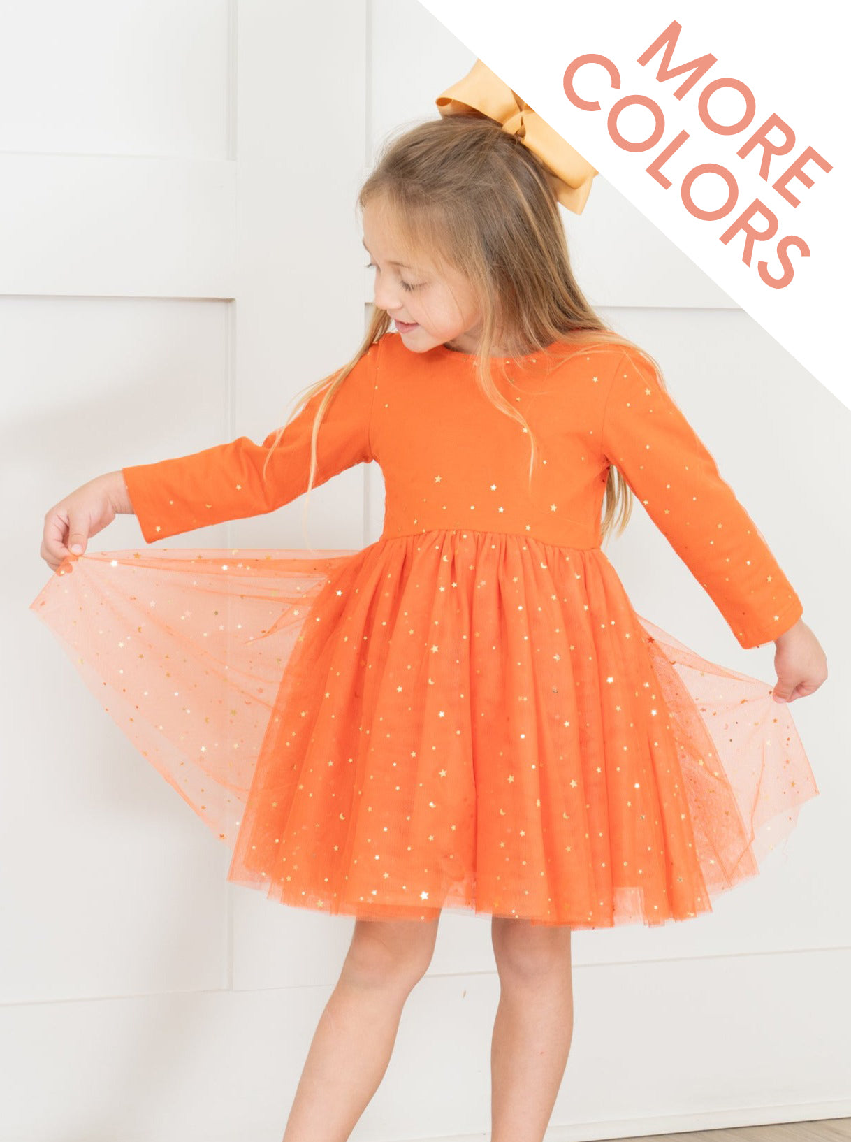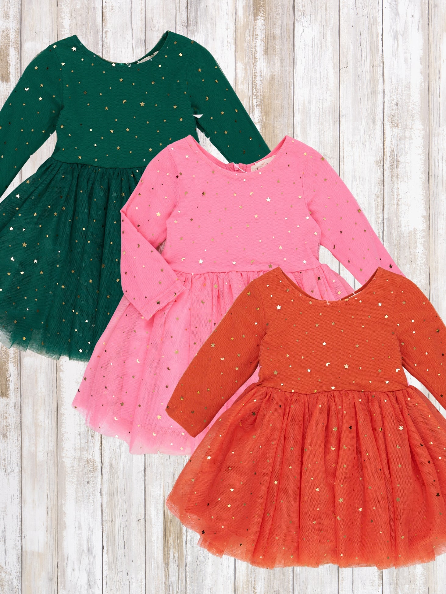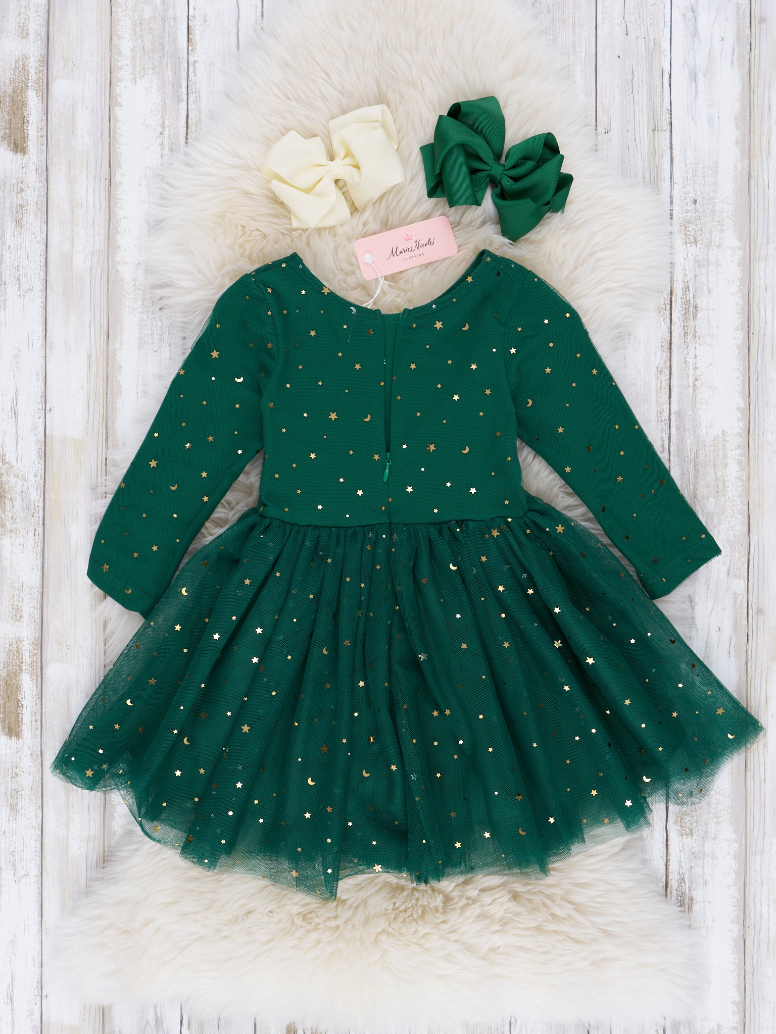 Watch your girls sparkle in these adorable dresses! This dress features allover glitter, a fully lined tulle dress skirt, & a functioning zipper at the nape of the neck. Available in Emerald, Blush, and Ginger.
