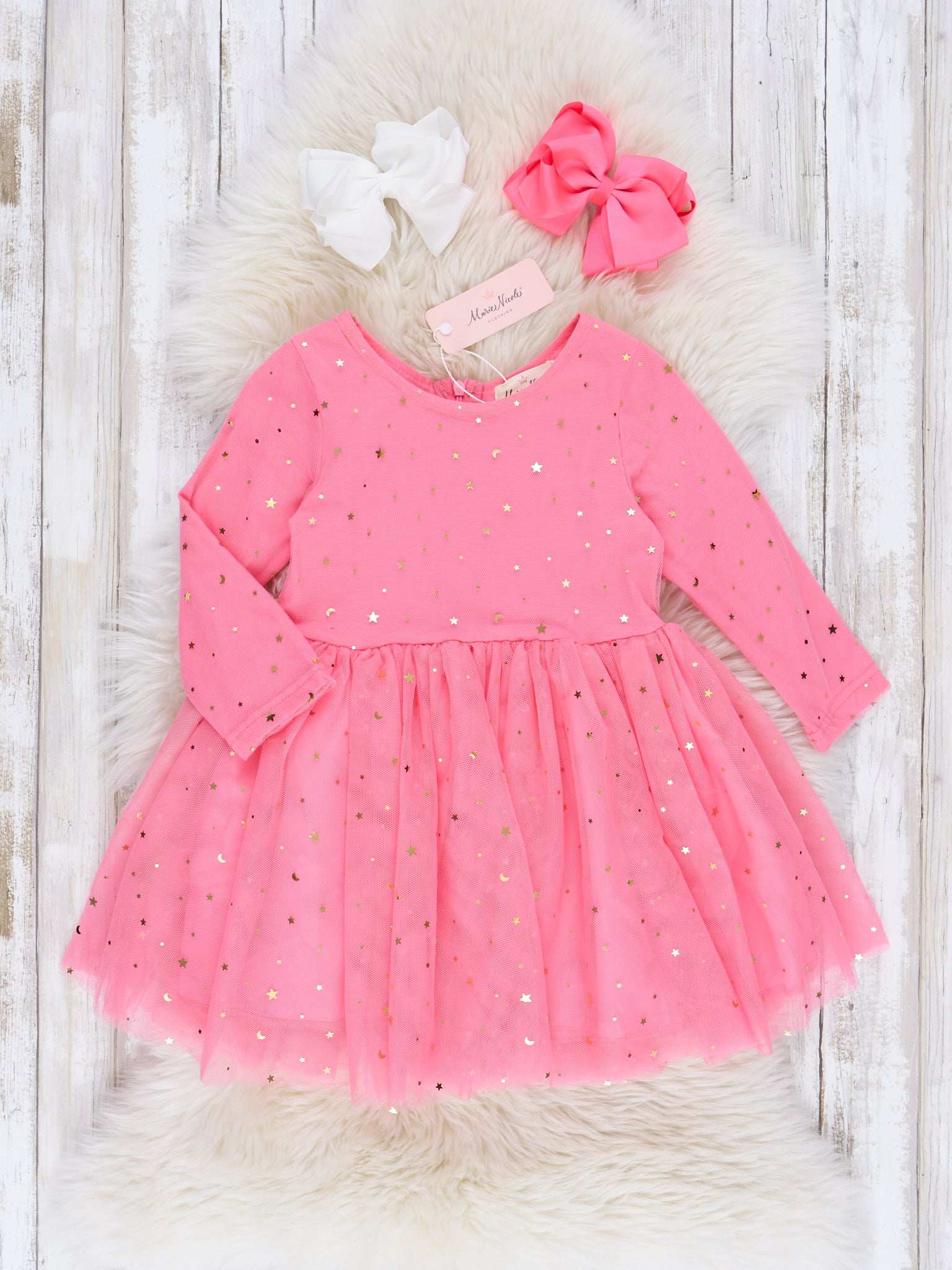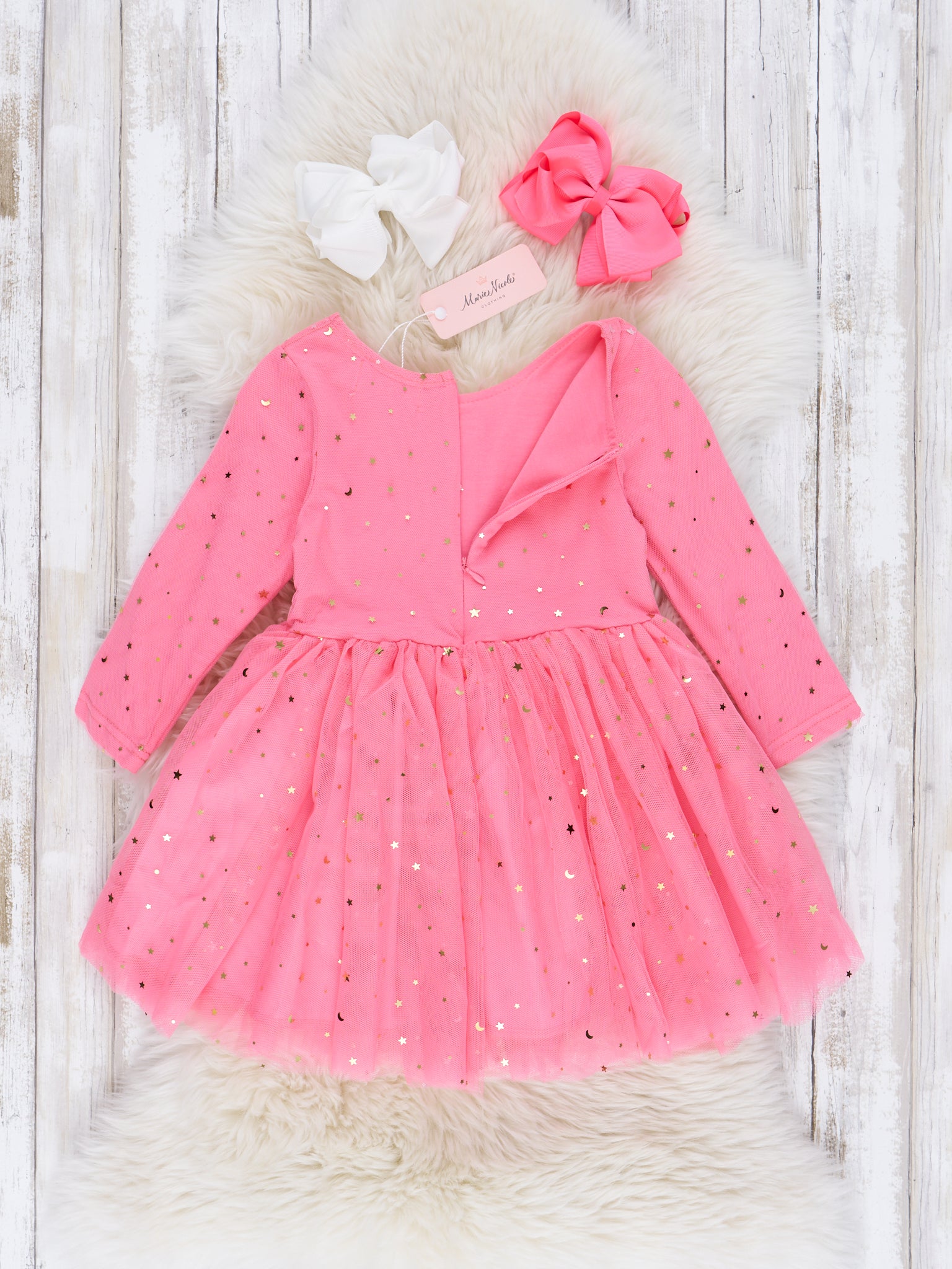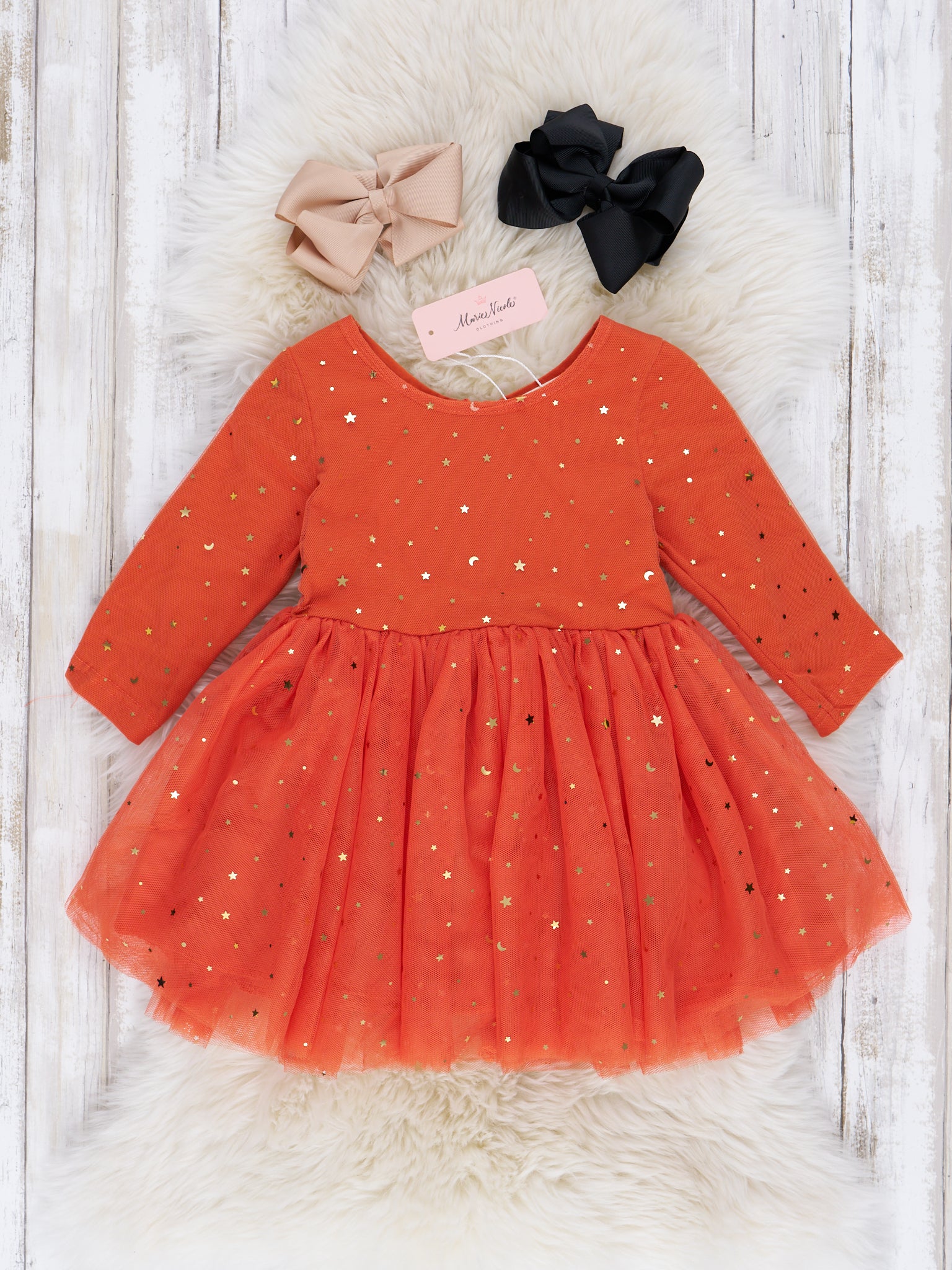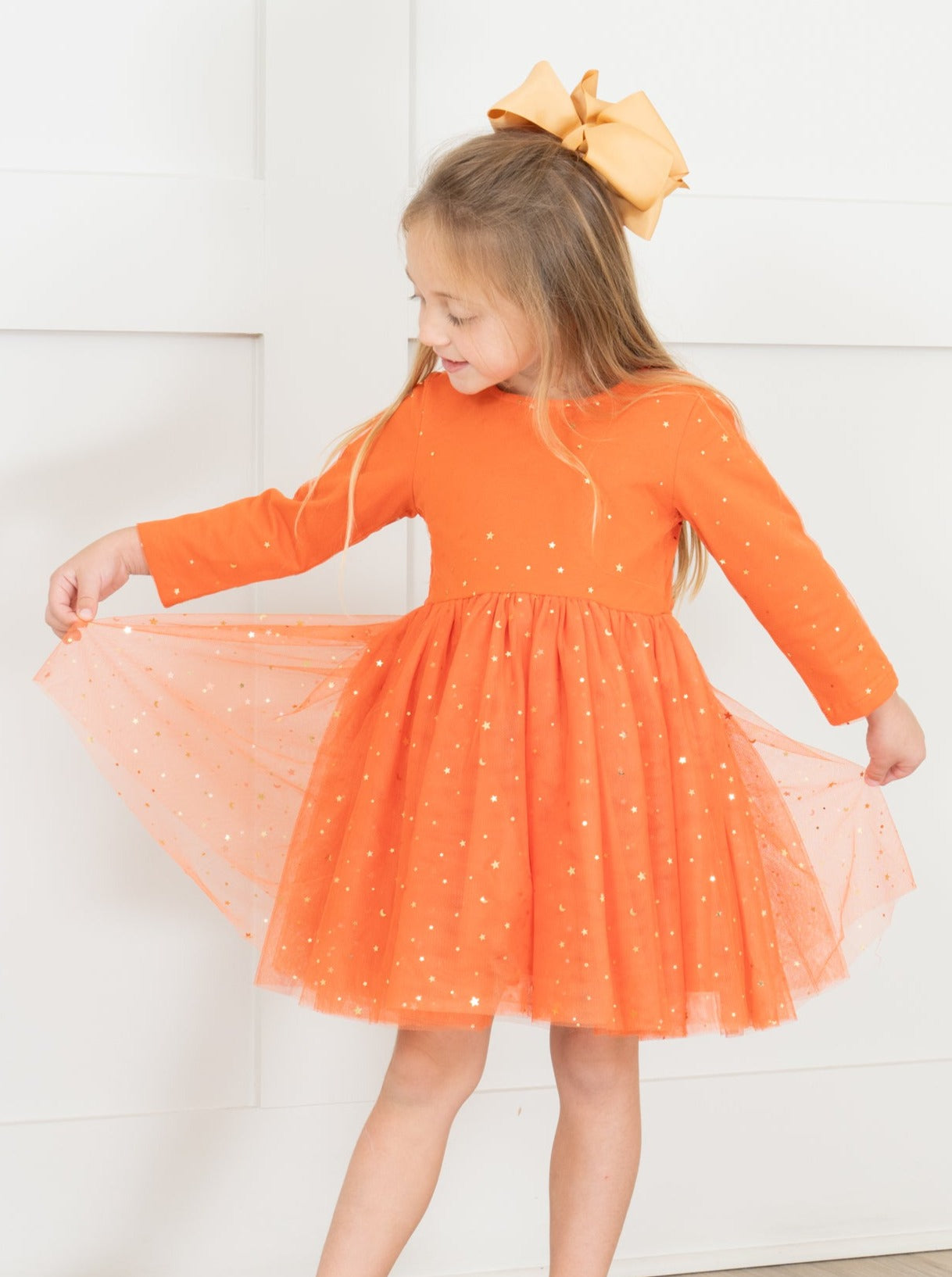 Watch your girls sparkle in these adorable dresses! This dress features allover glitter, a fully lined tulle dress skirt, & a functioning zipper at the nape of the neck. Available in Emerald, Blush, and Ginger.