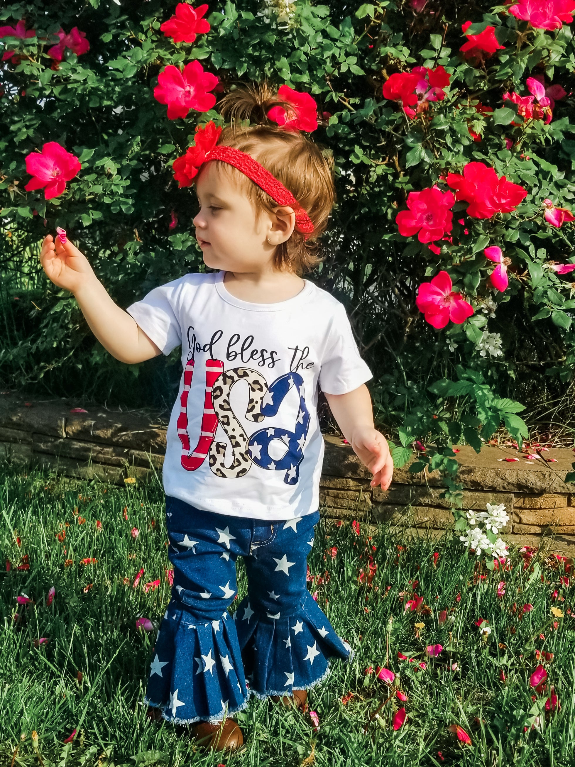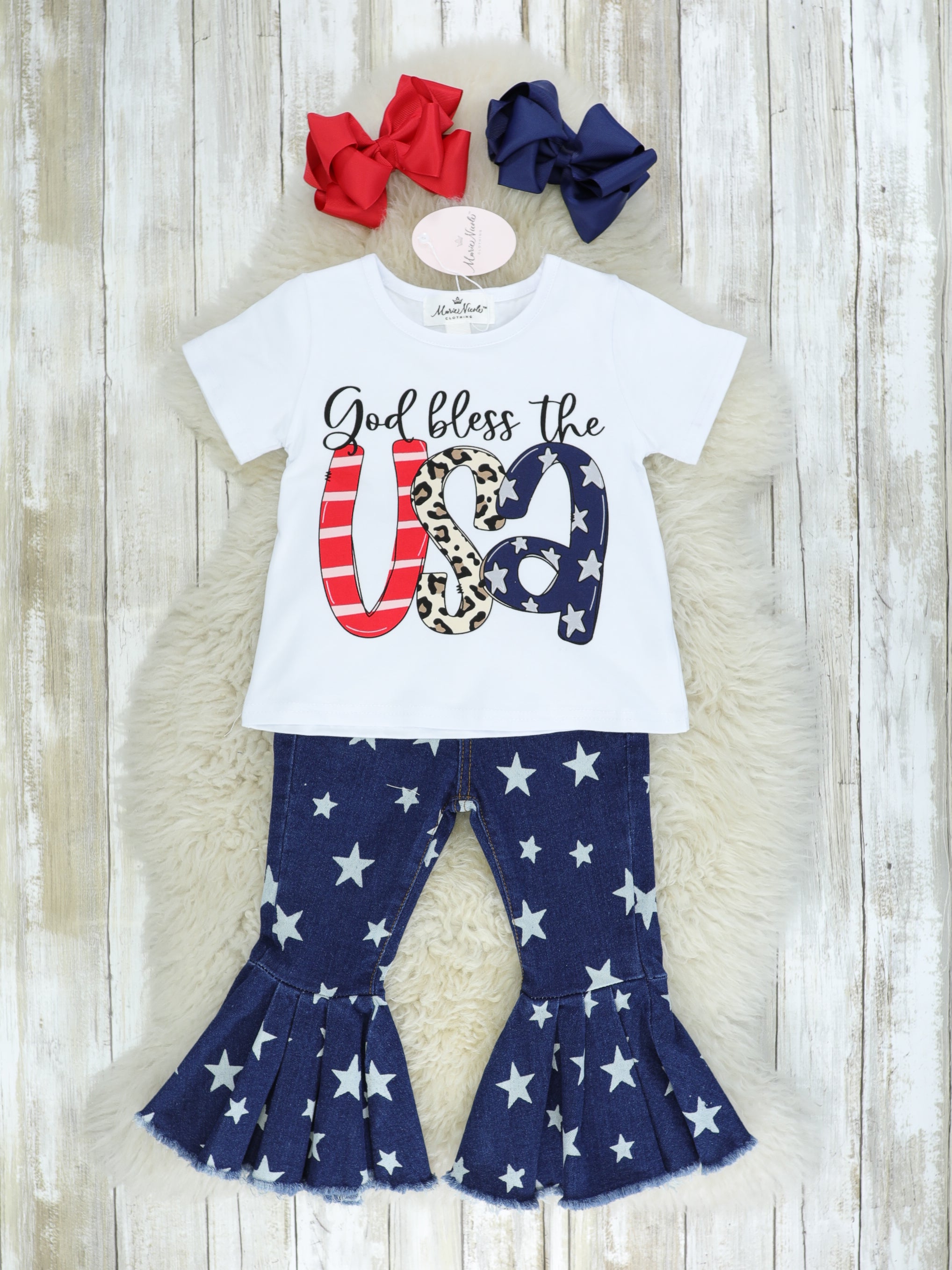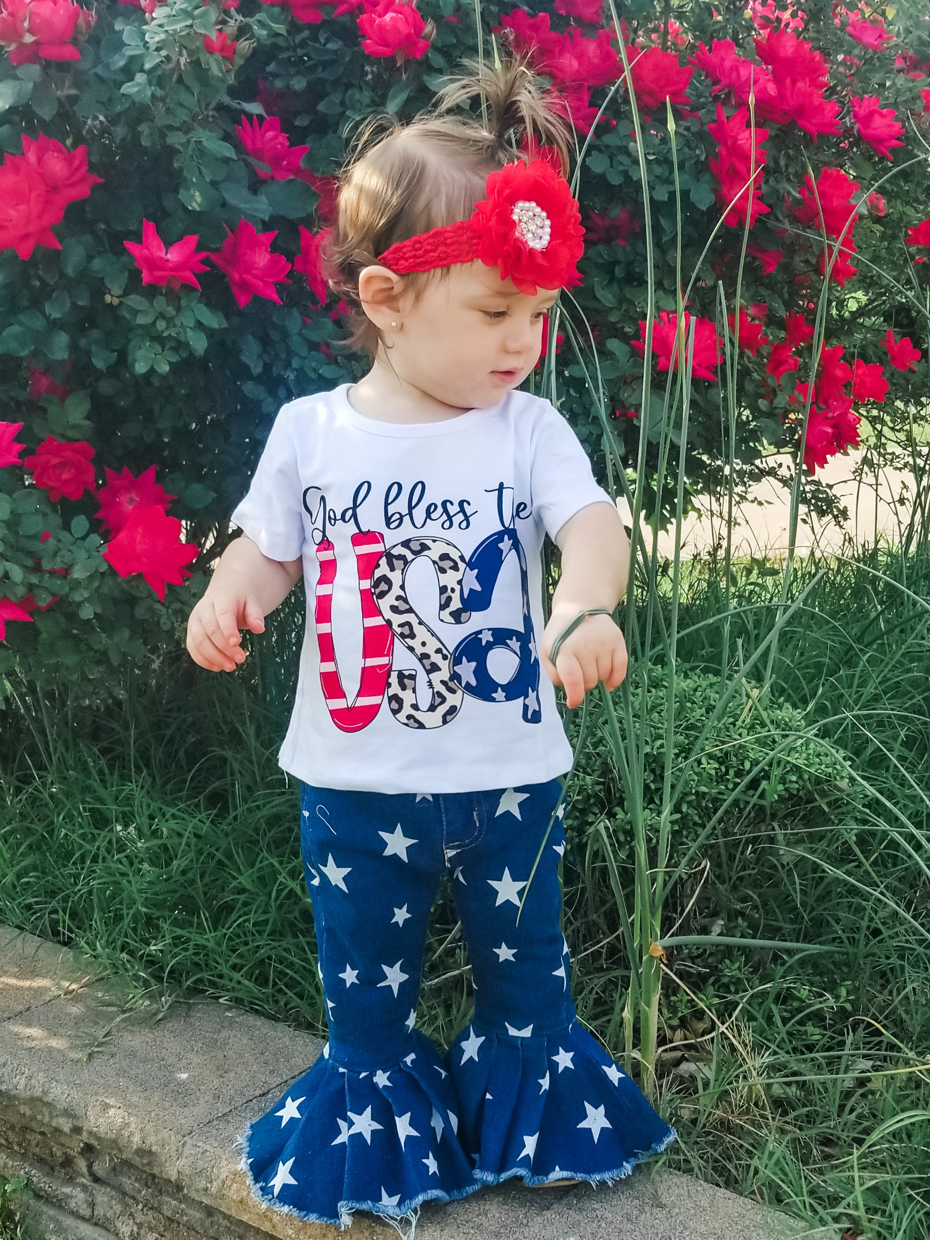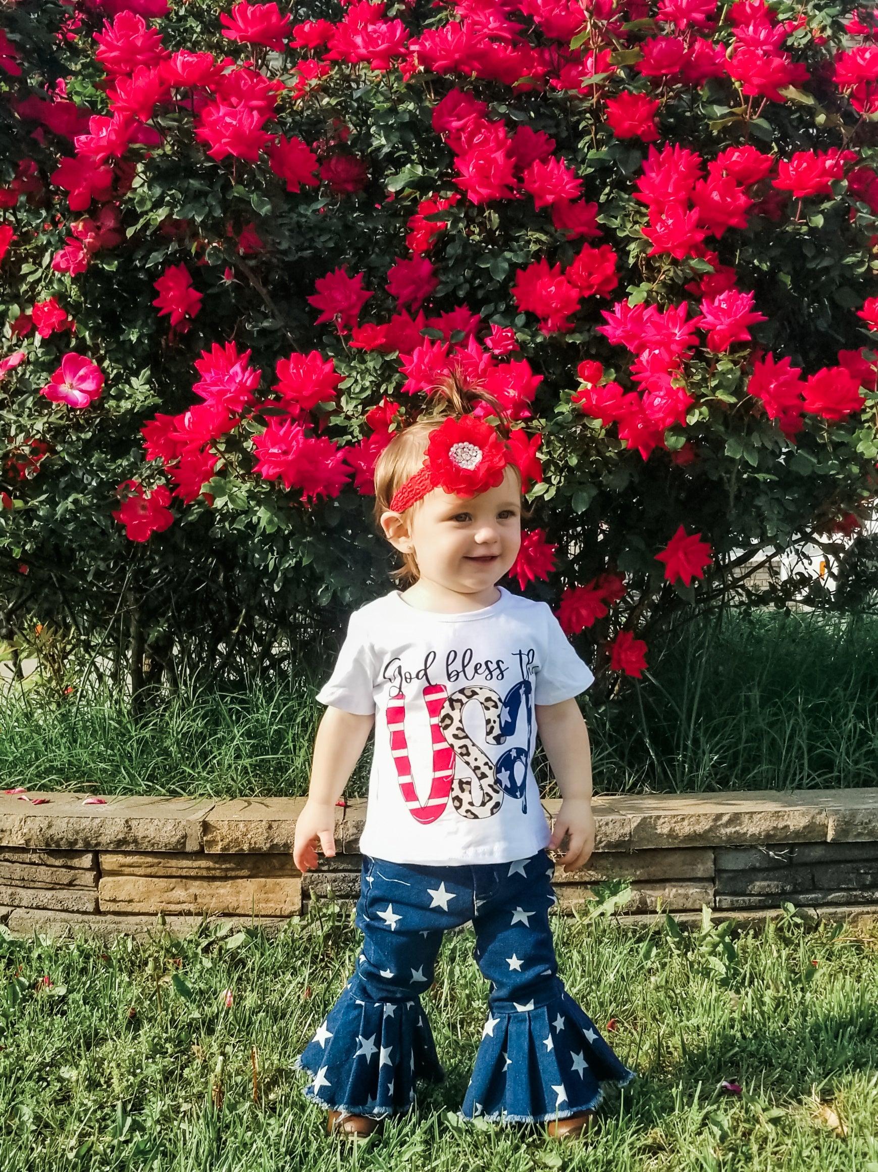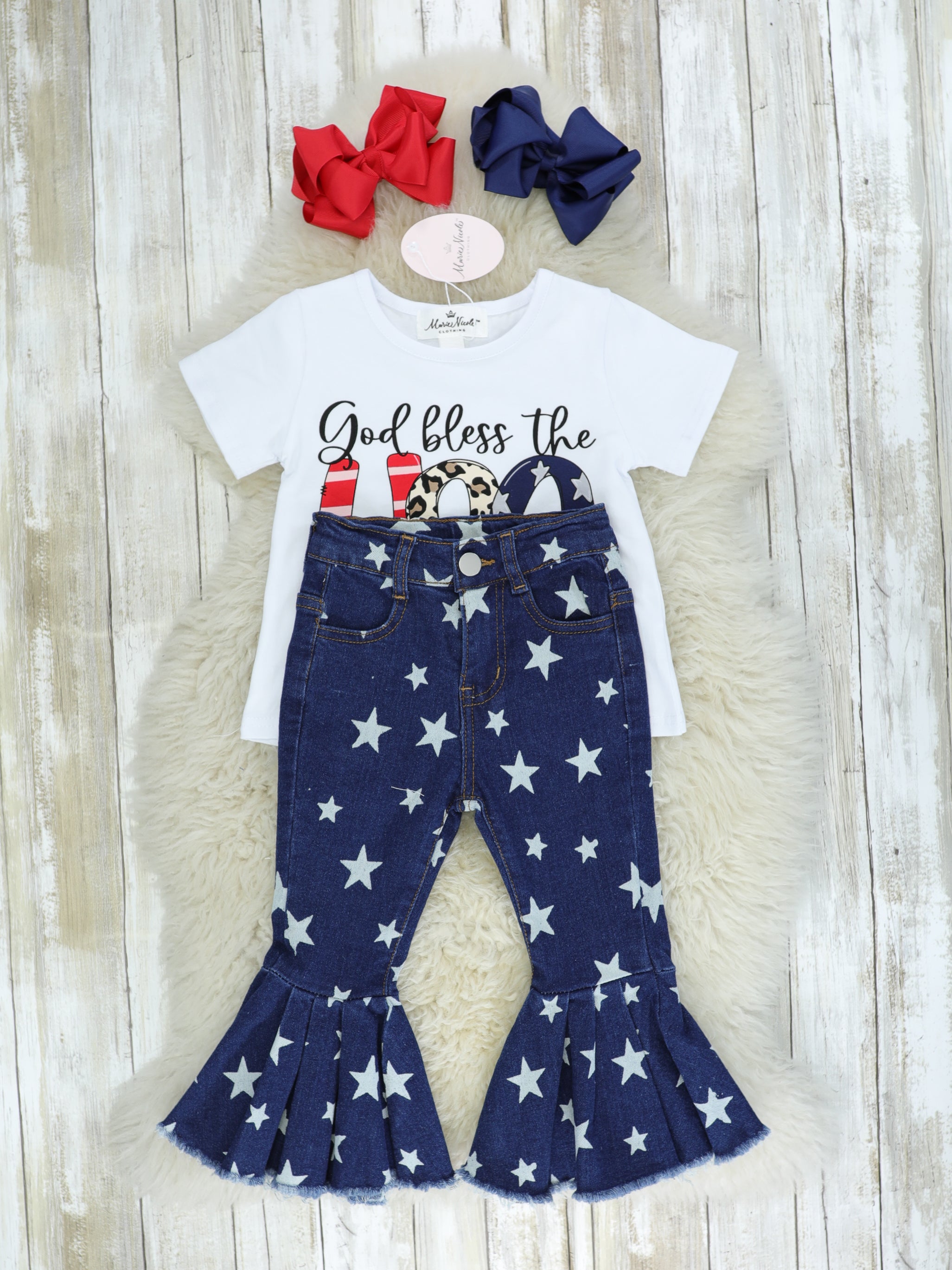 This "God Bless The USA" 🇺🇸 outfit is a standout piece with super cute star bell bottoms.