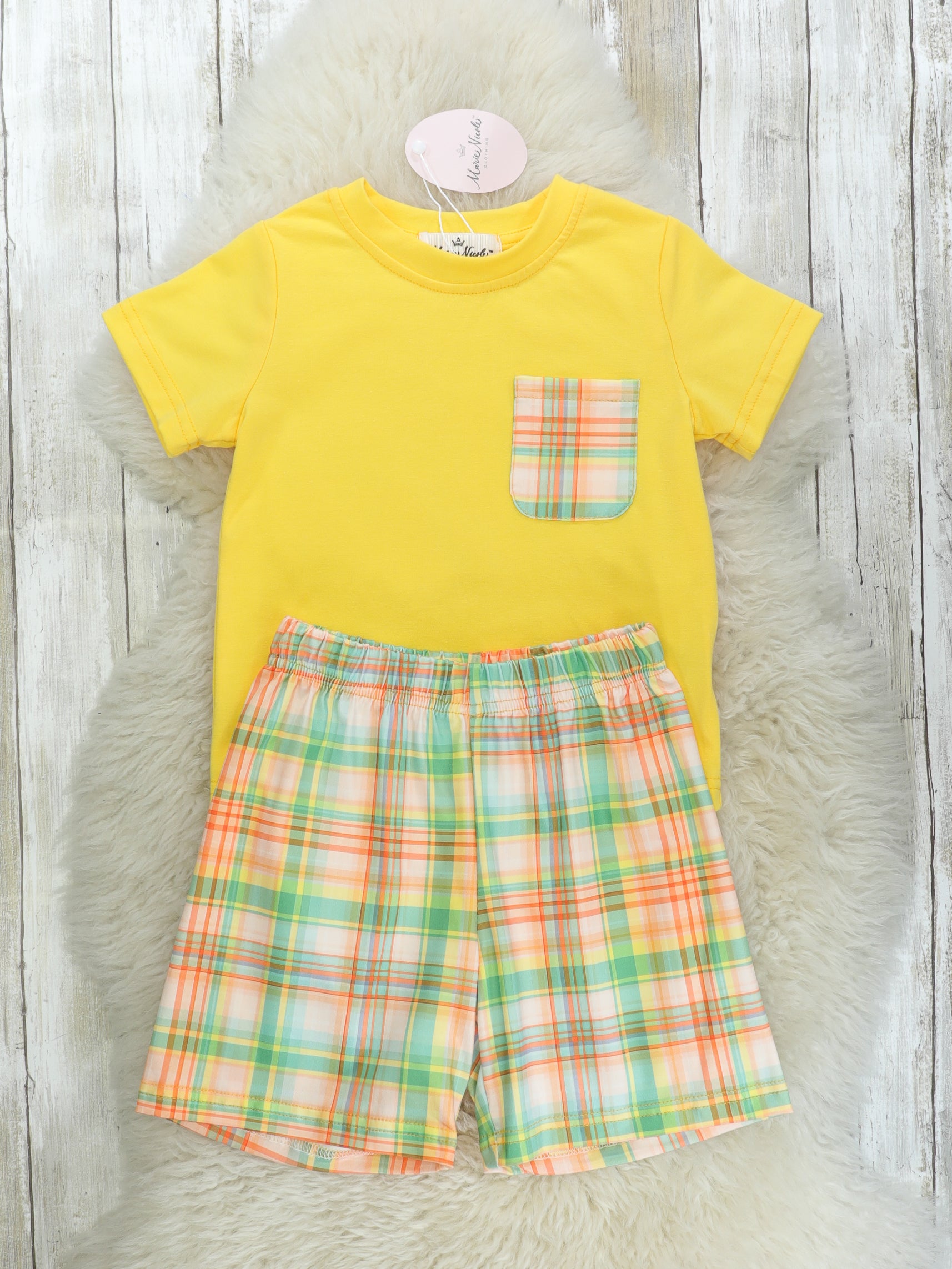 We're plaid about this outfit! It features a bright yellow top with a functional plaid pocket & matching plaid shorts with a comfortable elastic waist.