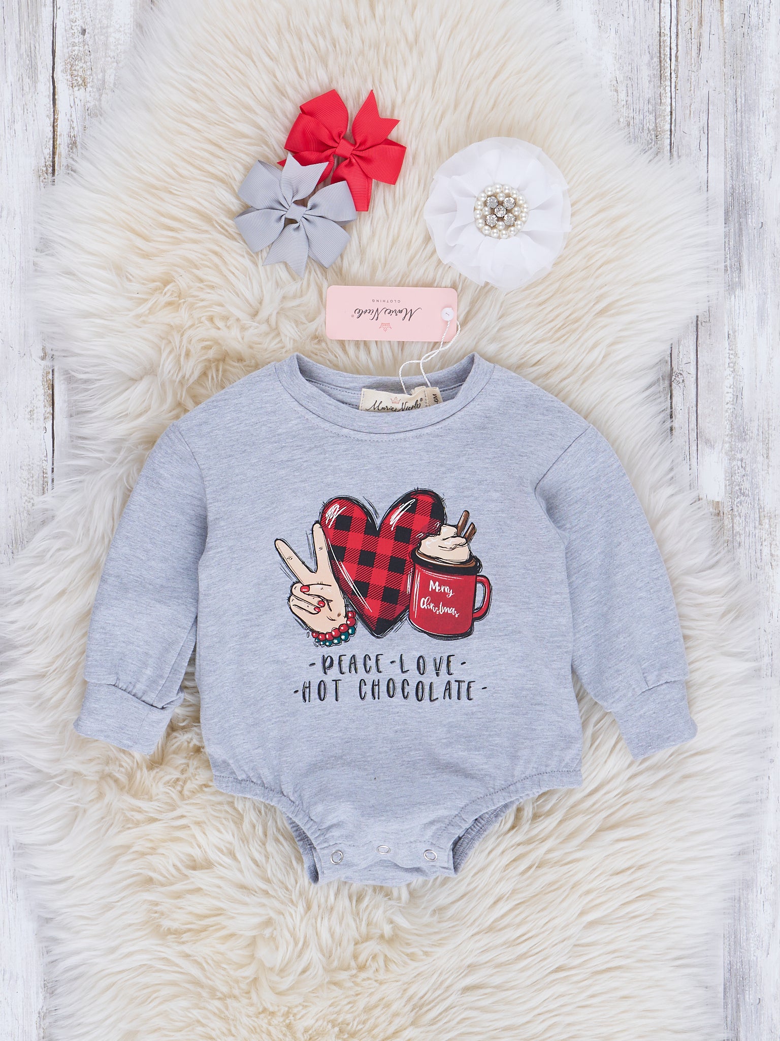 Spread some love and hot cocoa this holiday season with this cozy Heather Grey Hot Chocolate Sister Set! This romper is a perfect gift for your sis — peace, love, and cocoa for all!