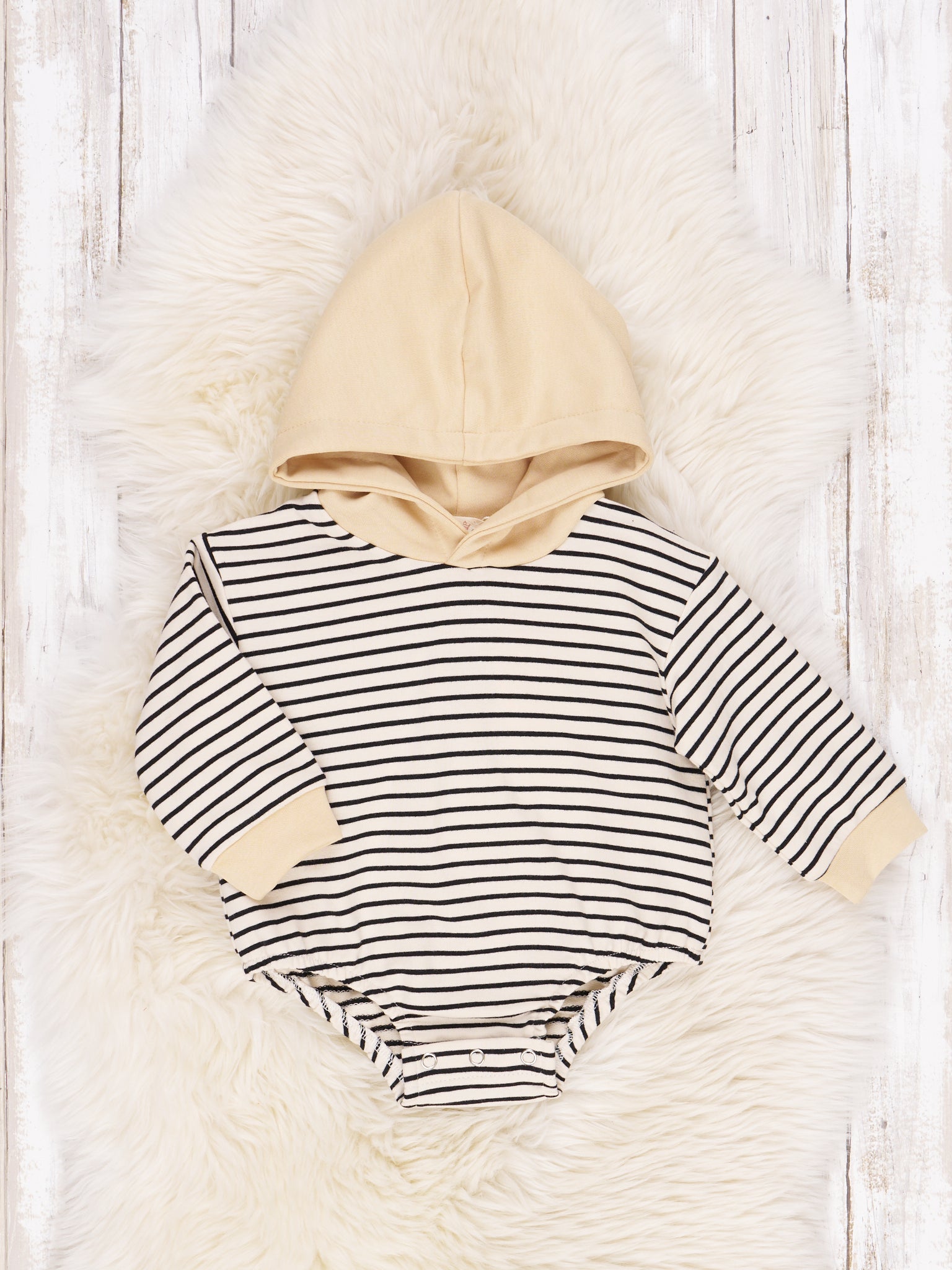 The Long Sleeve Stripe Hoodie Romper is the perfect chilly weather classic! Featuring long sleeves and classic stripes, this romper will take you from late summer ball games into the cooler fall football season! Available in Black and Cream.