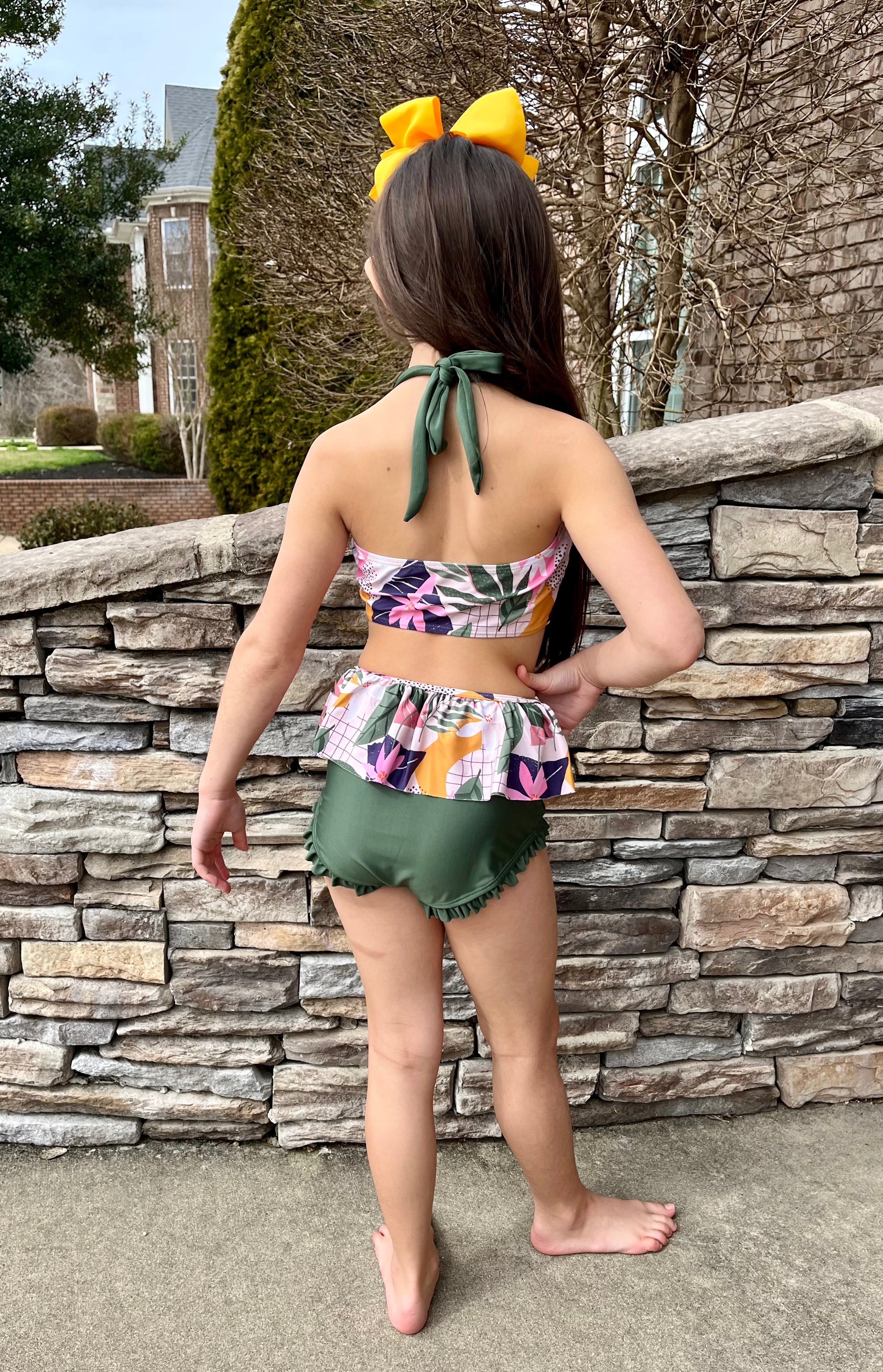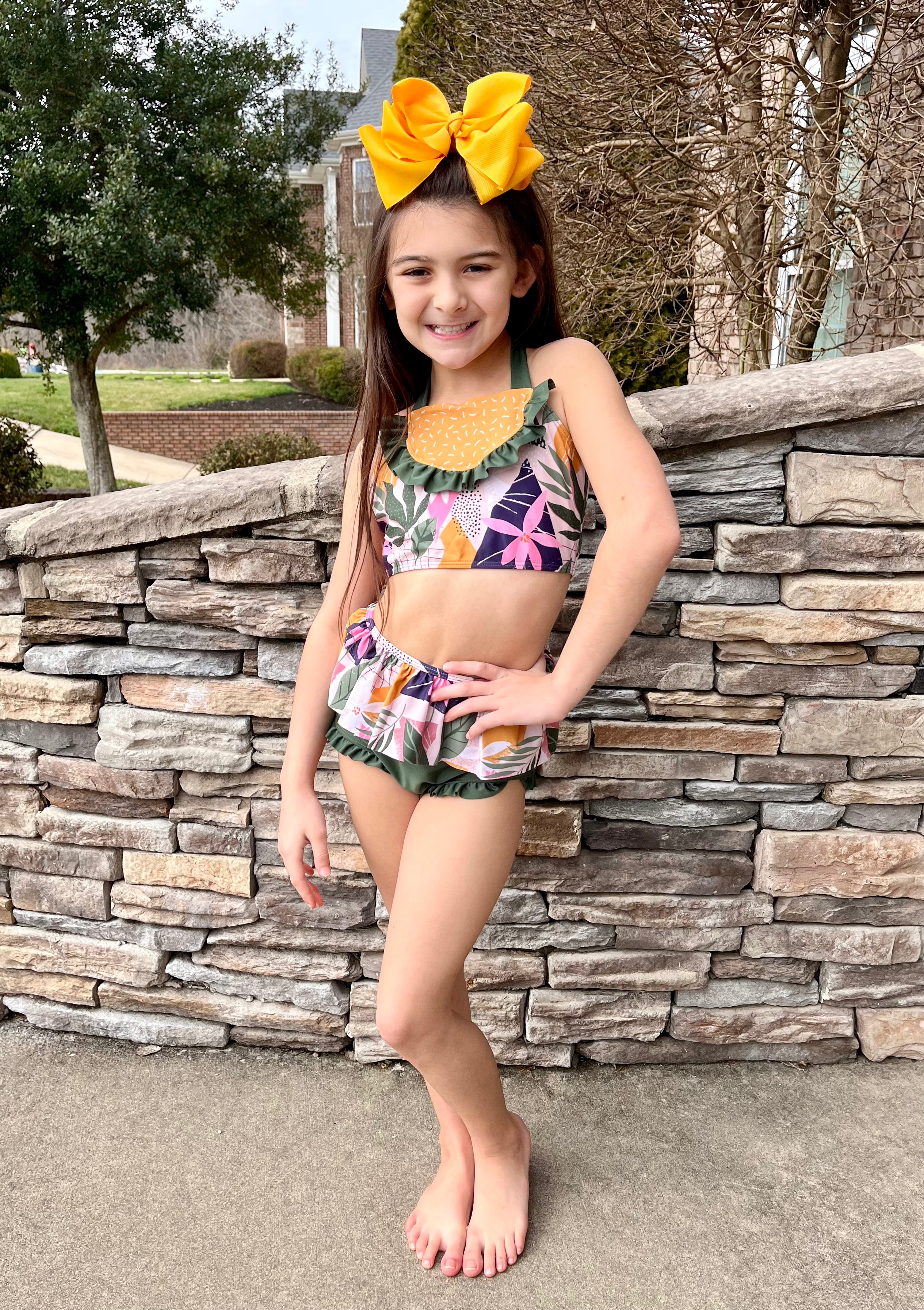 Embrace pool vibes with this sassy two-piece! The splash of swim florals and playful ruffles will make your girl feel like a greek goddess, while the tie straps ensure she looks like one! Whether your little one is surfing the waves or lounging in the sun, she will stand out!