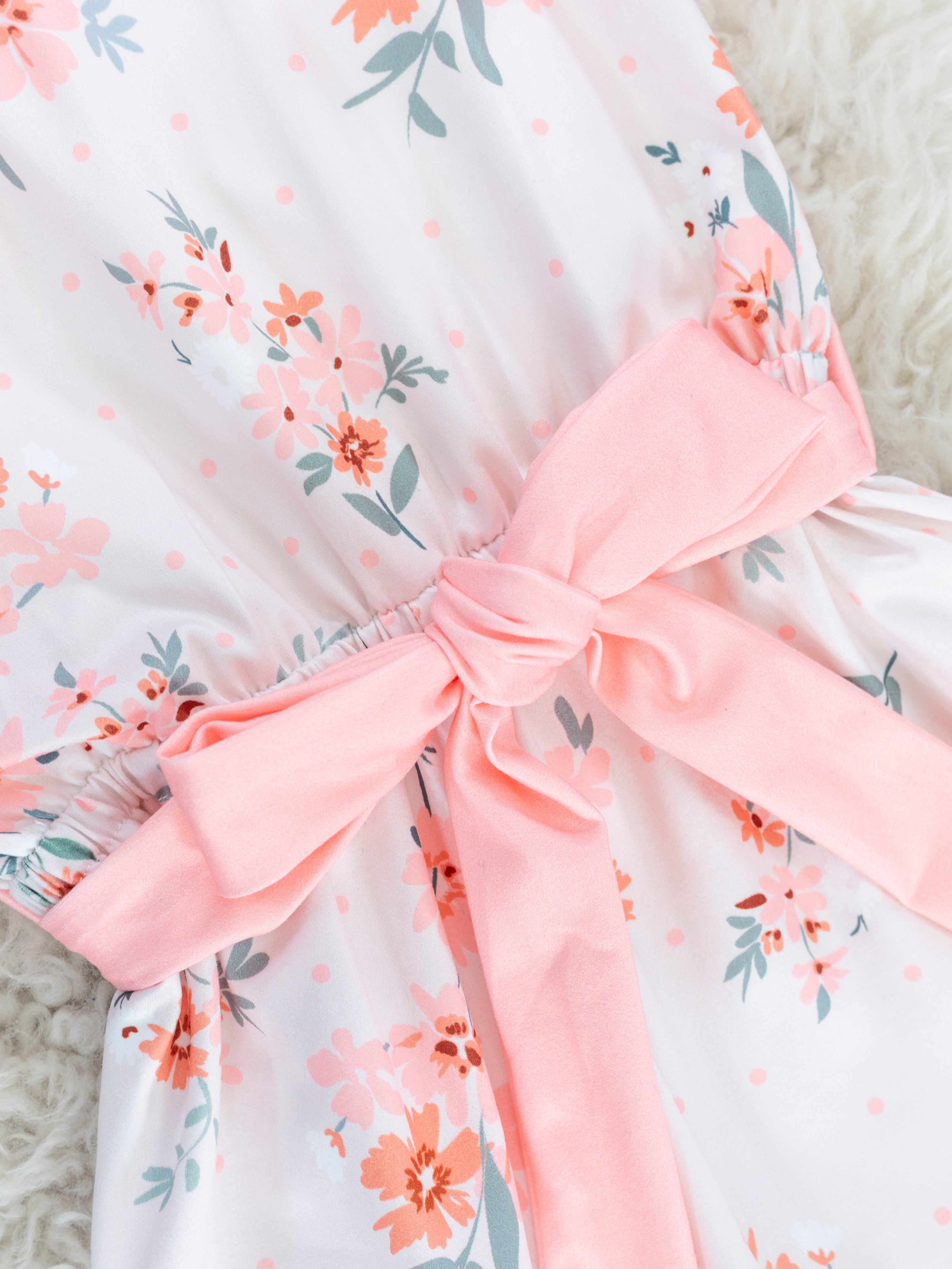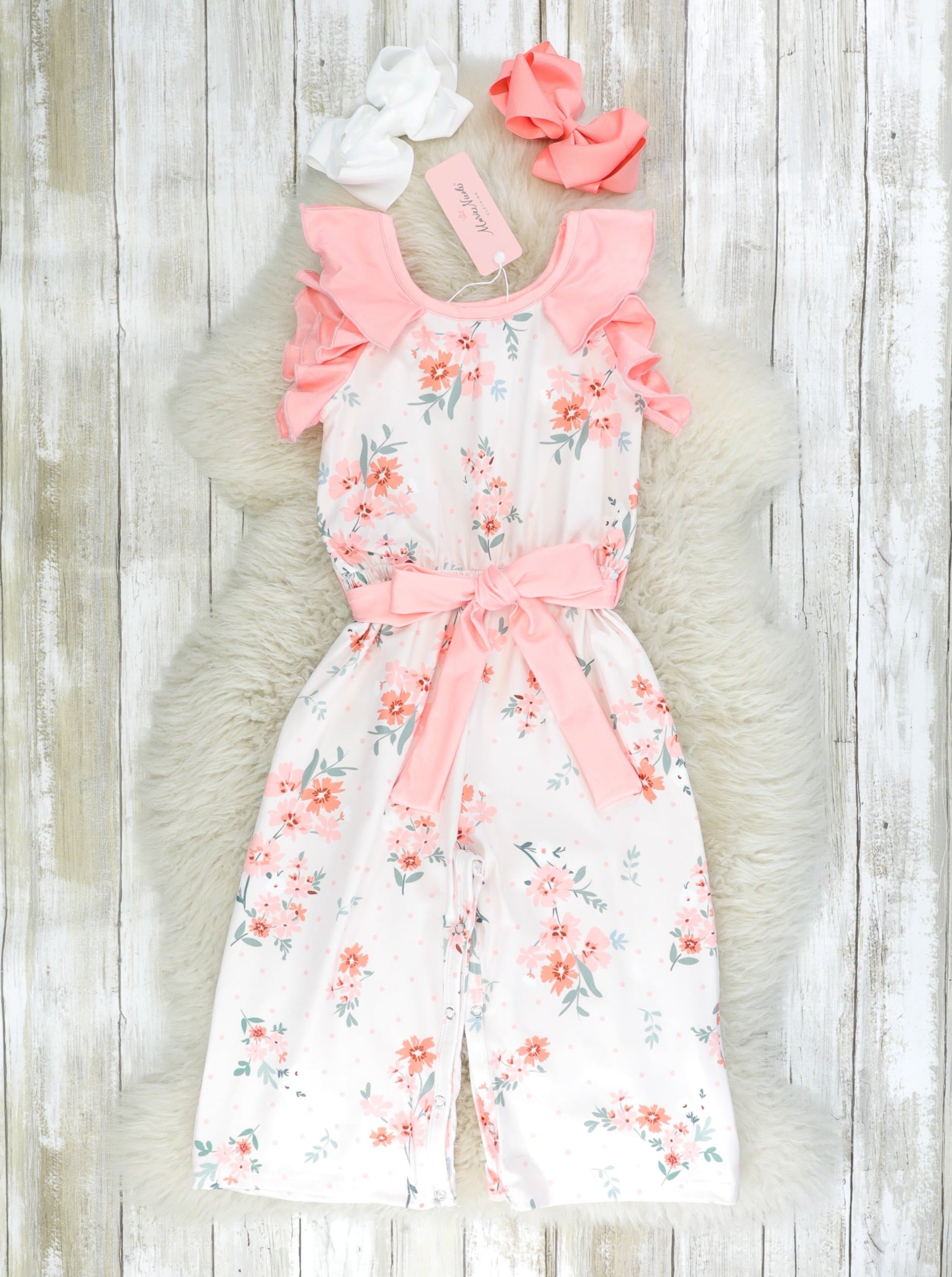 This gorgeous sister set is perfect for a spring picnic! This jumpsuit features stunning Aster florals, a tie at the waist, & peach ruffle trim.