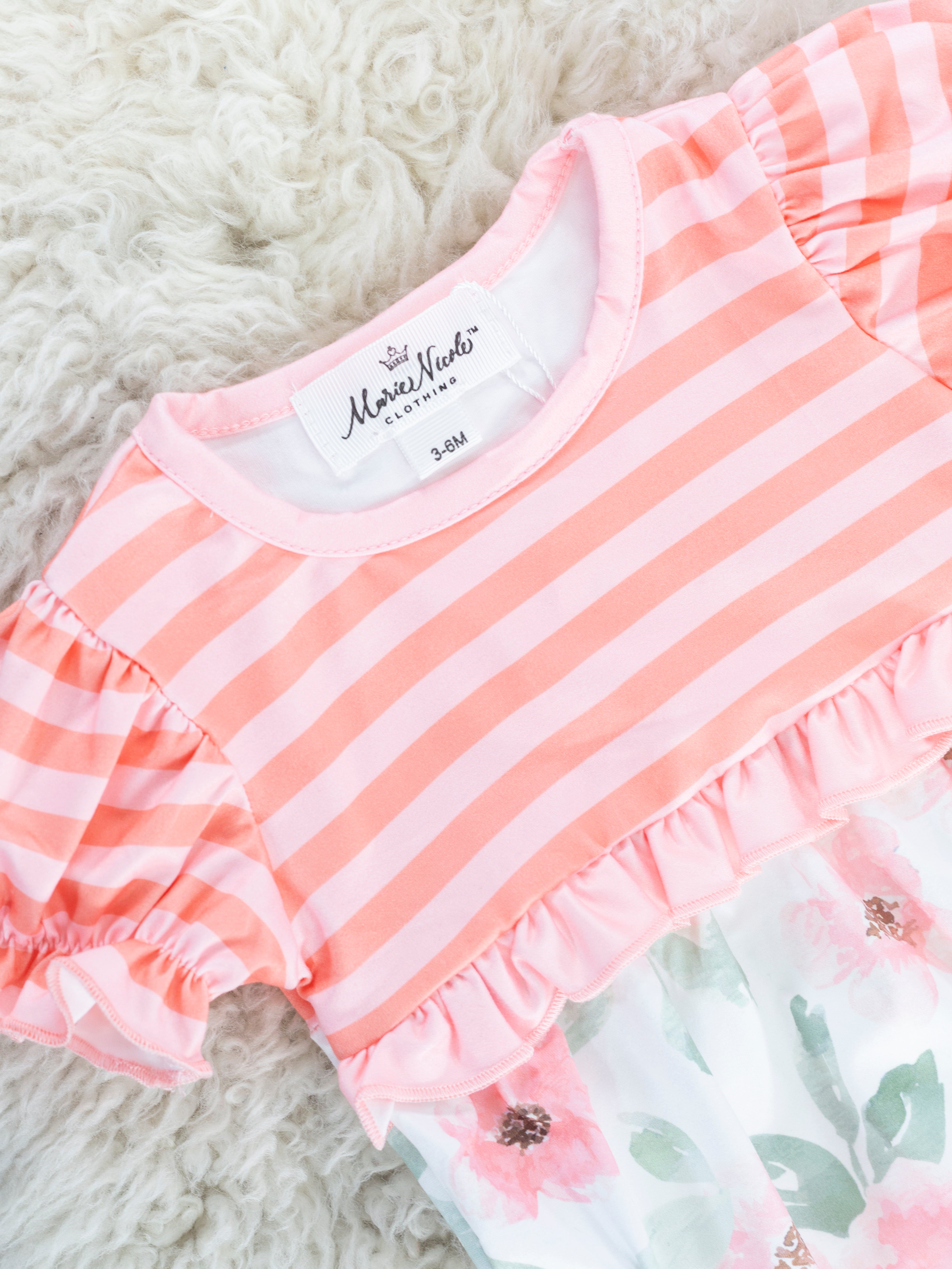 A stunning sister set for your bold girls! This bubble romper features stripes, gorgeous florals, & ruffle trim.
