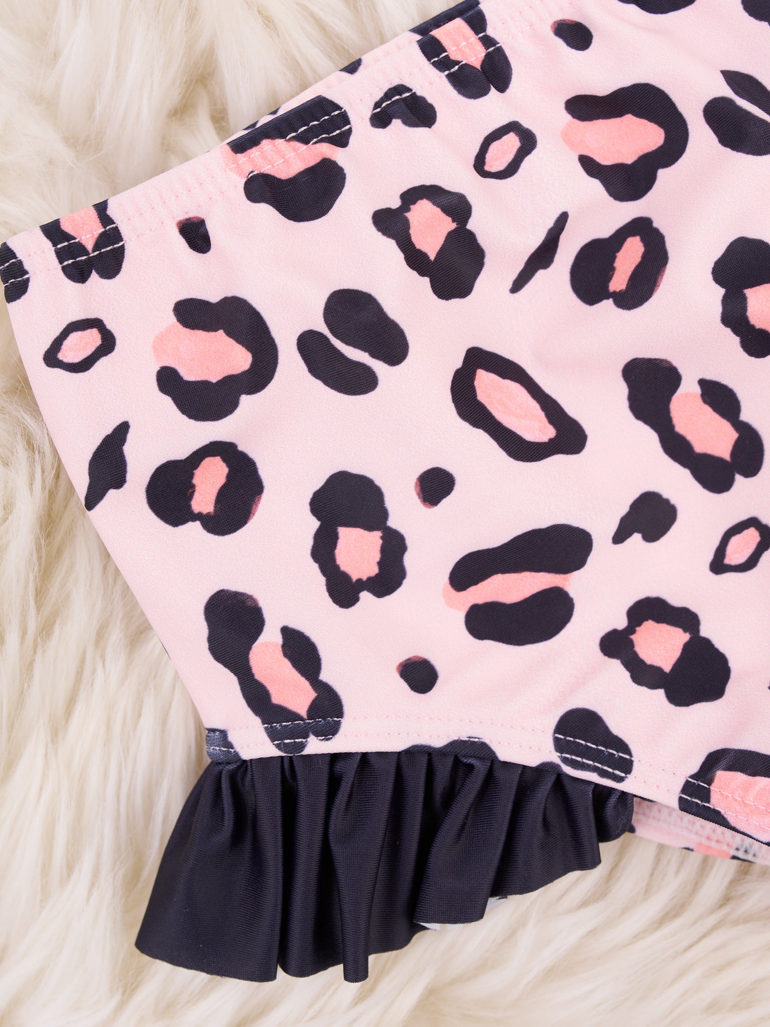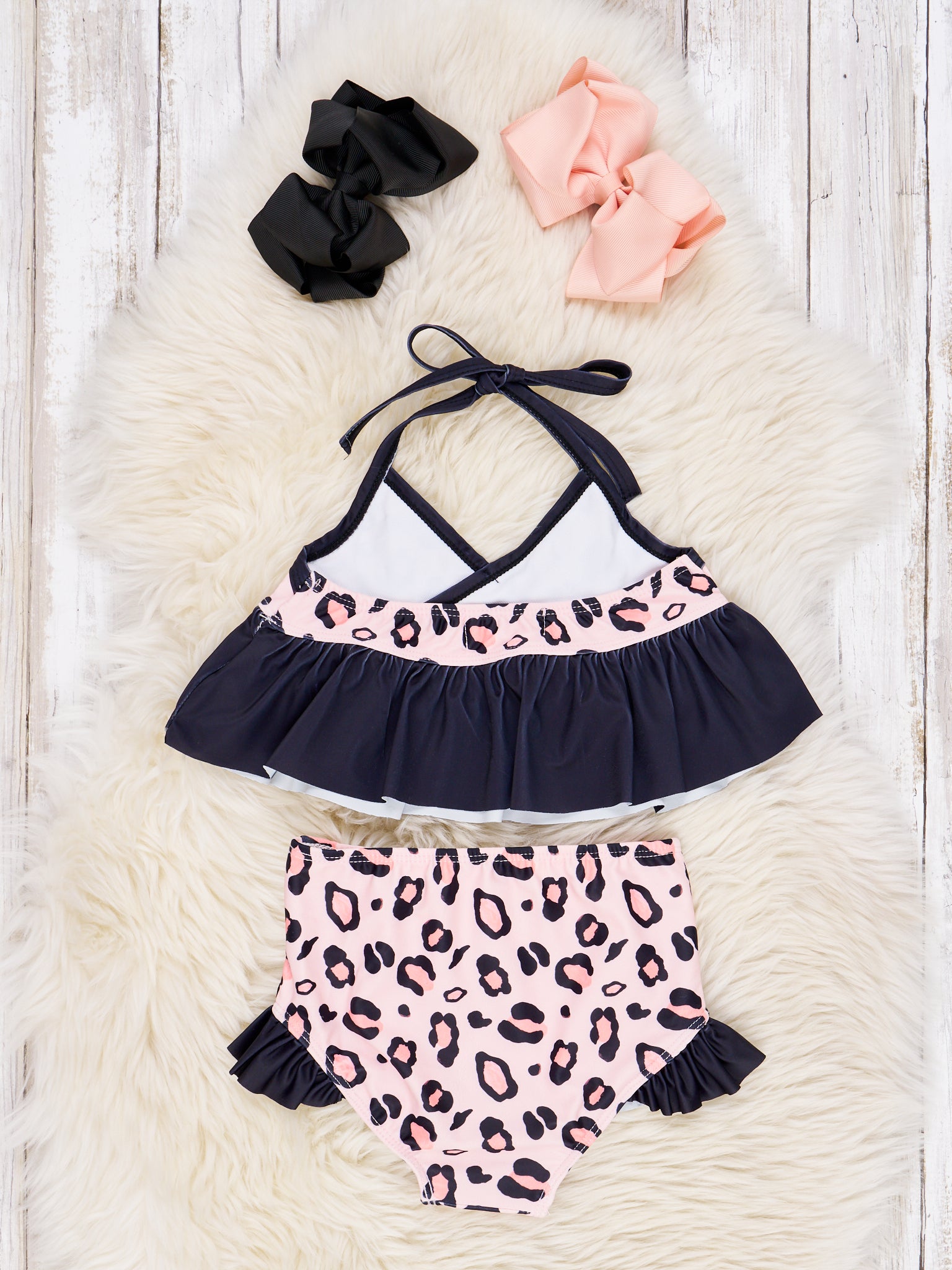 Let your kiddo make waves in this super-stylish Peach Leopard Ruffle Tie Swimsuit! Featuring a comfy elastic waistband and a tie top complete with ruffles, it's perfect for splashing around in the pool or at the beach. Paired with pretty pink floral bottoms, it's the must-have summer swimsuit for stylish kiddos!