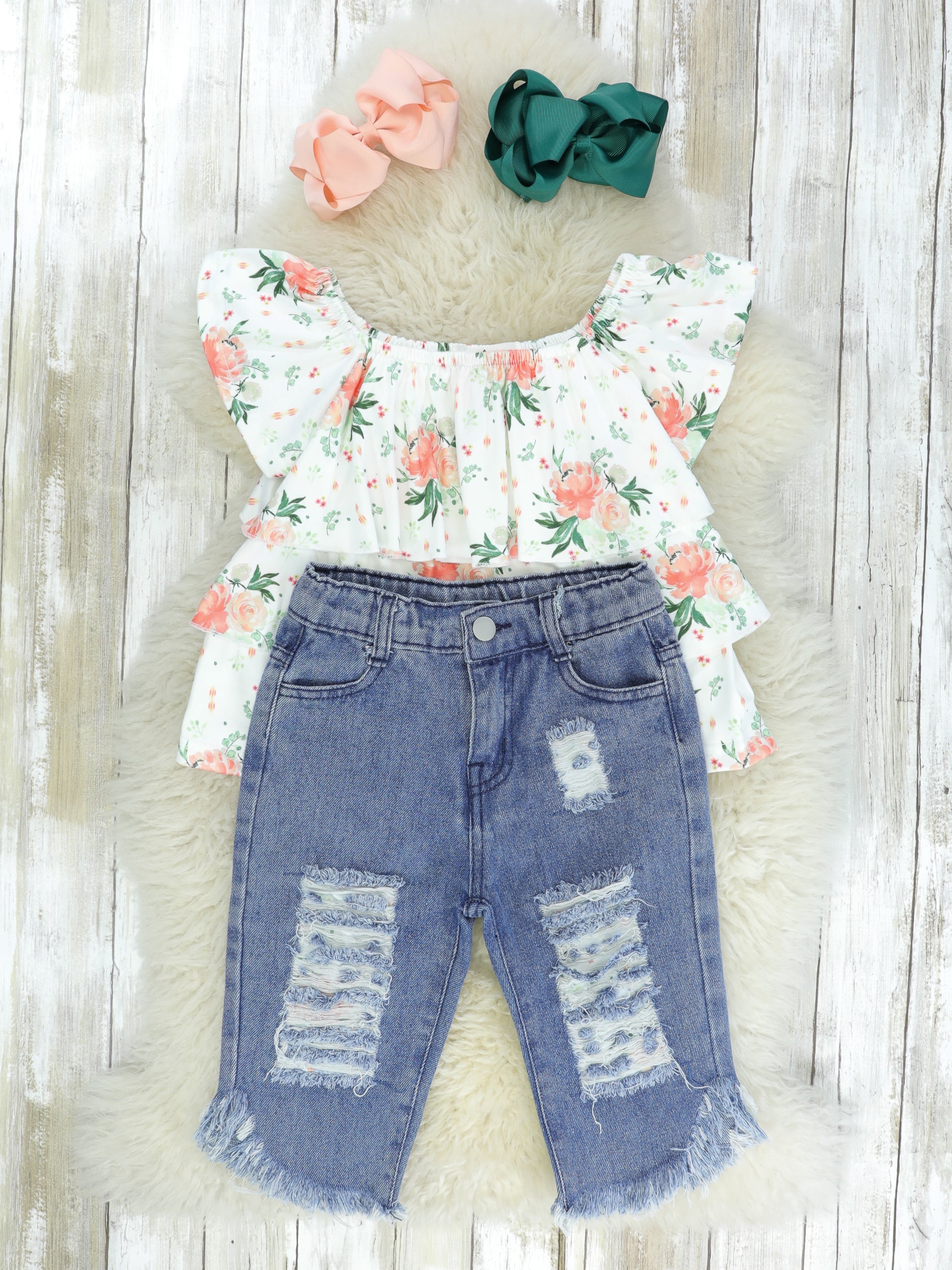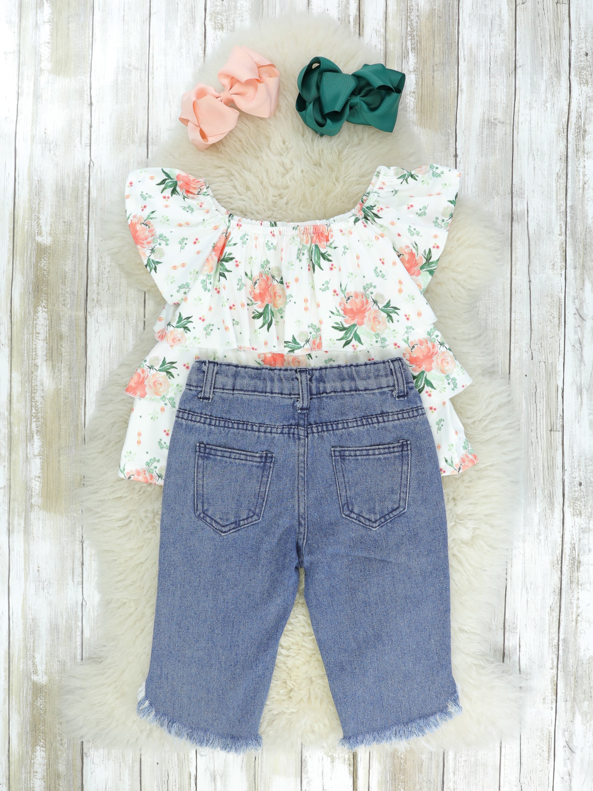 Peachy Tiered Ruffle Top & Distressed Denim Outfit