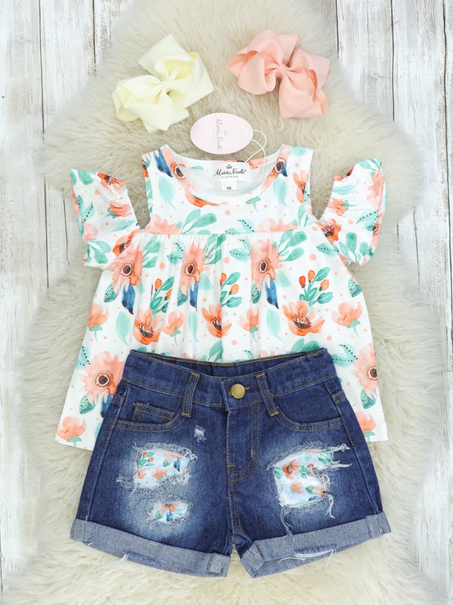 A little cold shoulder moment is exactly what the doctor ordered! We love this pink & green floral top and the matching distressed denim shorts!