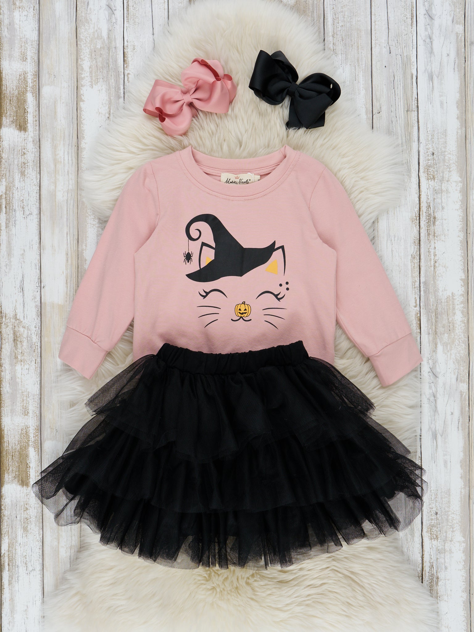 A sweet pink cat tulle set is exactly what your littles need! This outfit features a pink top with a black cat detail & black layered tulle skirt.