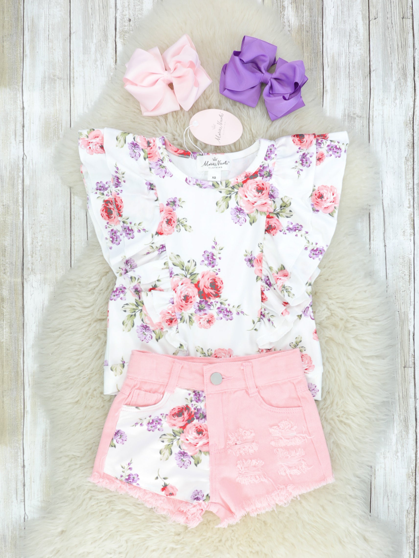 Pink Floral Ruffle Top & Distressed Denim Shorts