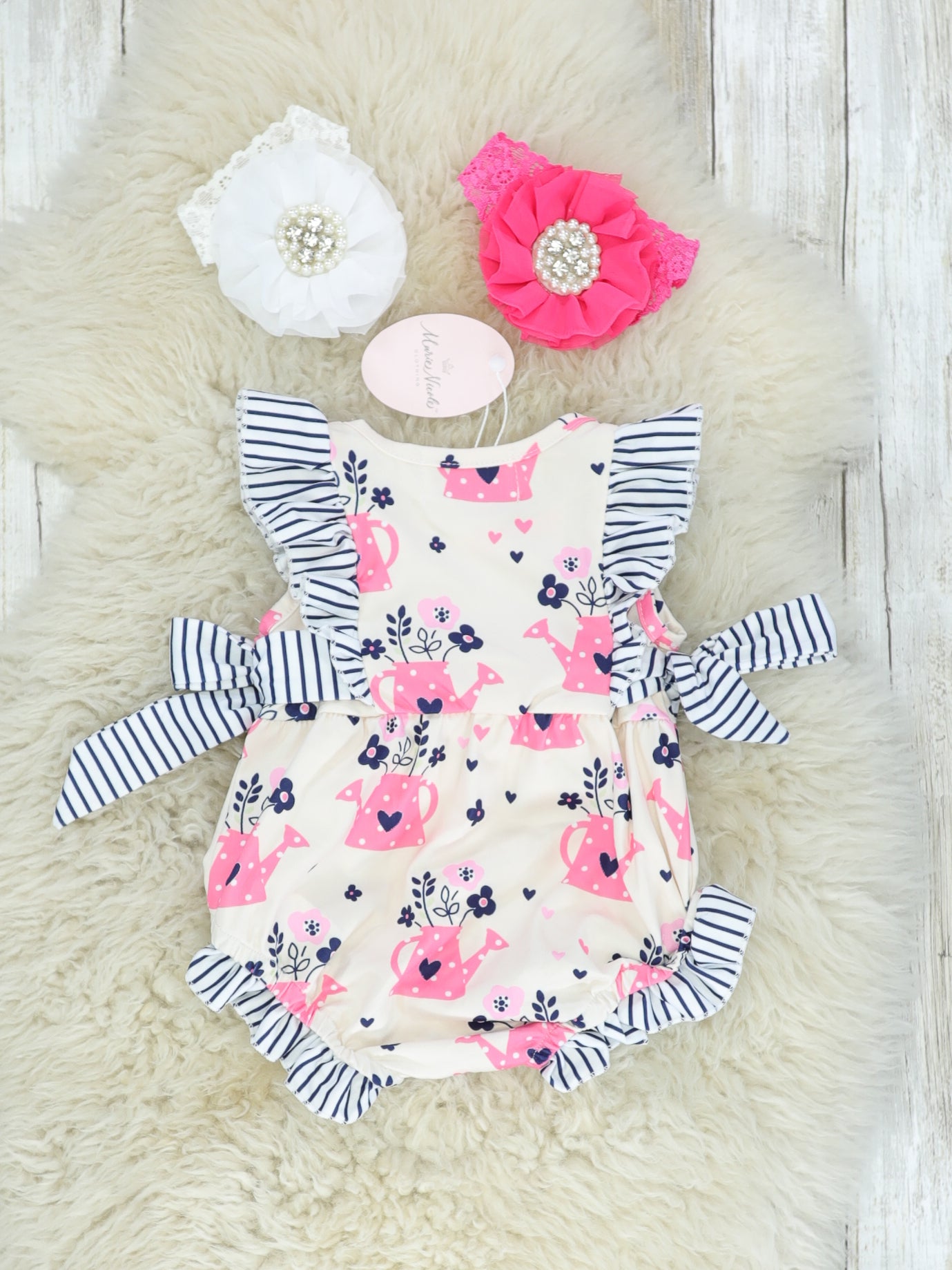 The garden is our happy place and what better outfit to wear then this adorable gardening sister set. Featuring a watering can and floral pattern and a ruffle trim and bow details black in white stripes.