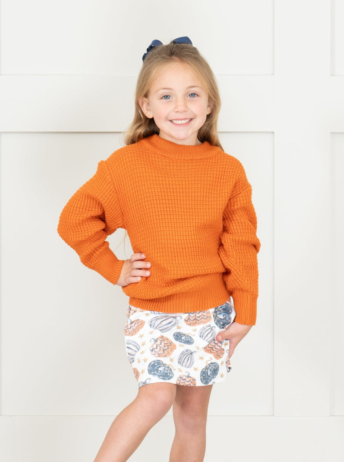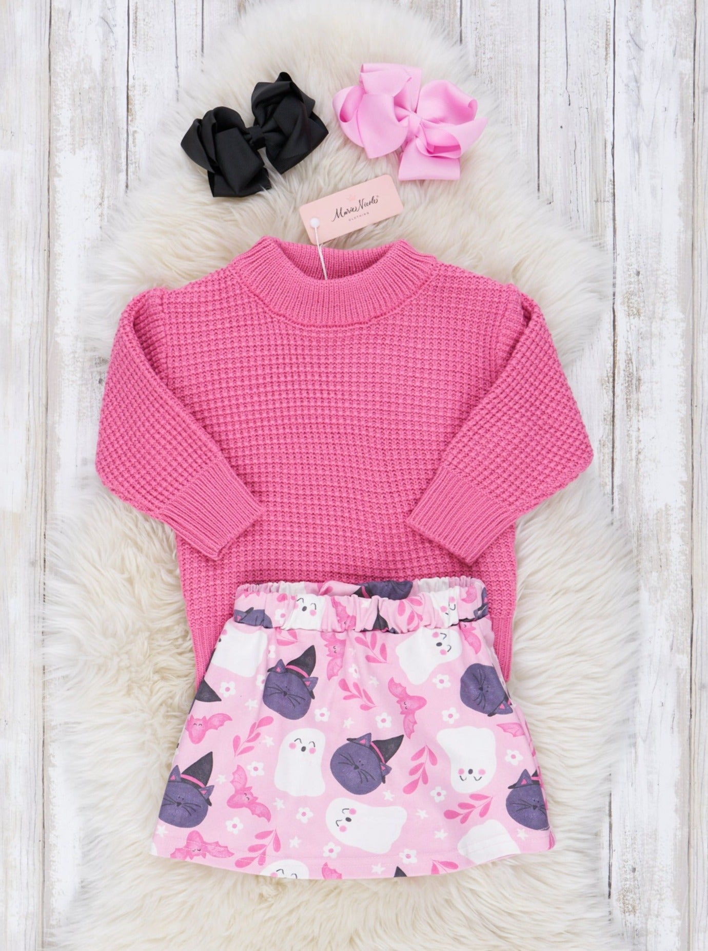 This season's must-have look, this outfit features a pink waffle knit sweater with a mock neck and delightfully frightening Halloween design elastic band skirt.