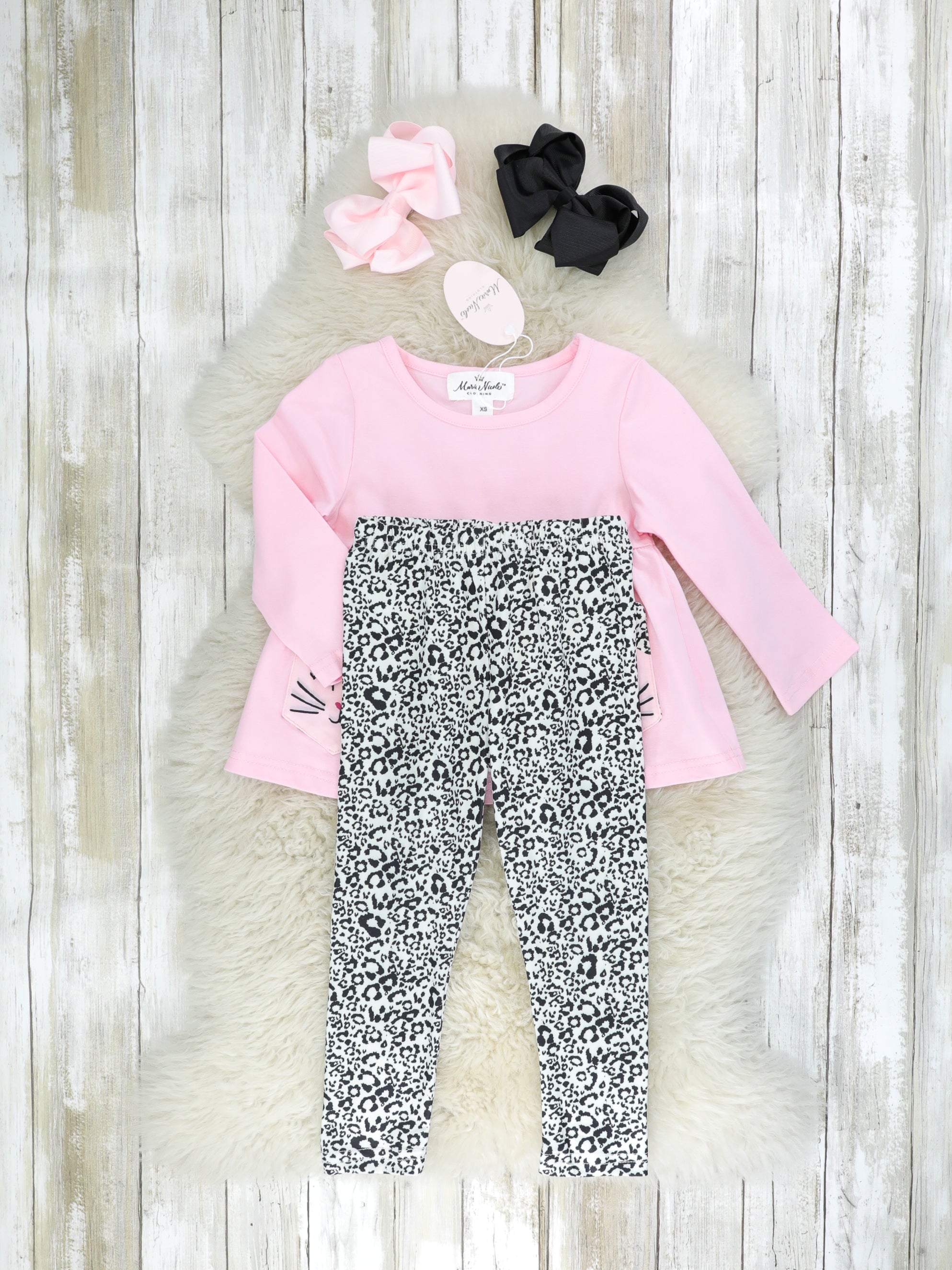 This adorable outfit is purr-fect! This outfit features a pink peplum top with leopard pockets & white leopard pants with an elastic waistband.