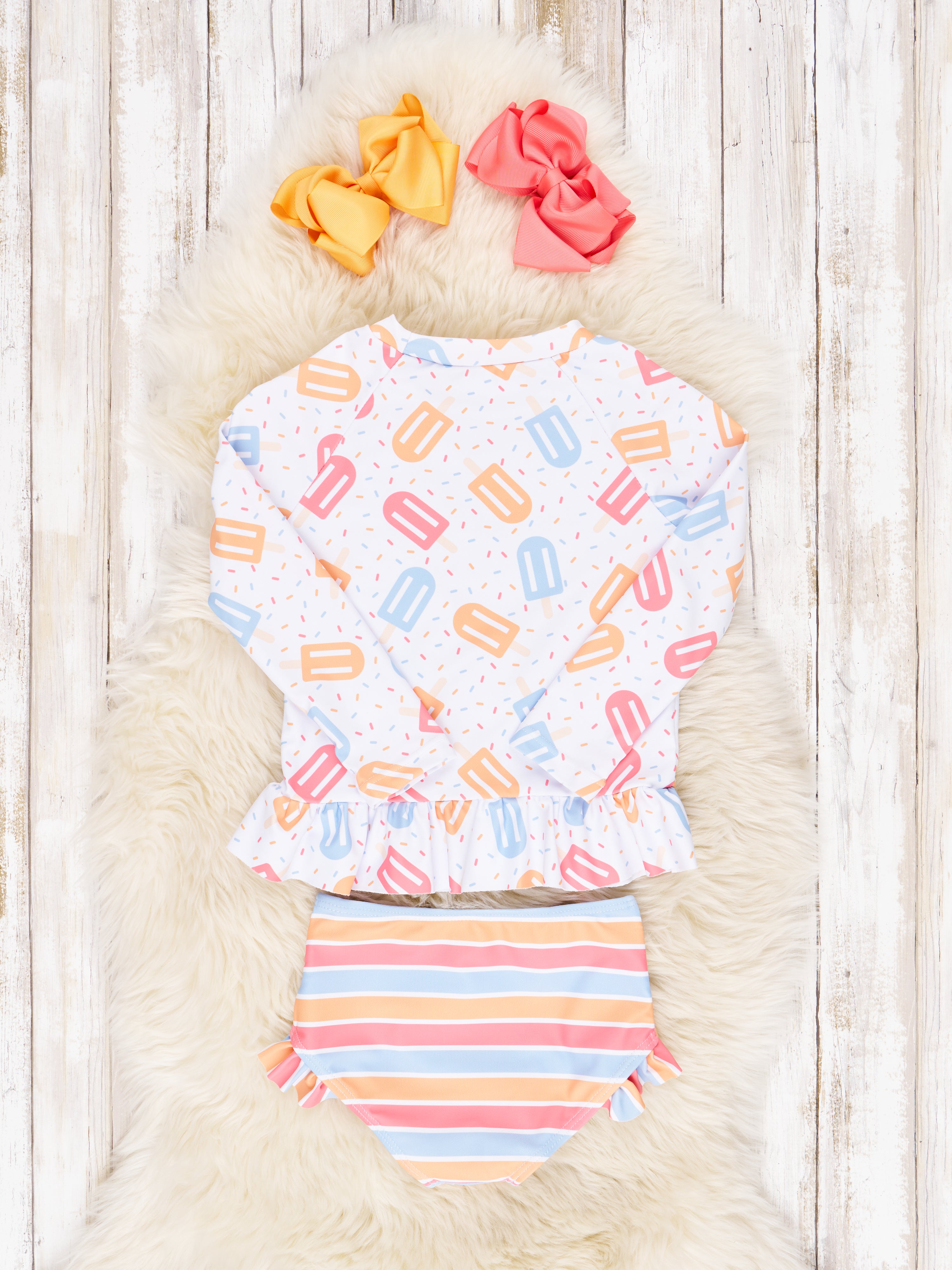 This swell Popsicle Rash Guard Ruffle Swimsuit will have your kiddo swimming in style this summer! The popsicle print top and striped bottoms are the perfect combinations of sweet and sassy, while the ruffles add a charming touch. Kids and parents will love this rad setup!