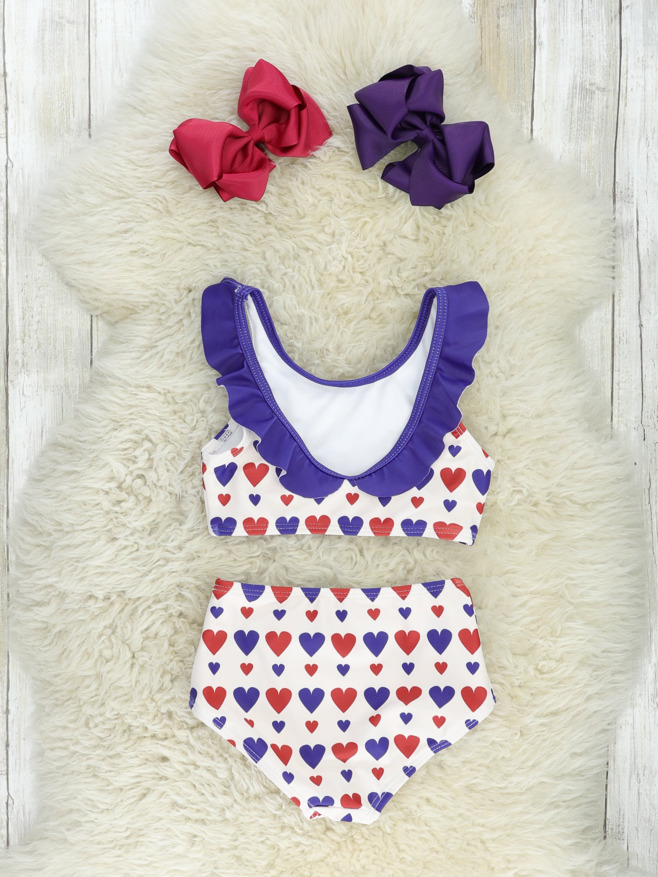 Frolick thru the waves in matching sister swimsuits! This stylish Red & Navy Heart Two-Piece features beach-ready ruffles and cute, cuddly hearts, making any sibling duo look super sweet. So grab your BFF and let the good times roll!