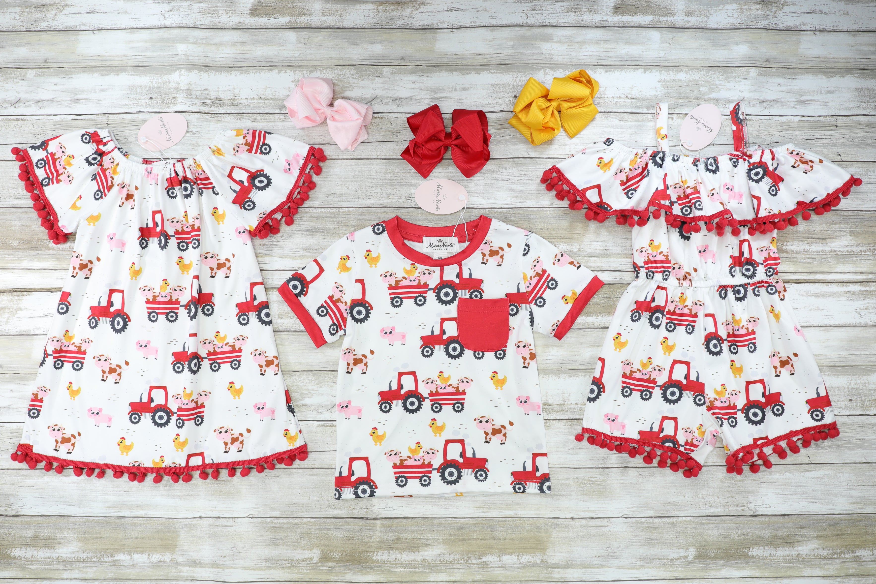 Hey y'all! Time to hop on the big red tractor & shop this sibling set! This t-shirt features a functioning pocket, red trim, & a cute red farm tractor & animals print.