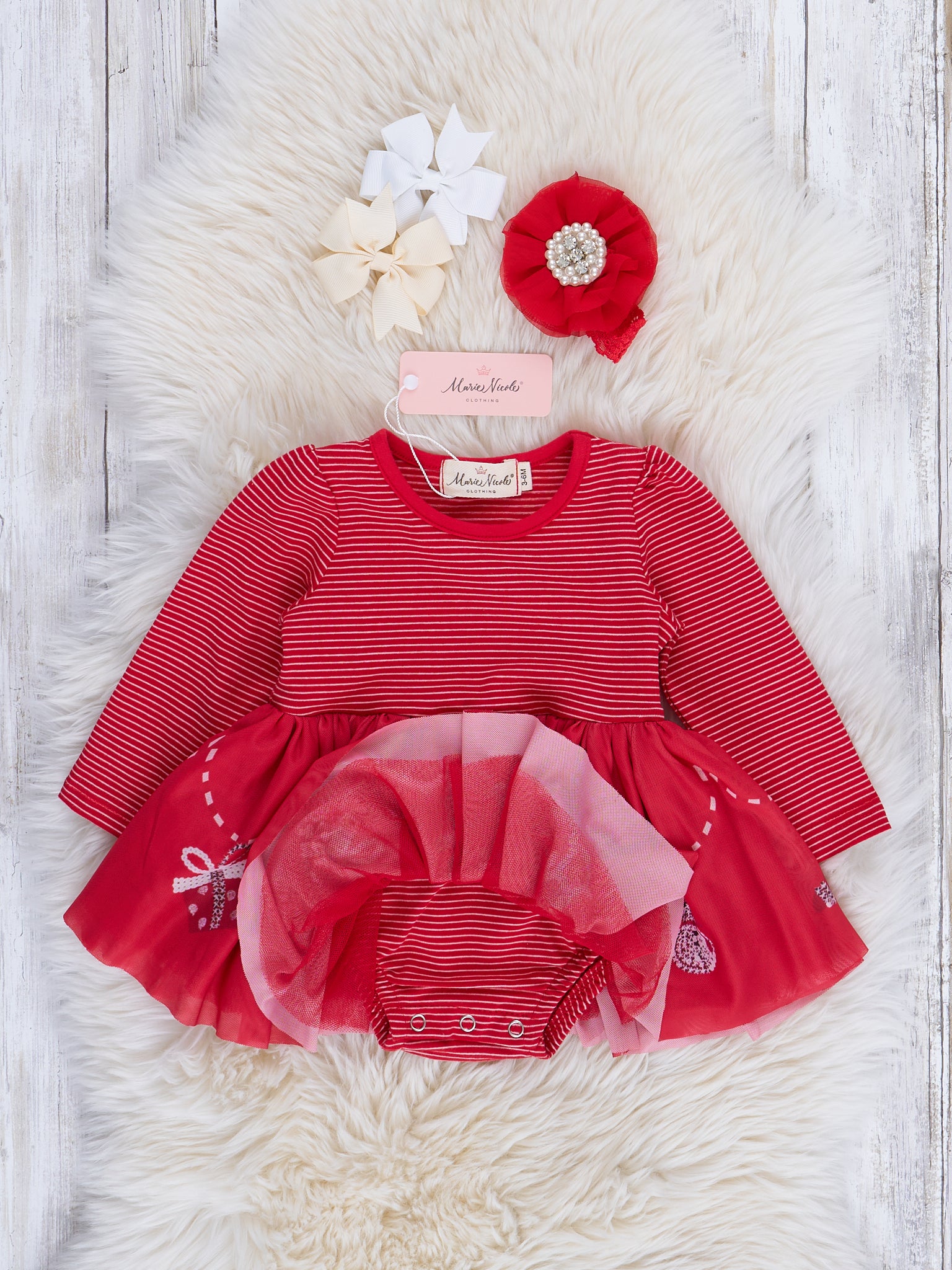Sparkle and jolly times abound in this sister set. Dash through the snow with this adorable romper that boasts a subtle striped bodice and full skirt adorned with rhinestone holiday designs.