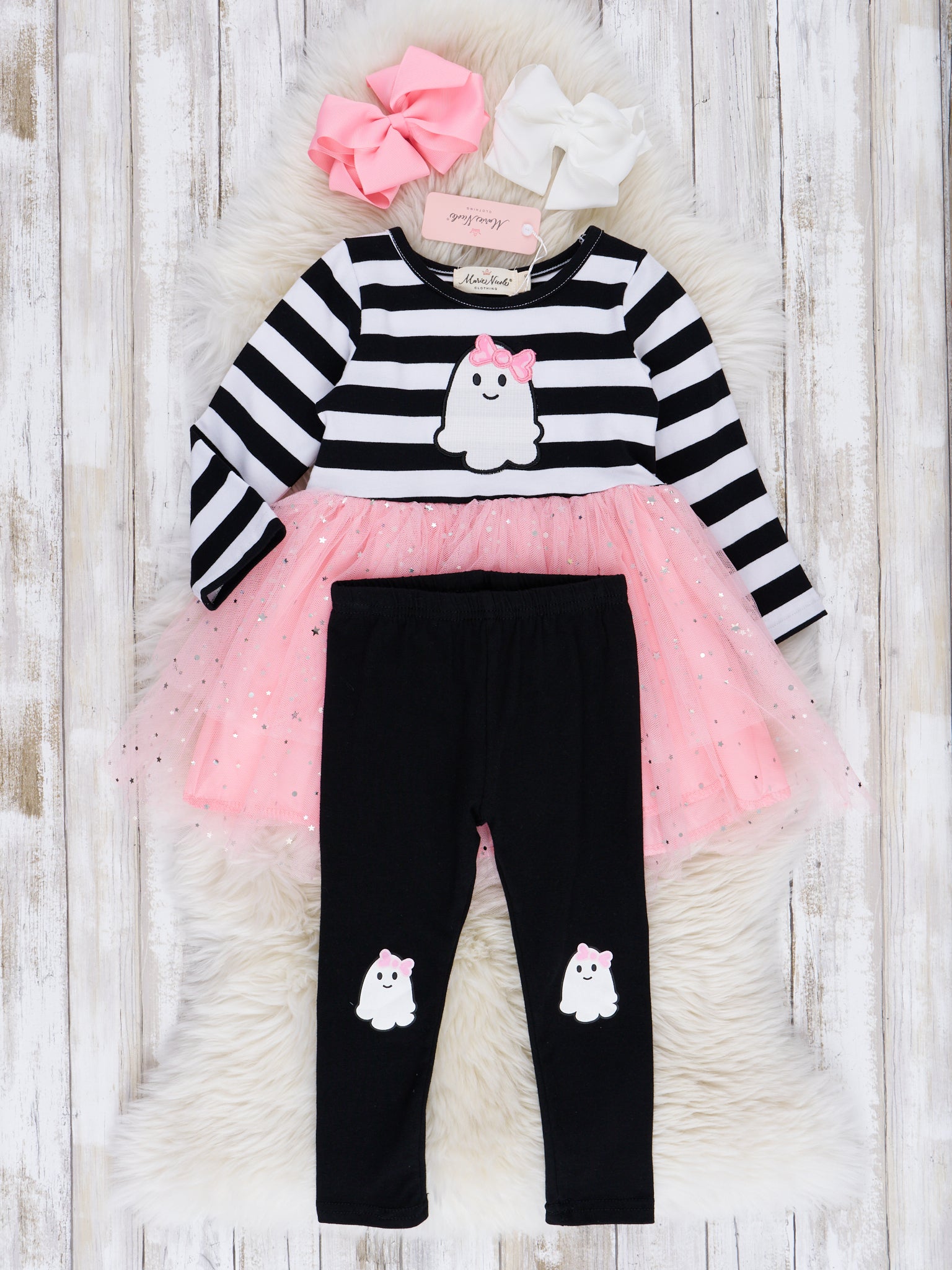 This "Boo"-tiful outfit will have your little sweetheart looking spooktacular! Get ready to get some ghostly glitters with this magical Sparkly Pink Tulle Sweet Ghost Outfit. The perfect mix of spunky and sweet, it's a fab combination of a black and white striped top with pink tulle peplum and black bottoms with ghost patches on the knees. Who wouldn't be absolutely "ghastly" with this?