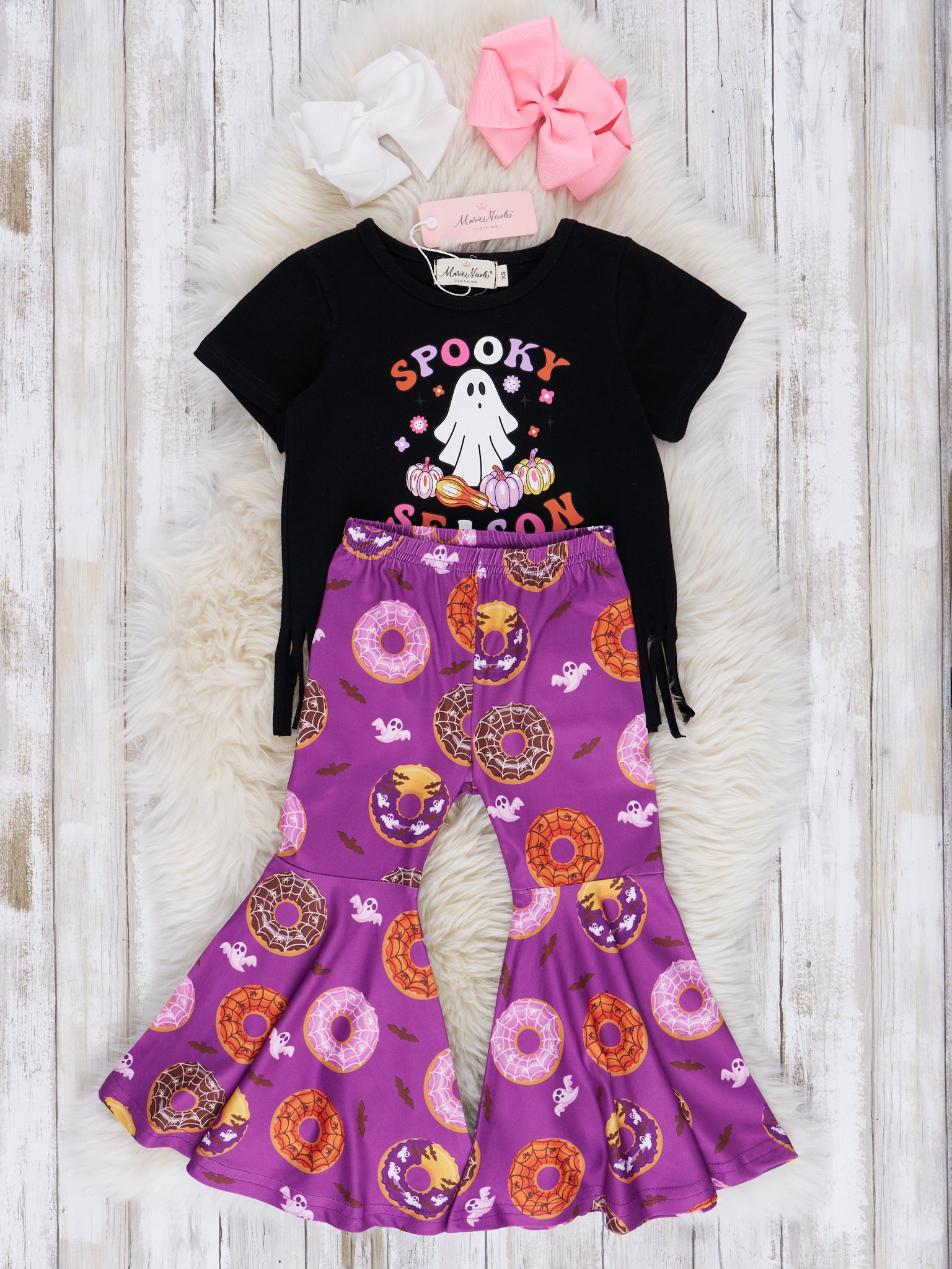 Let your little one get into the spooky season with this oh-so-sweet fringe bell bottom outfit! The short-sleeved top has a fringe hem and features a ghost and pumpkins, while the elastic waist pants have donut details that will bring plenty of smiles. Perfect for little ones who want to be sweet and spooky!