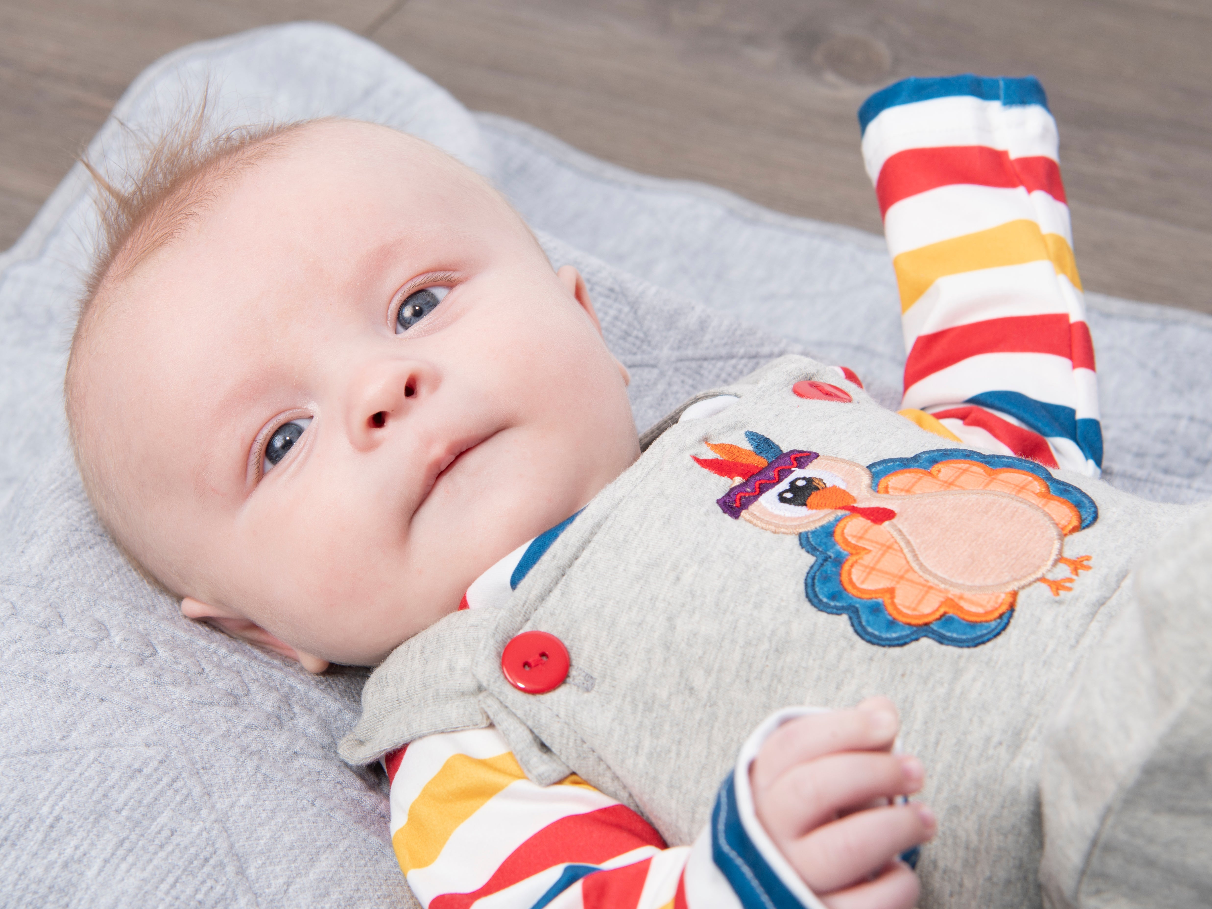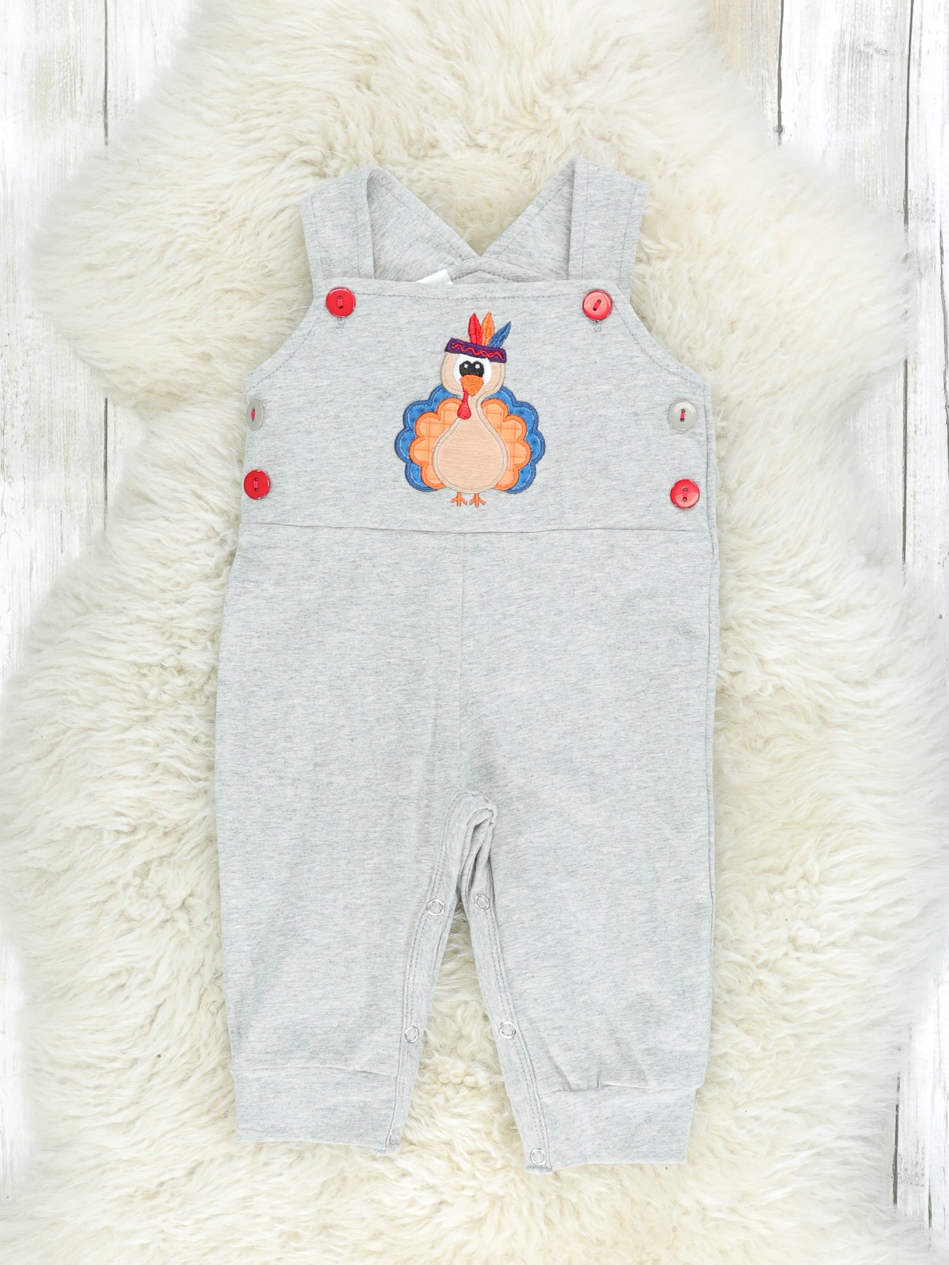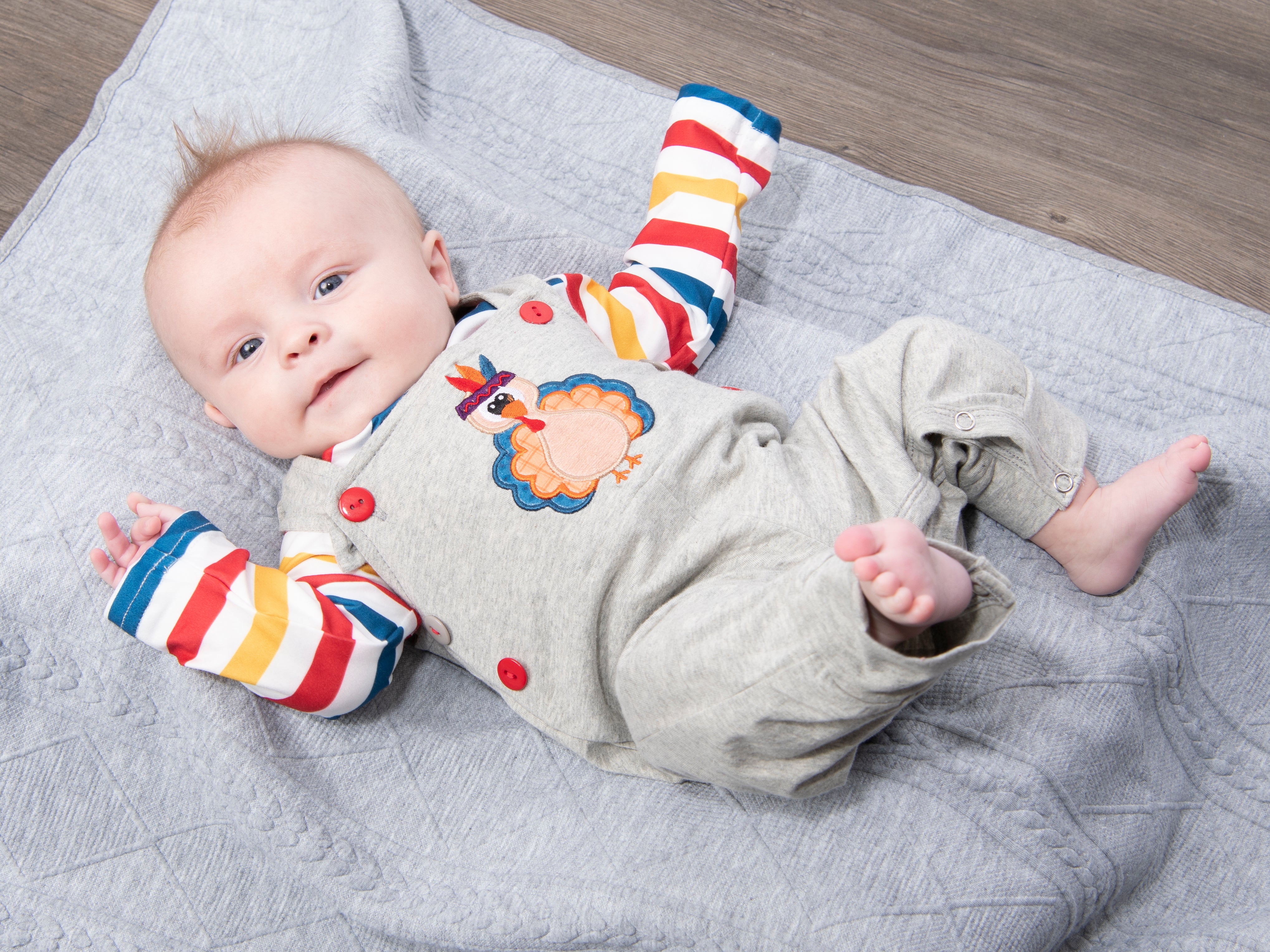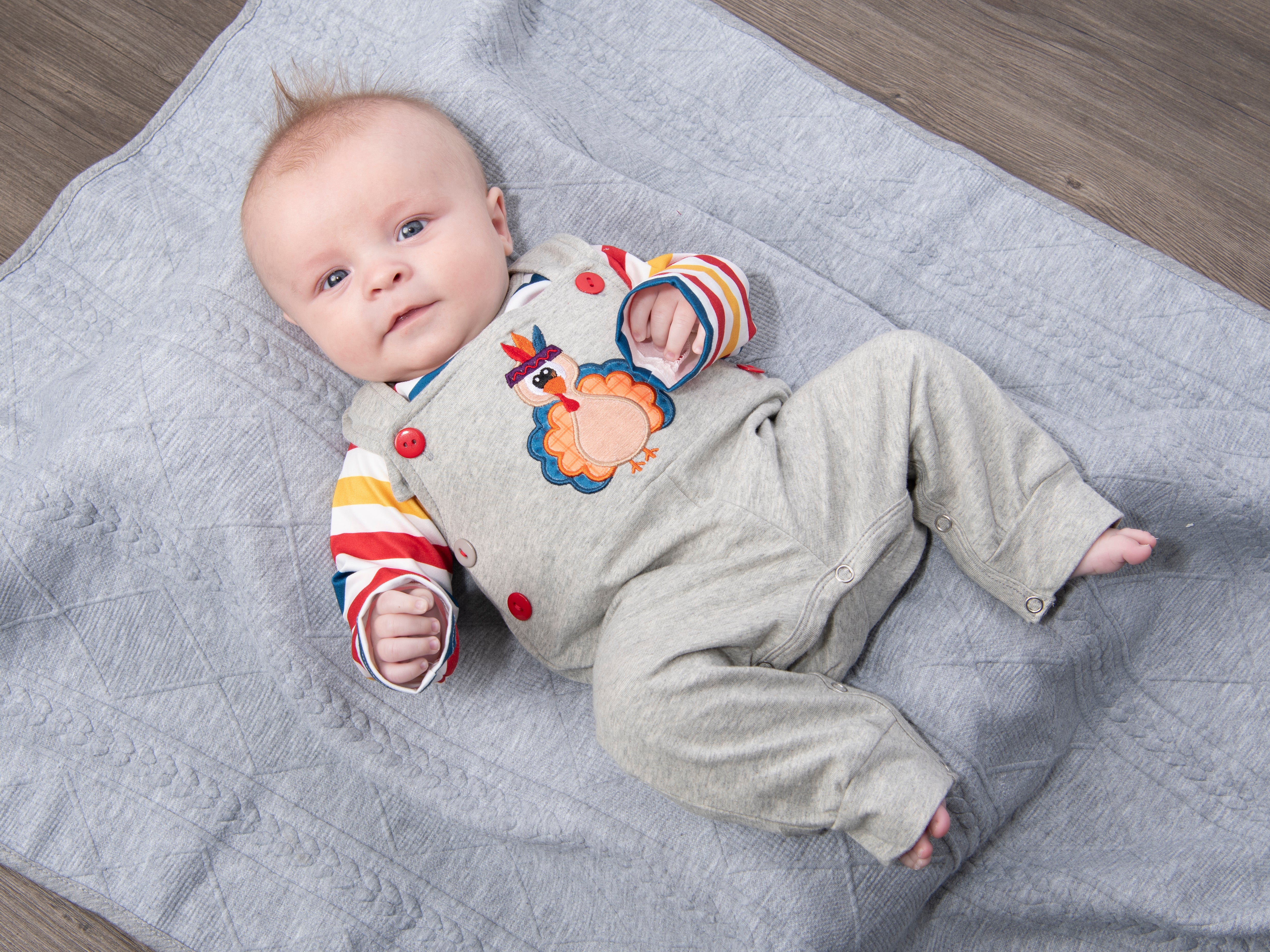 This sweet set is the tur-KEY to our hearts! This outfit features the softest striped onesie & a grey overall set with adjustable buttons and the sweetest turkey appliqué.
